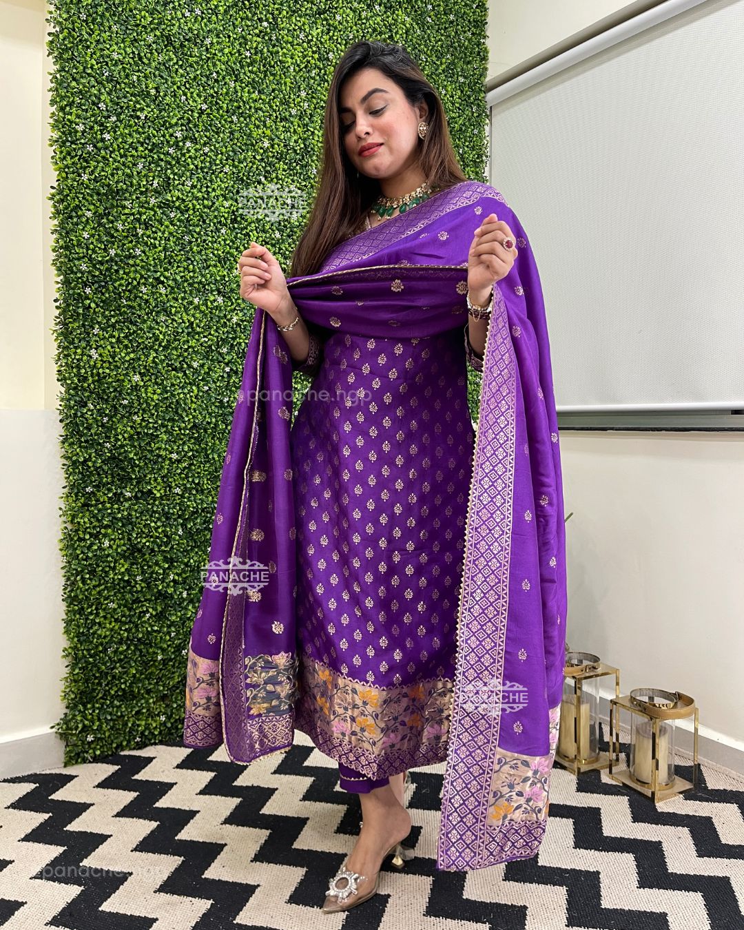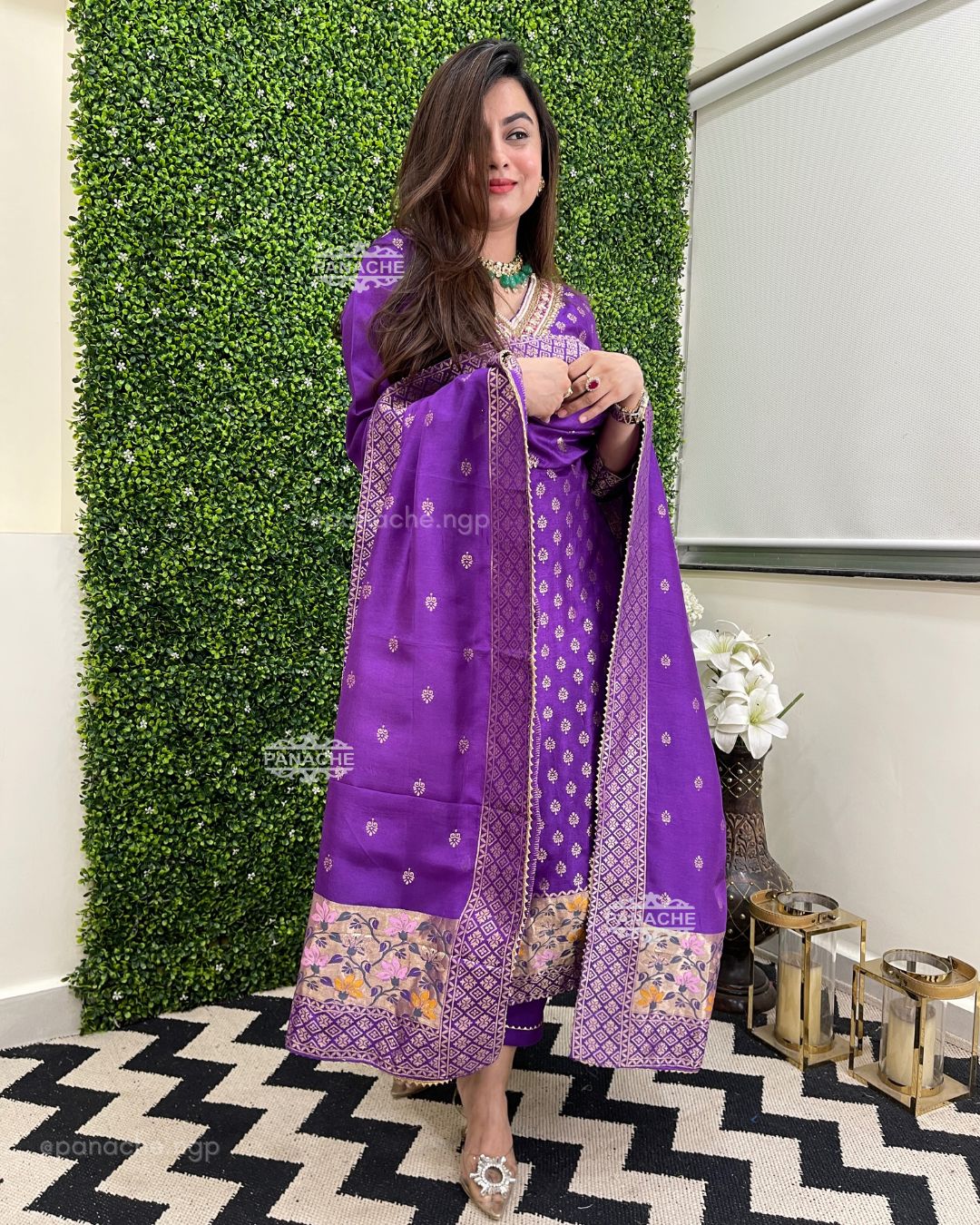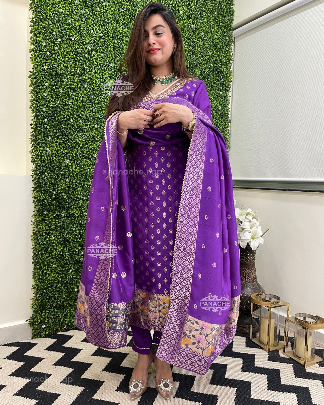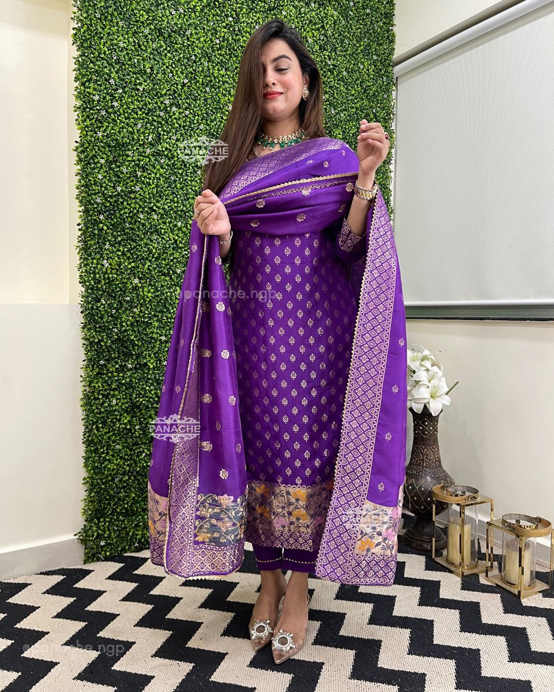 🟣 Jaal cut pipe and resham embroidery on neckline with contrast threads in dupatta