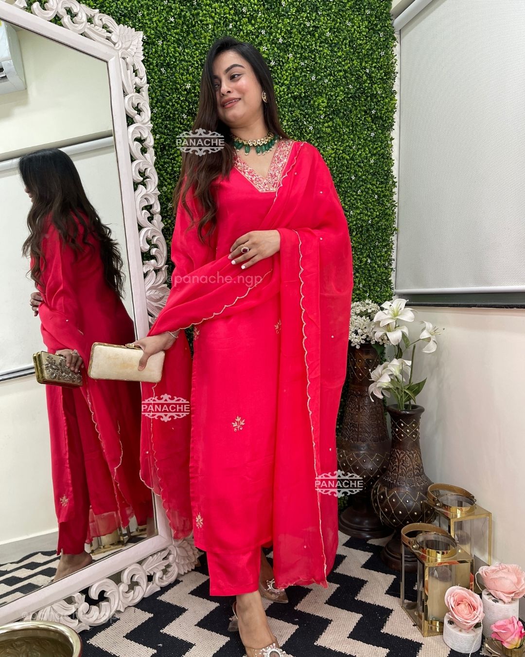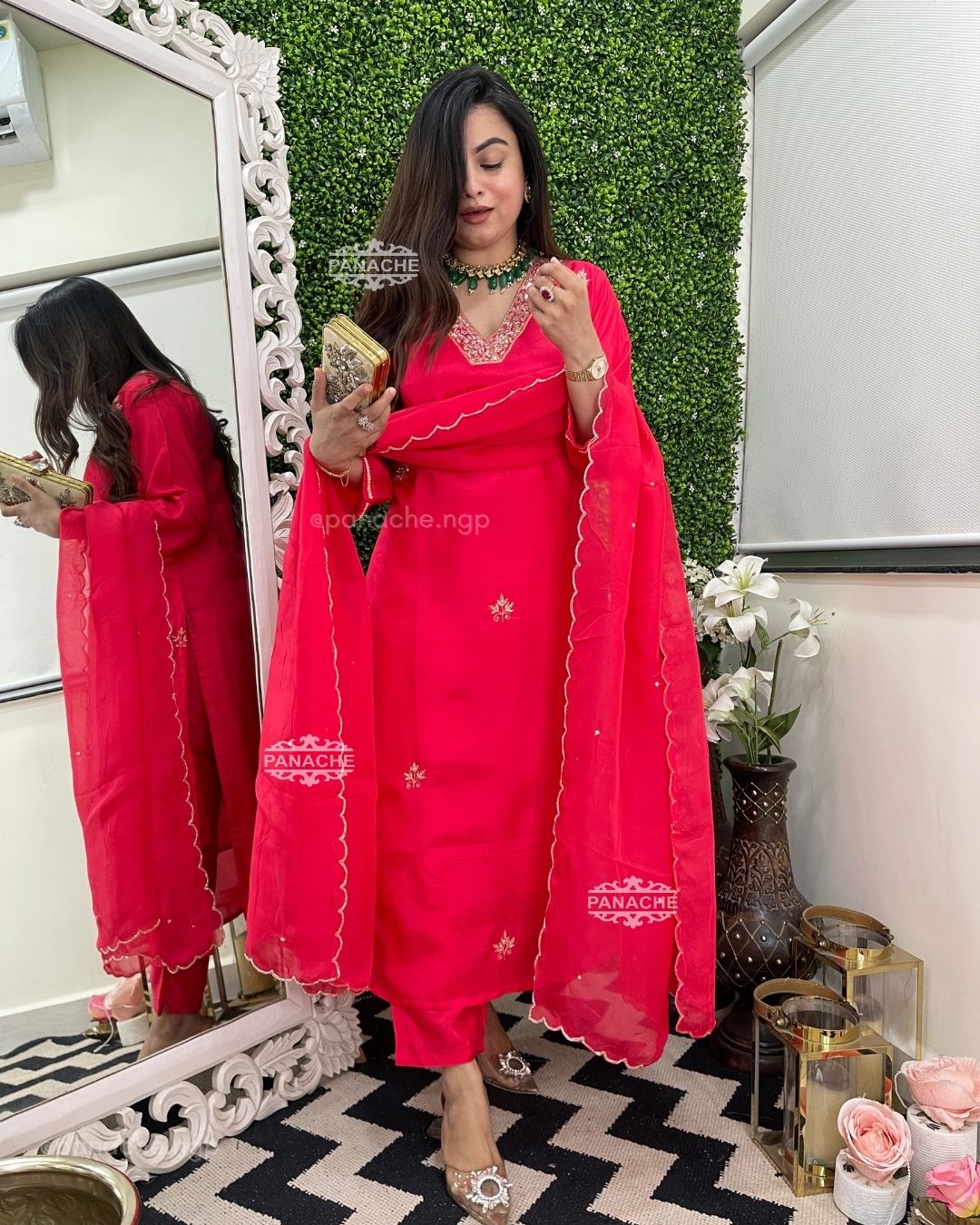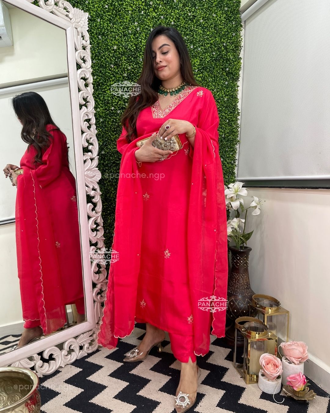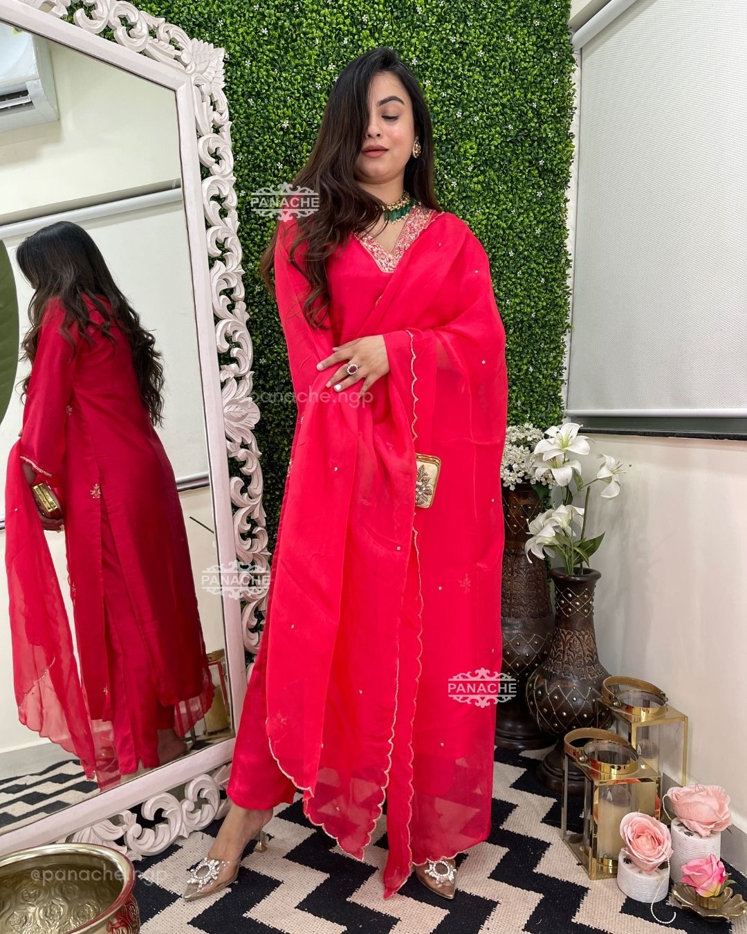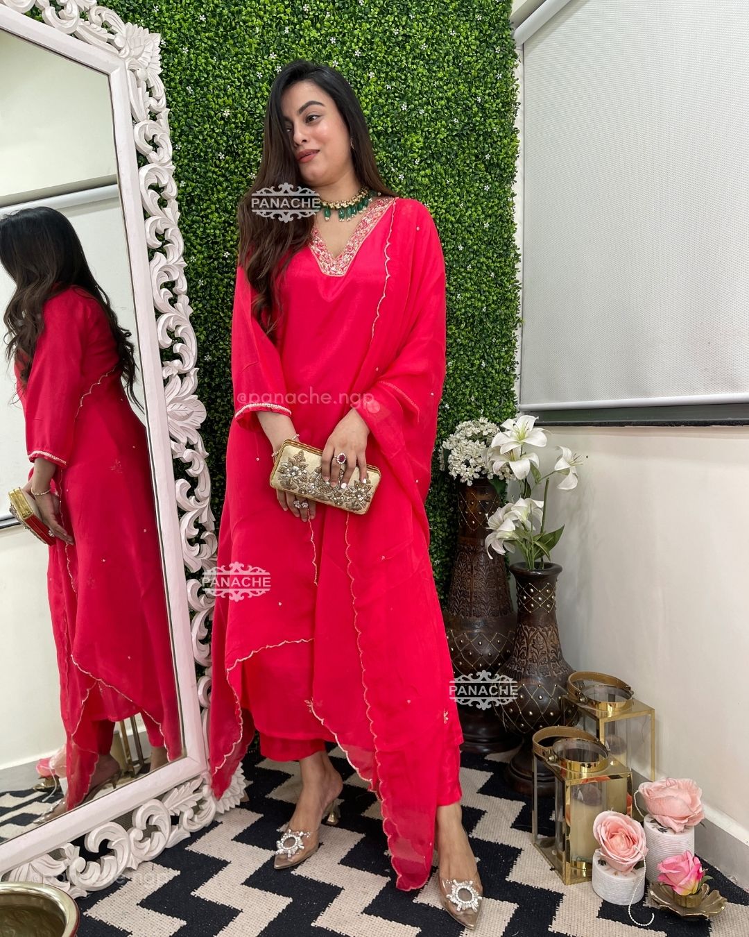 🟣 The most delicate handwork neckline with beautiful buttas on kurta and a scalloped dupatta with plain pants