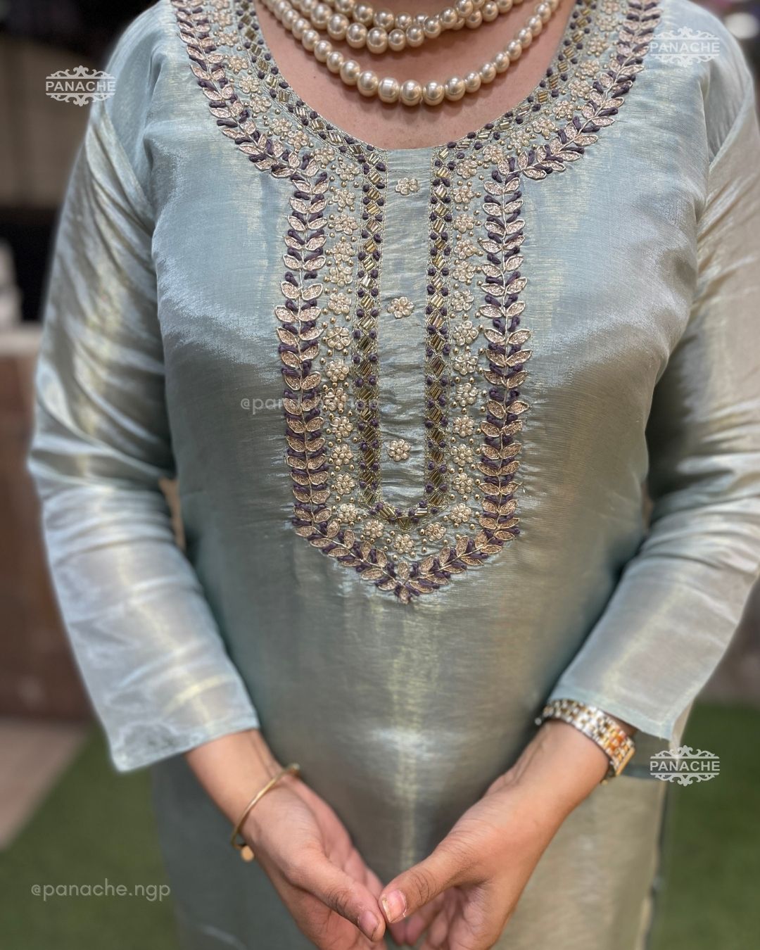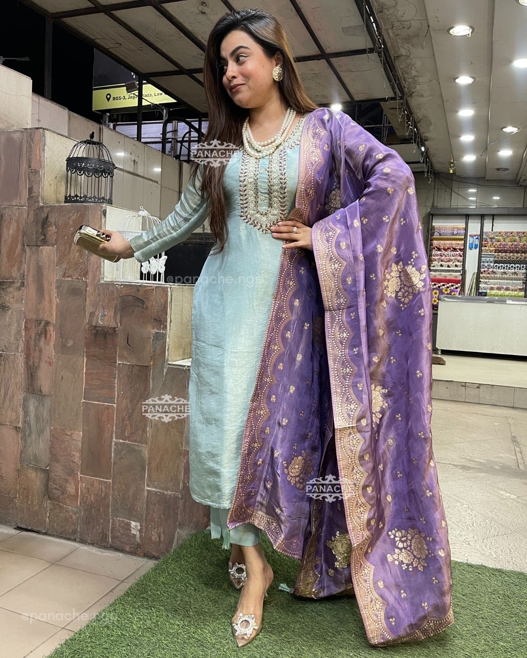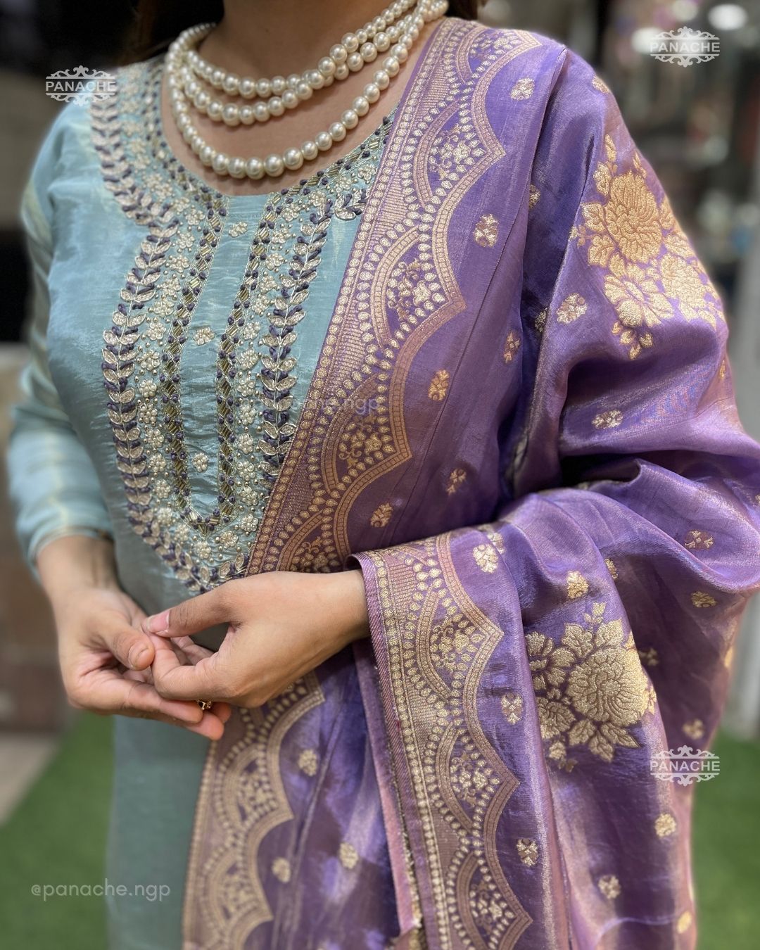 🟣 A fresh combination in tissue Orgenza set with Moti zardoz neckline and wooven Banarasi dupatta all in tissue Orgenza, contrast tassels on dupatta
