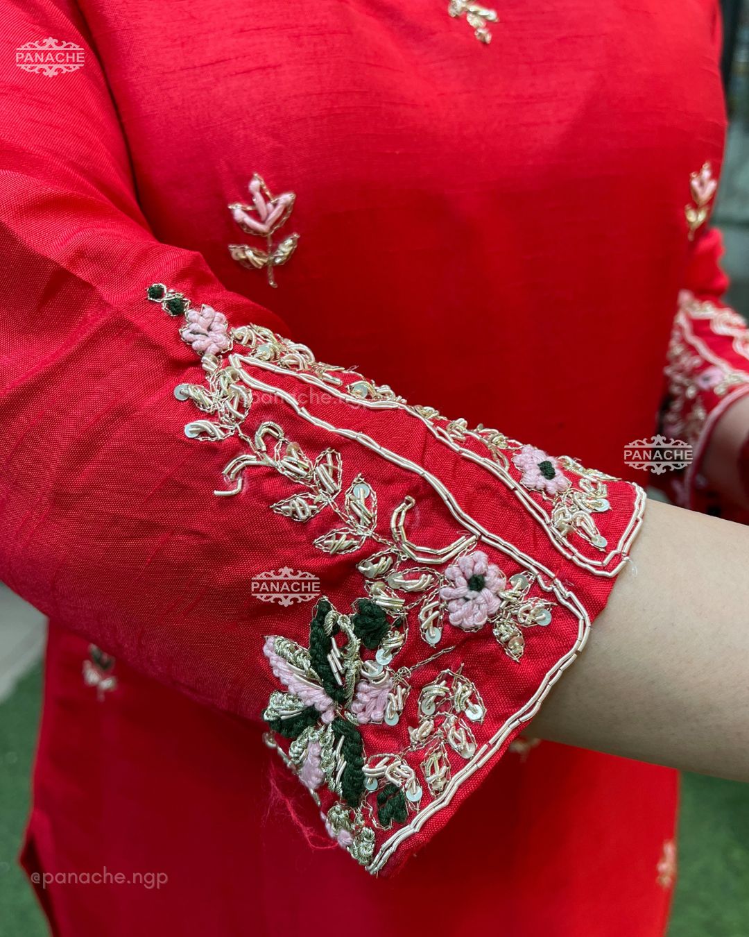 🟣 Aesthetic & delicate pure zardoz cut pipe frenchknot embroidery on neckline of kurta daman and sleeves with small buttas on kurta