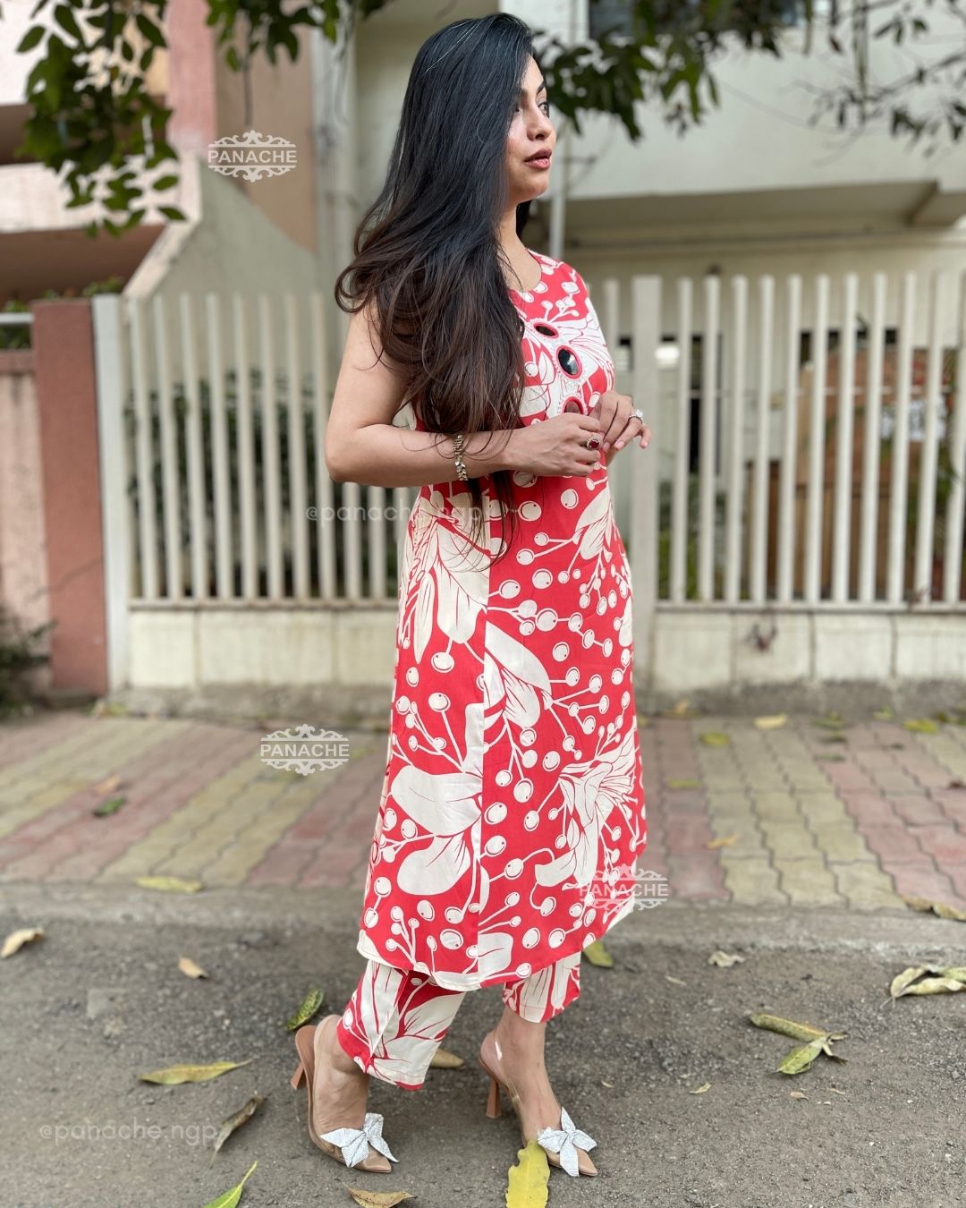 🟣 Real mirror on kurta with one side pocket and printed pants