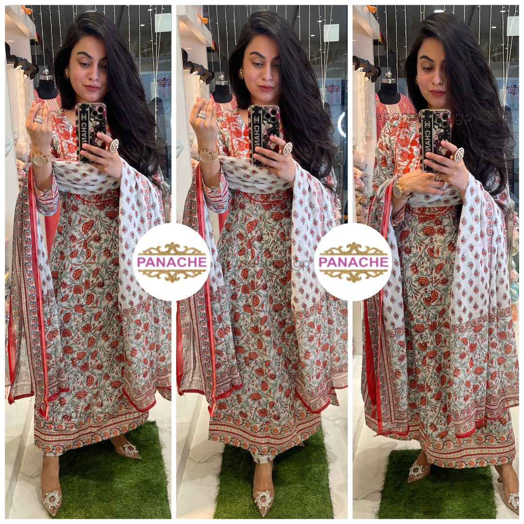 🟣 Details - machine embroidery on neckline with beautiful and attractive flower print all over the anarakli and pants teamed with a mul printed dupatta