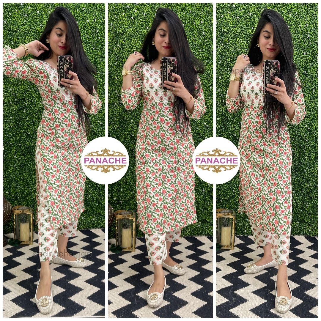 🟣 Floral printed kurta with applique on kurta yolk and printed pants sets the perfect summer vibes