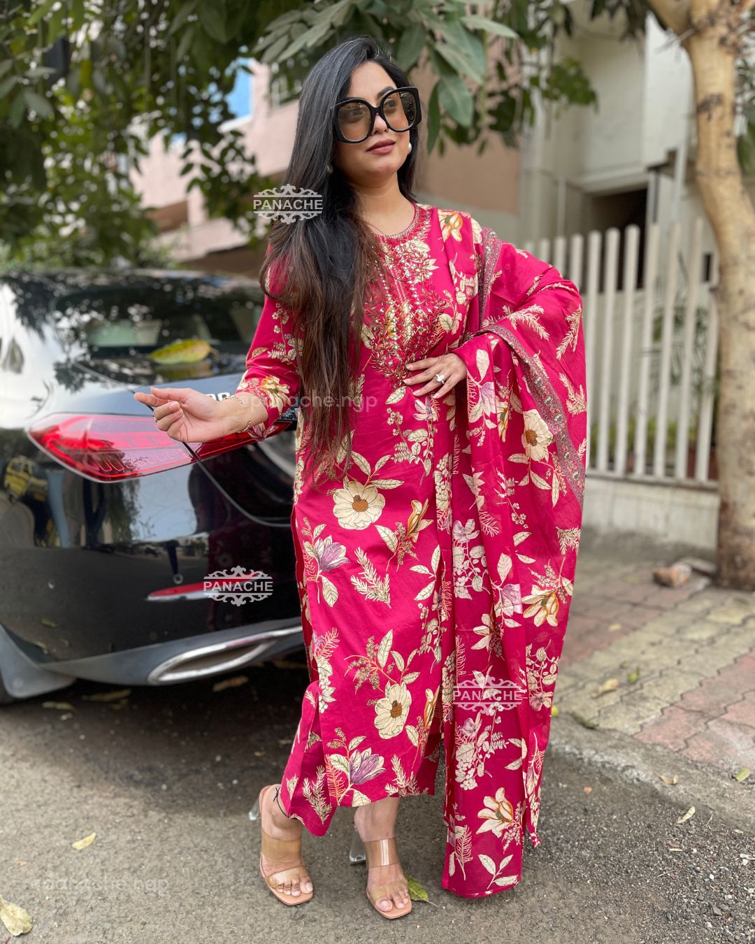 🟣 Embroidered neckline with a attractive print