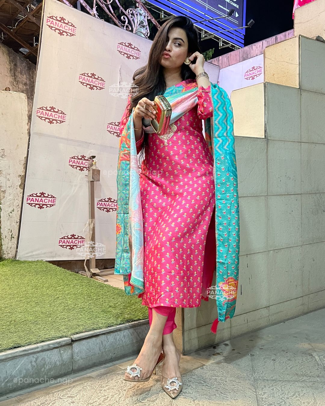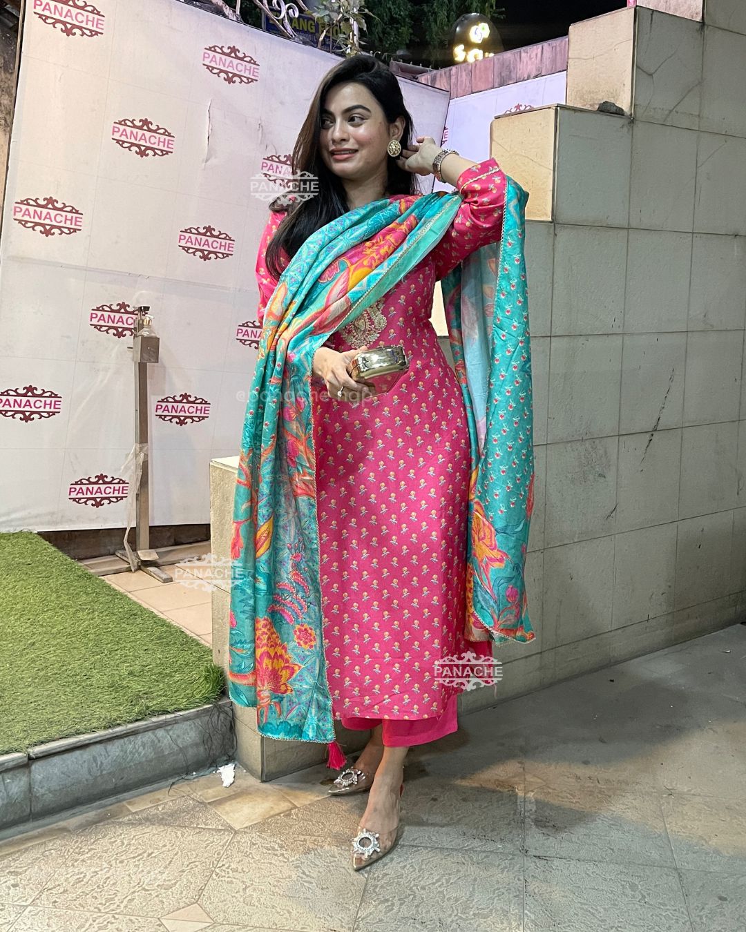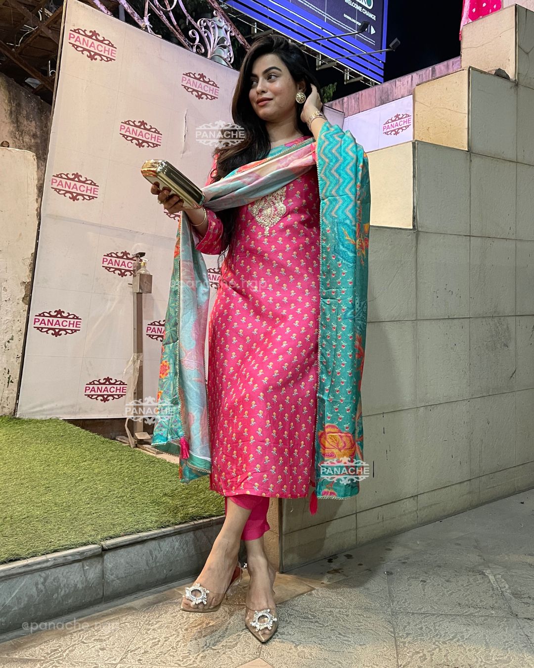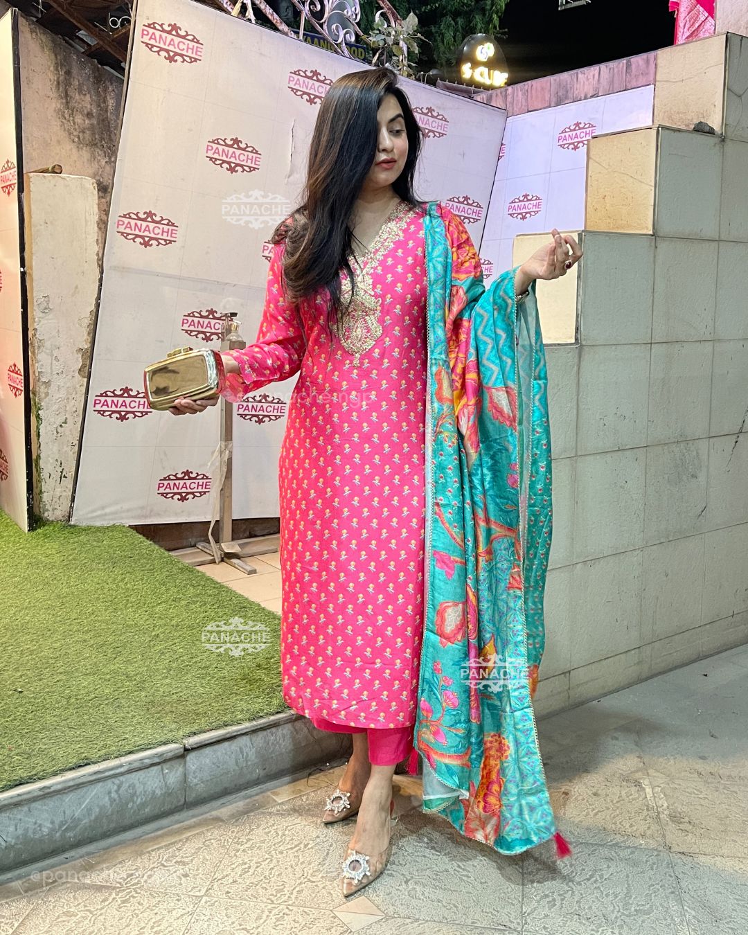 🟣 A lethal combination of pink n shades of green , printed kurta with work on neckline and floral linen dupatta with plain pants and tassels on all 4 sides