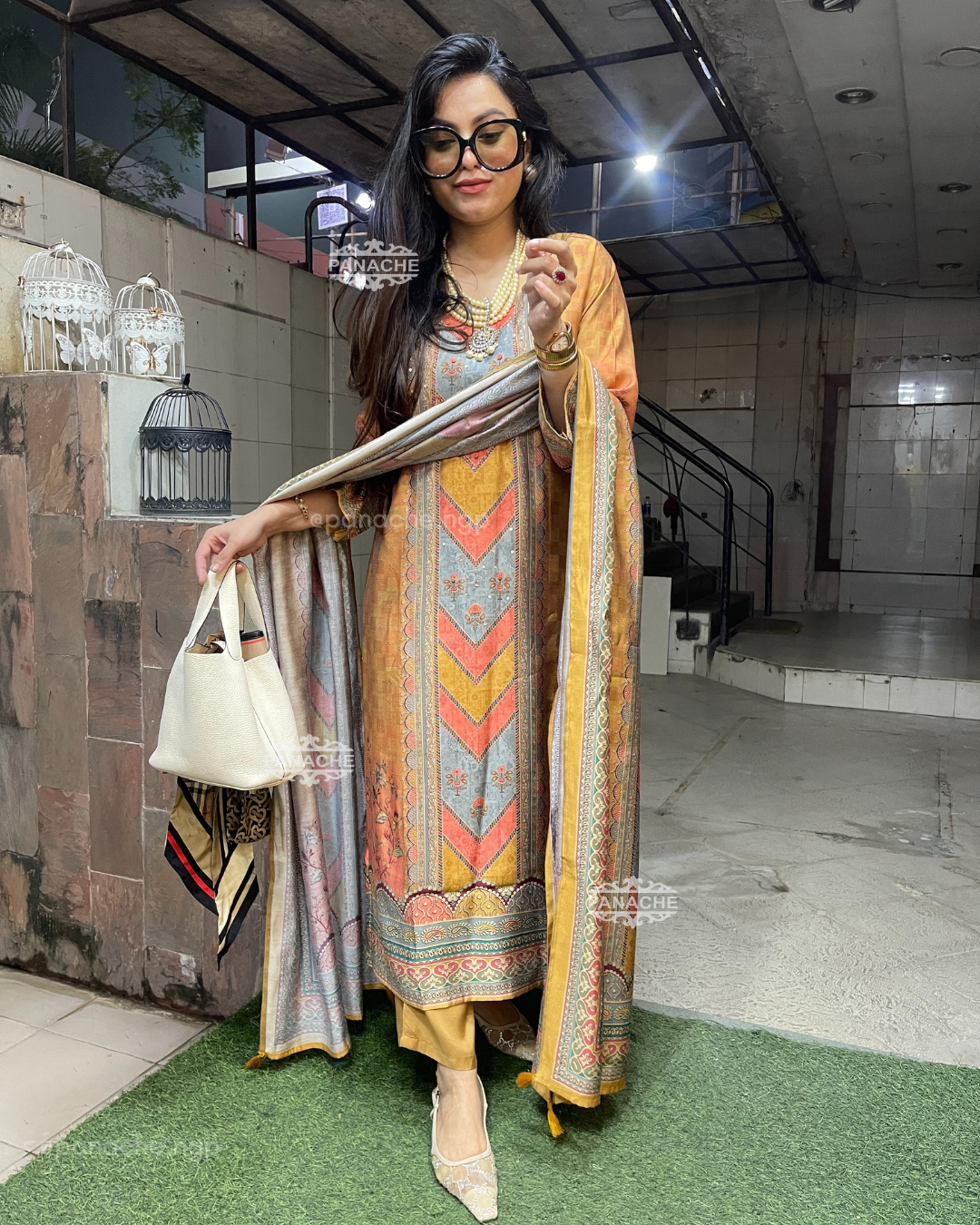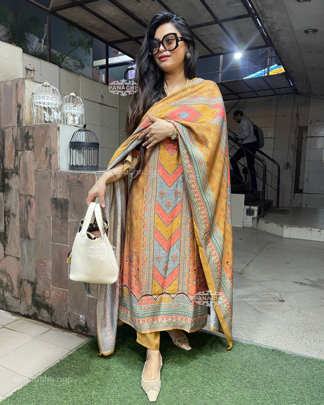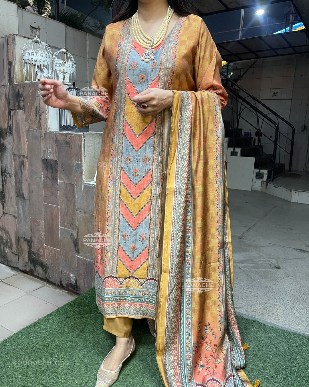 🟣 A semiformal suit with hand work highlights in front and look that resembles a pashmina suit !