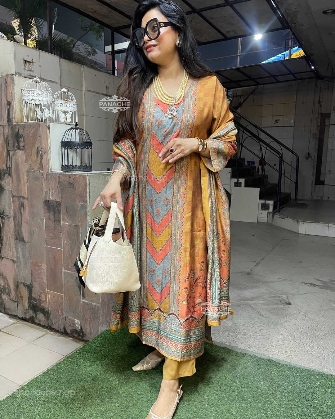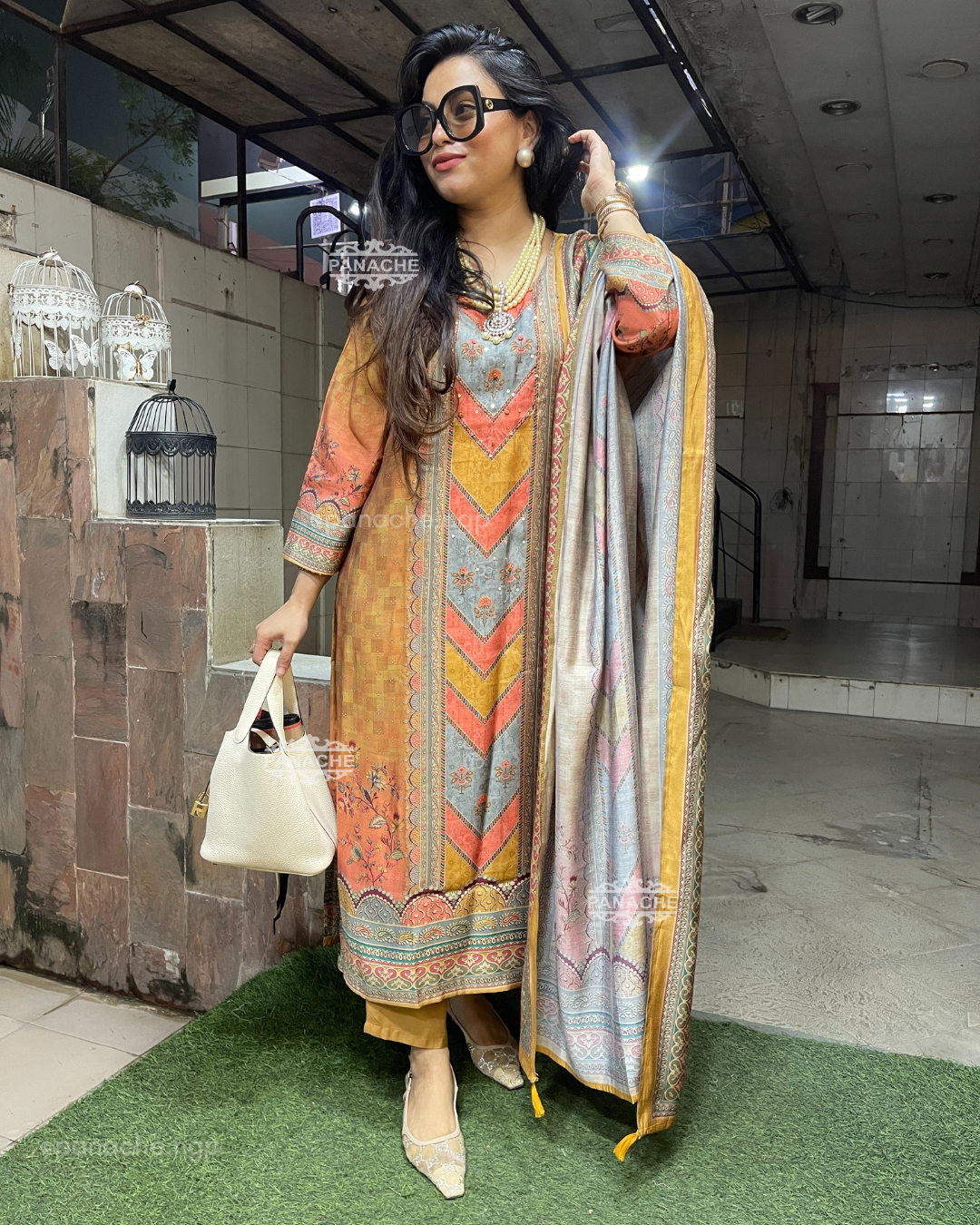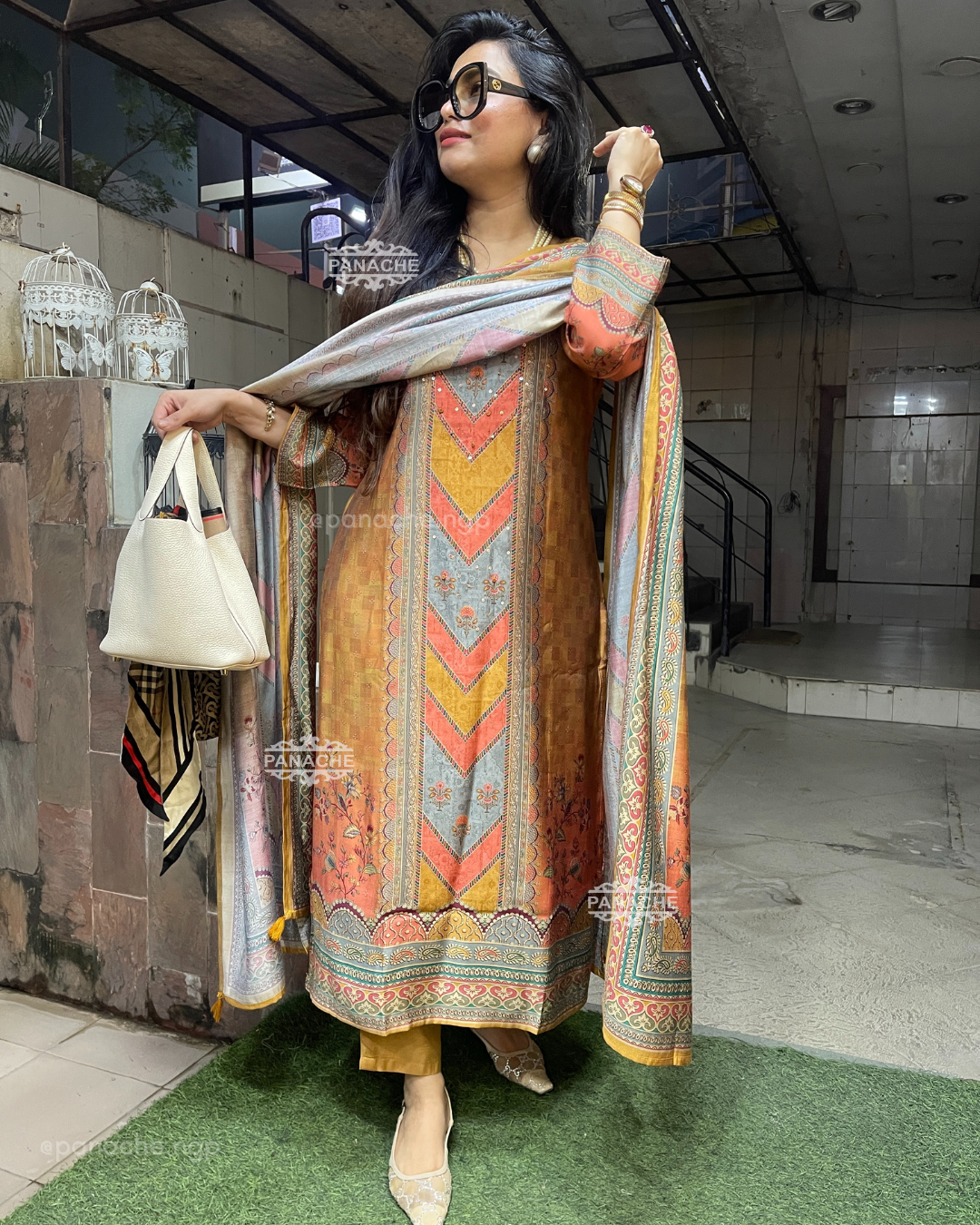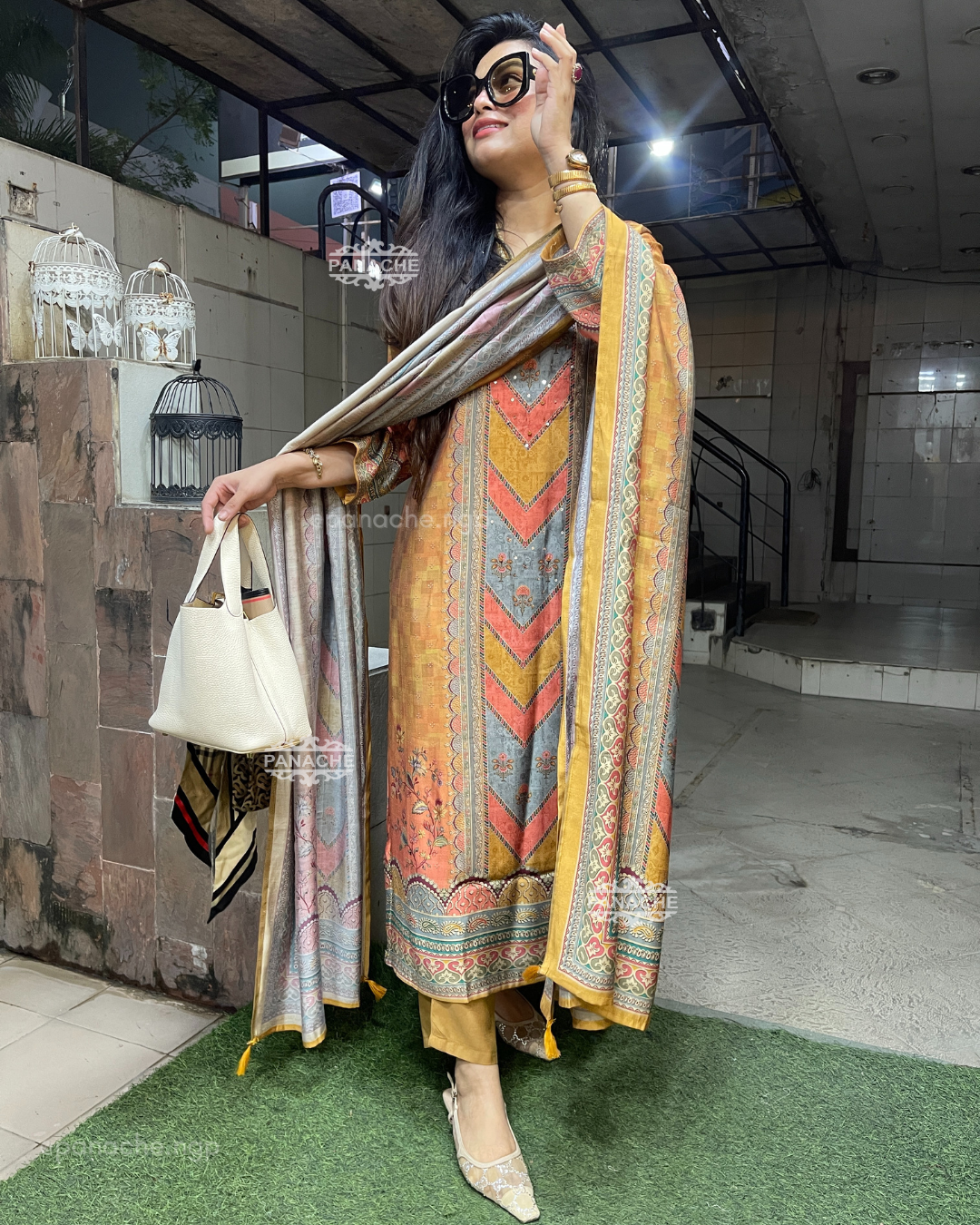 🟣 A semiformal suit with hand work highlights in front and look that resembles a pashmina suit !