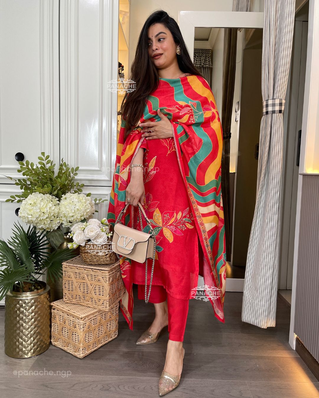 🟣 Printed kurta with highlights on front and back with lovely dupatta and plain pants