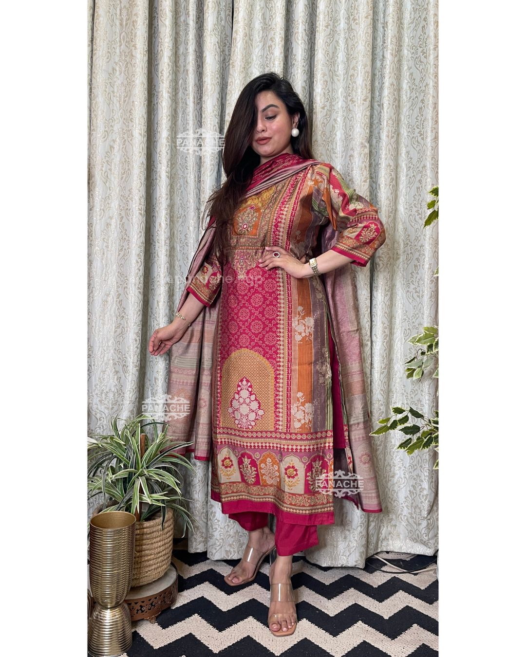 🟣 Highlights on kurta with beautifully placed print in dupatta and kurta and plain pants