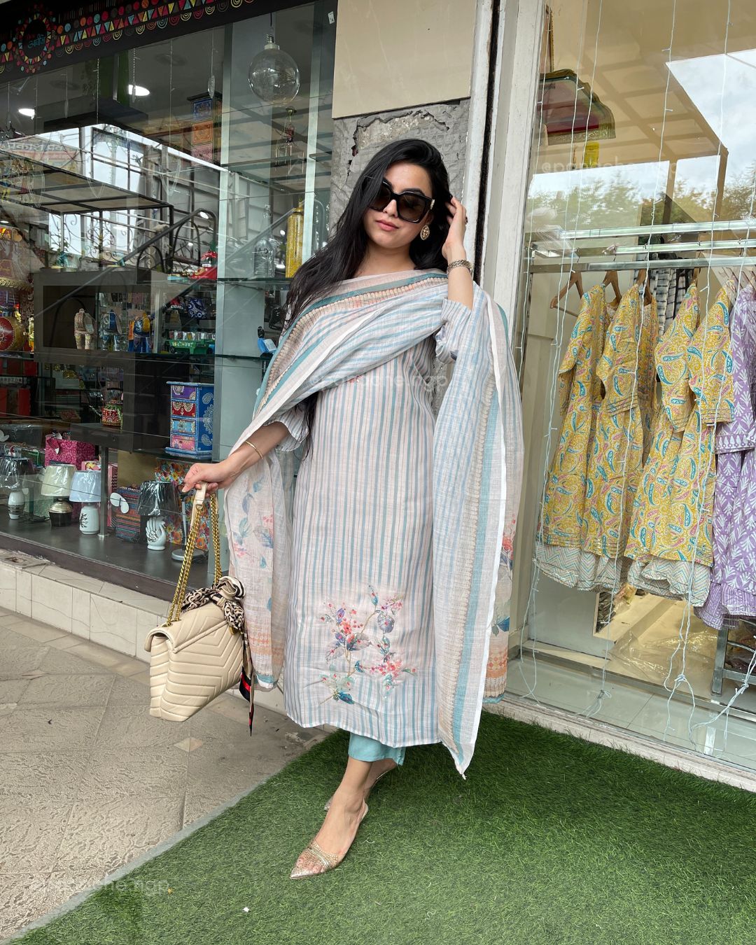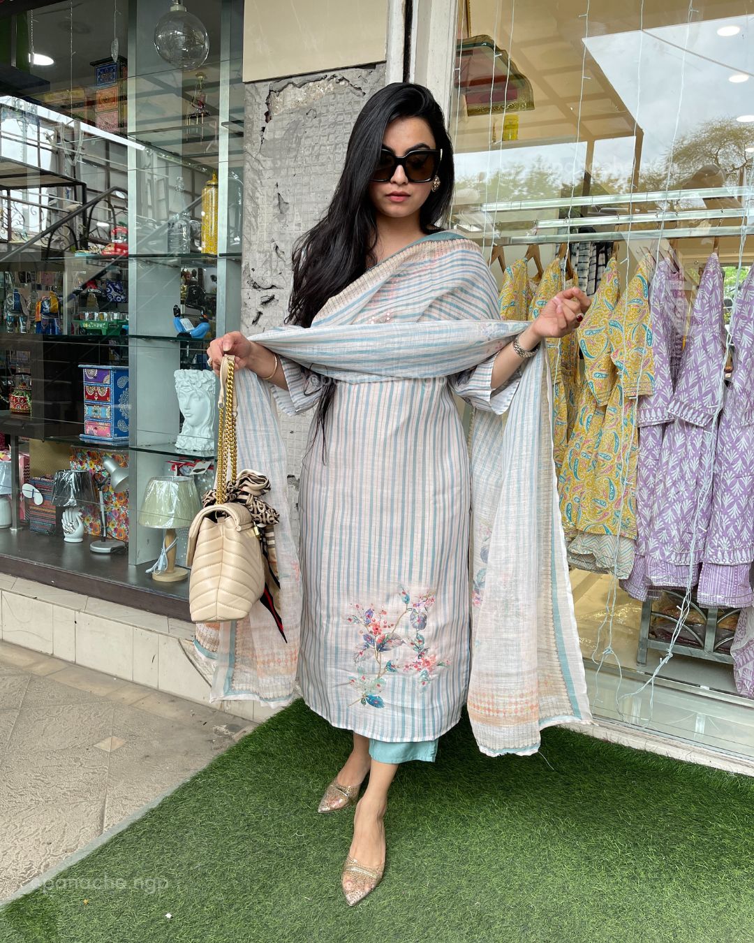 🟣 Stripes and floral details in kurta with matching dupatta with print and Plain pants
