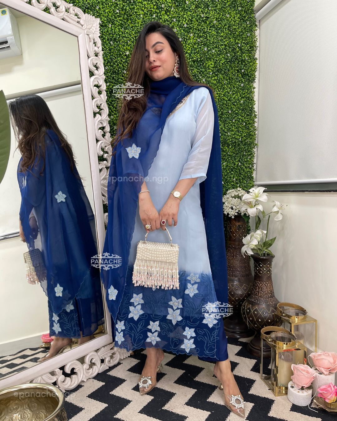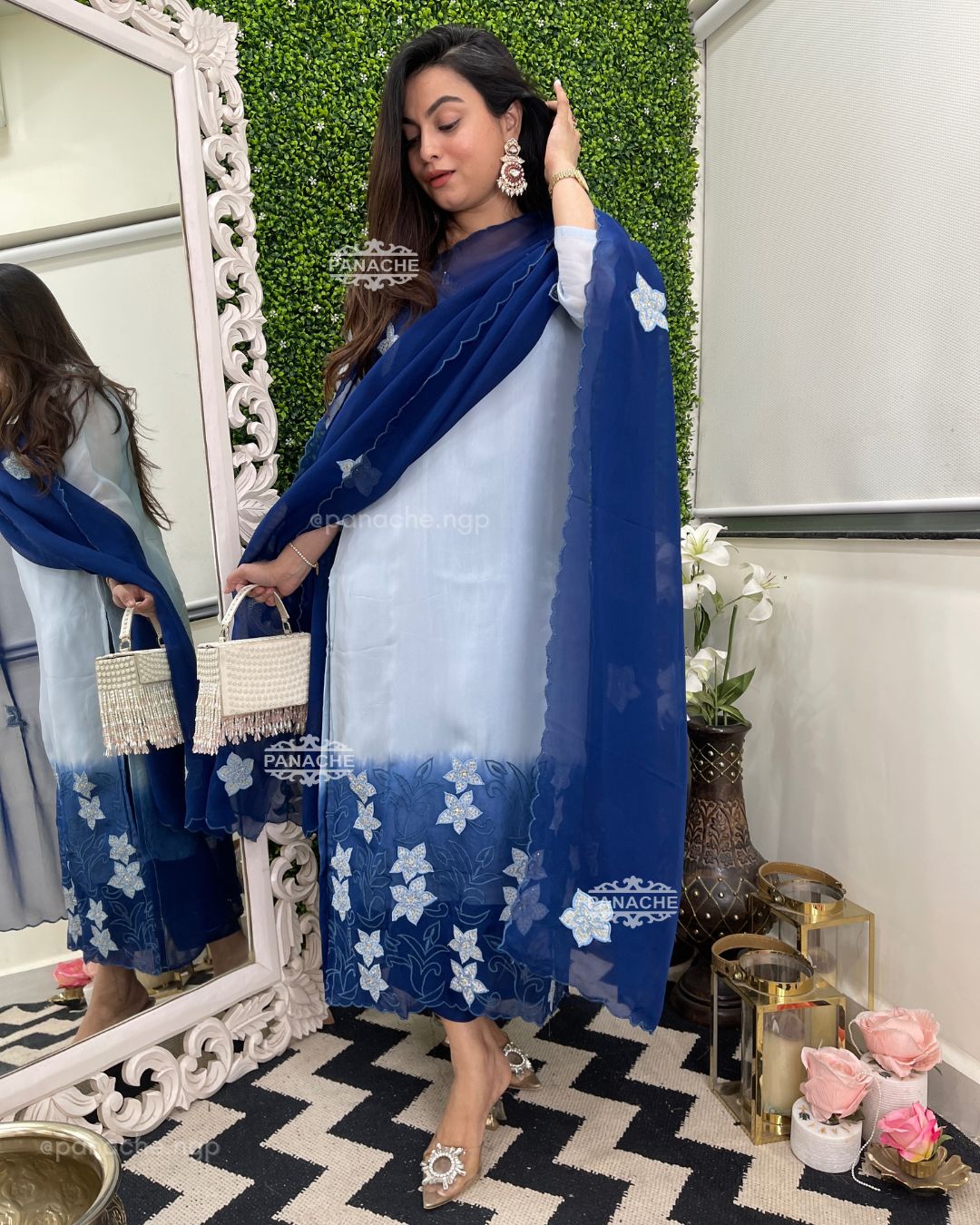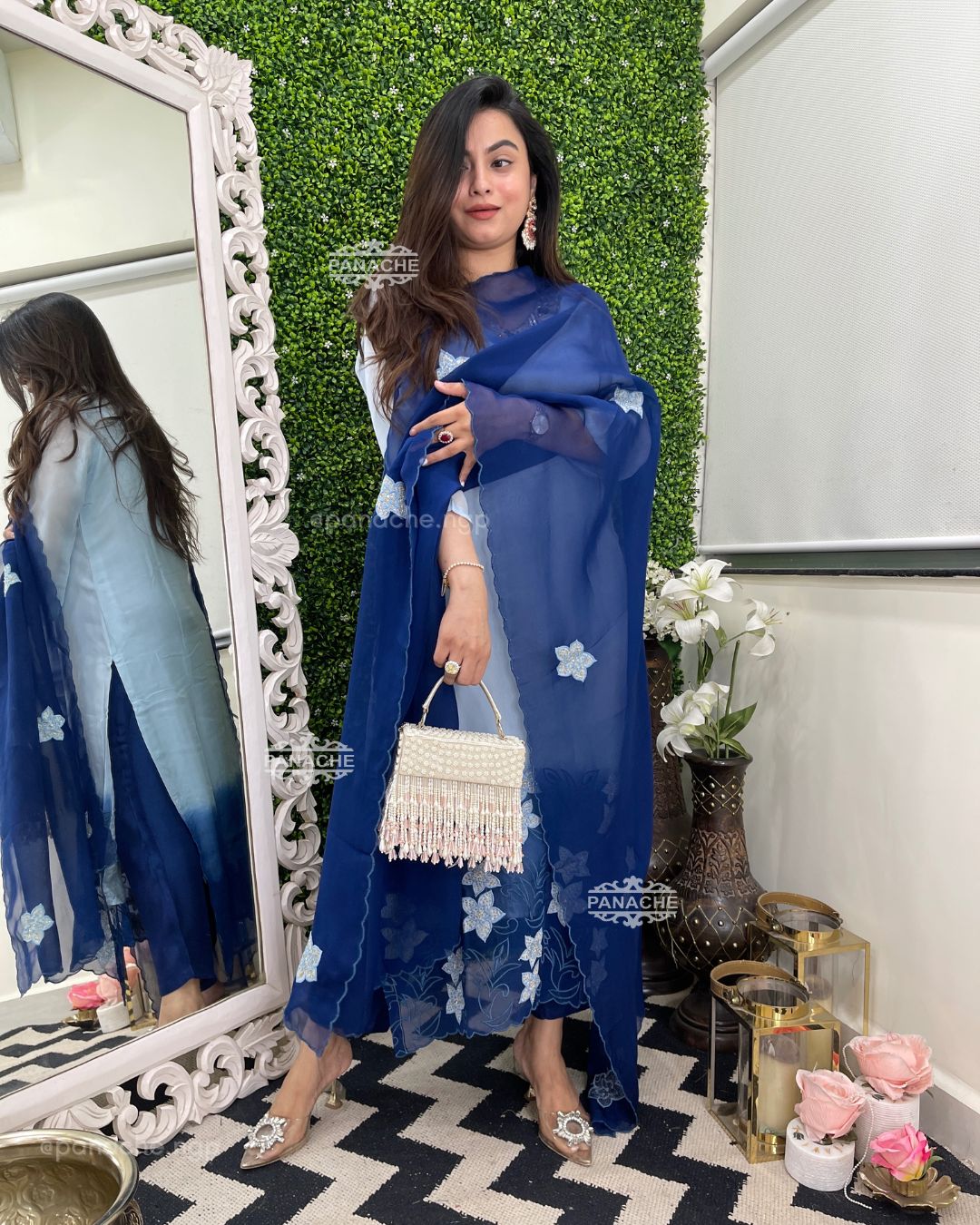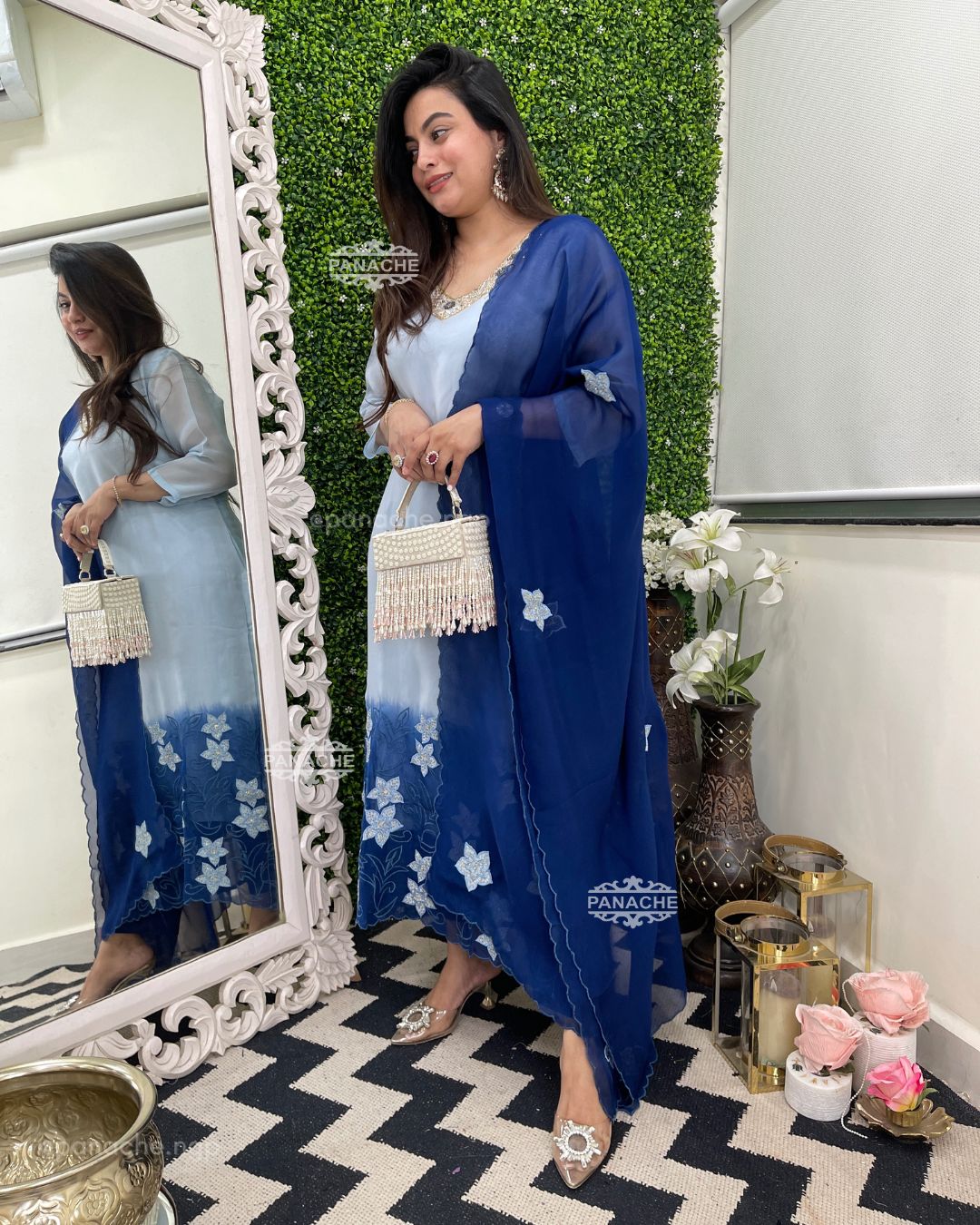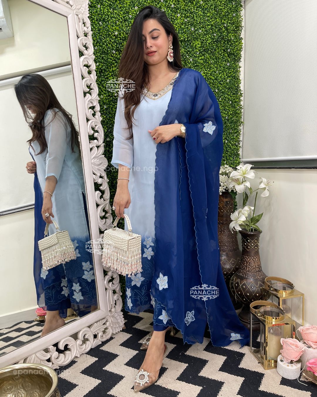 🟣 A peice that no picture can justify ! Truly a craftsmanship design, appliqué and Mukesh details on ombré kurta, intricate handwork on neckline with the most stunning handwork dupatta