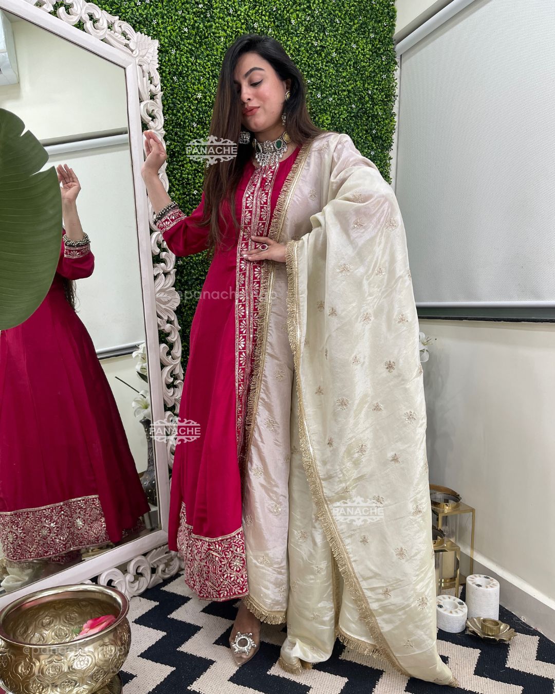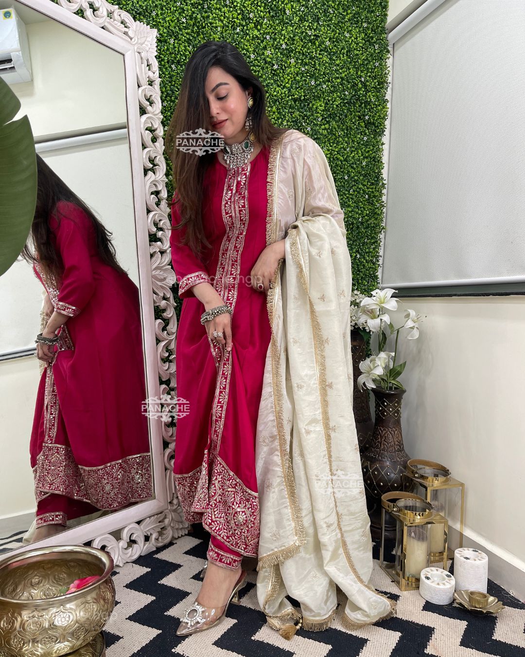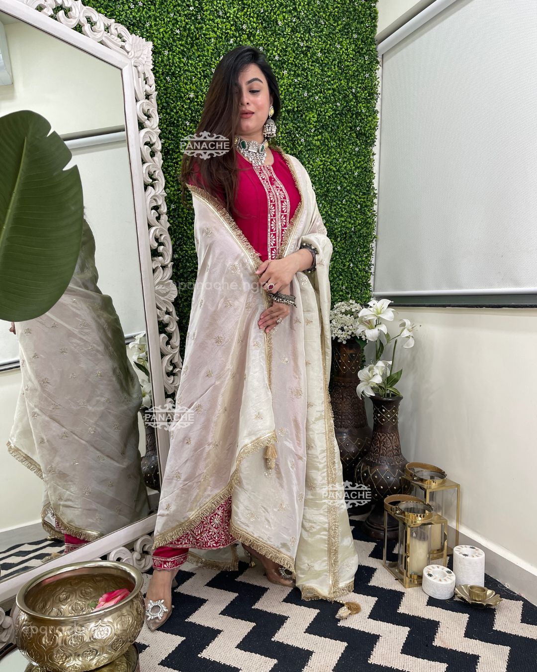 🟣 A dupatta that takes over the game and a colour with embroidery on neckline with frontline patti and heavy daman of kurta, border work on pants , dupatta is in pure tissue with heavy buttis and all side tassels