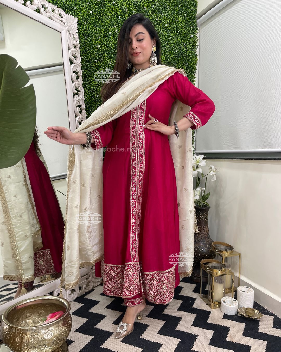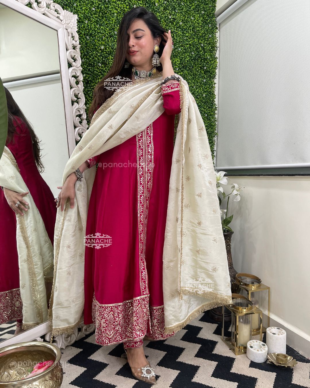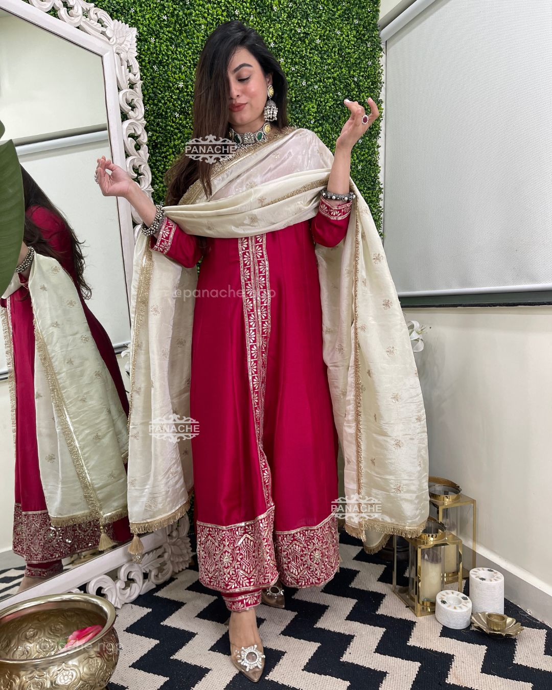 🟣 A dupatta that takes over the game and a colour with embroidery on neckline with frontline patti and heavy daman of kurta, border work on pants , dupatta is in pure tissue with heavy buttis and all side tassels