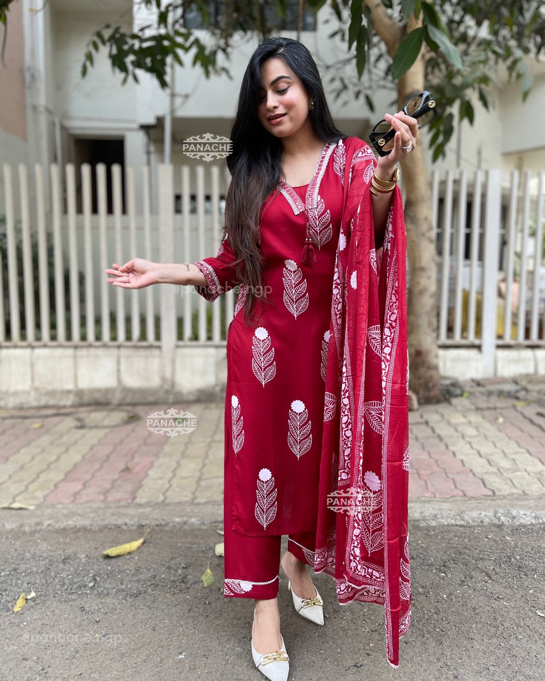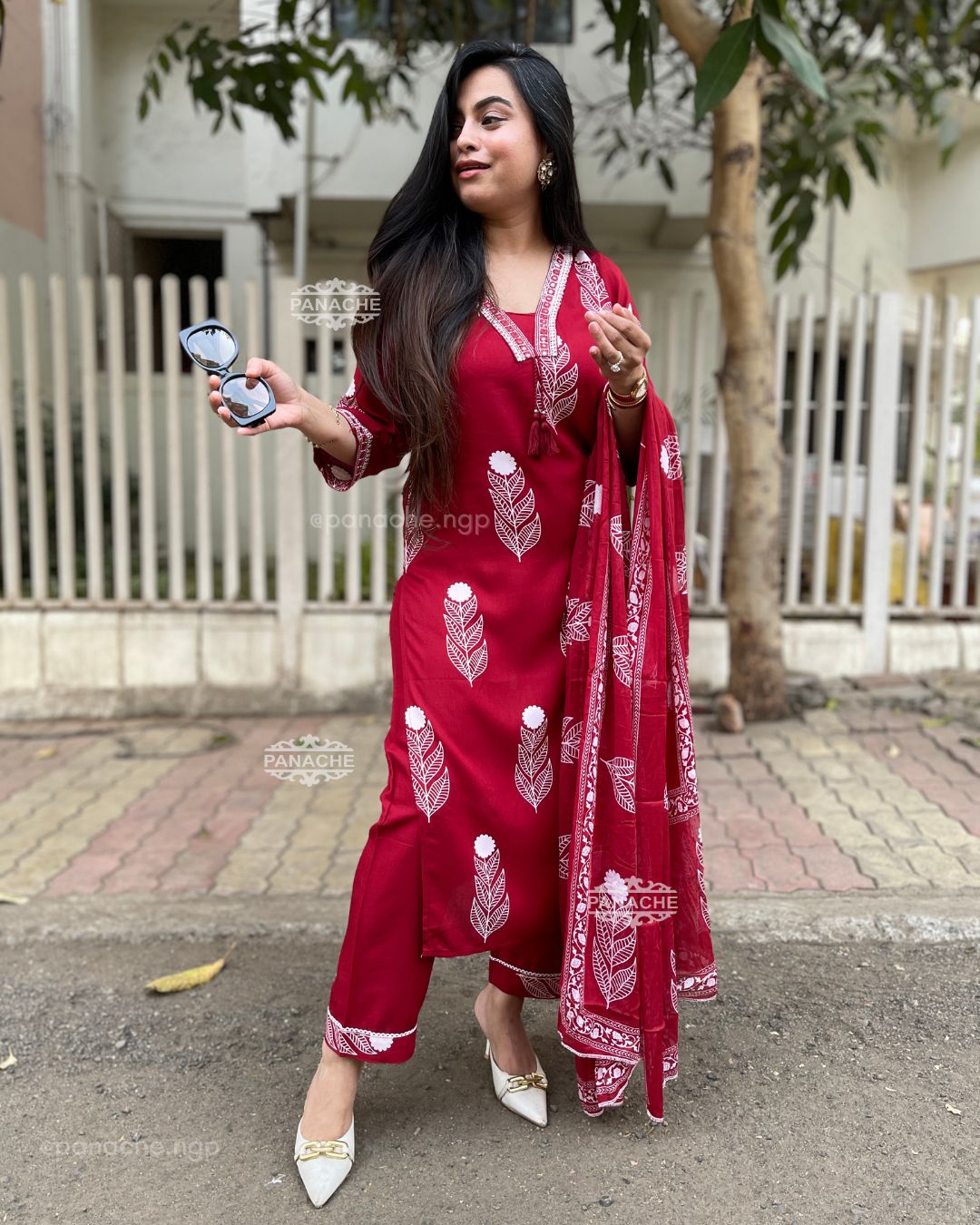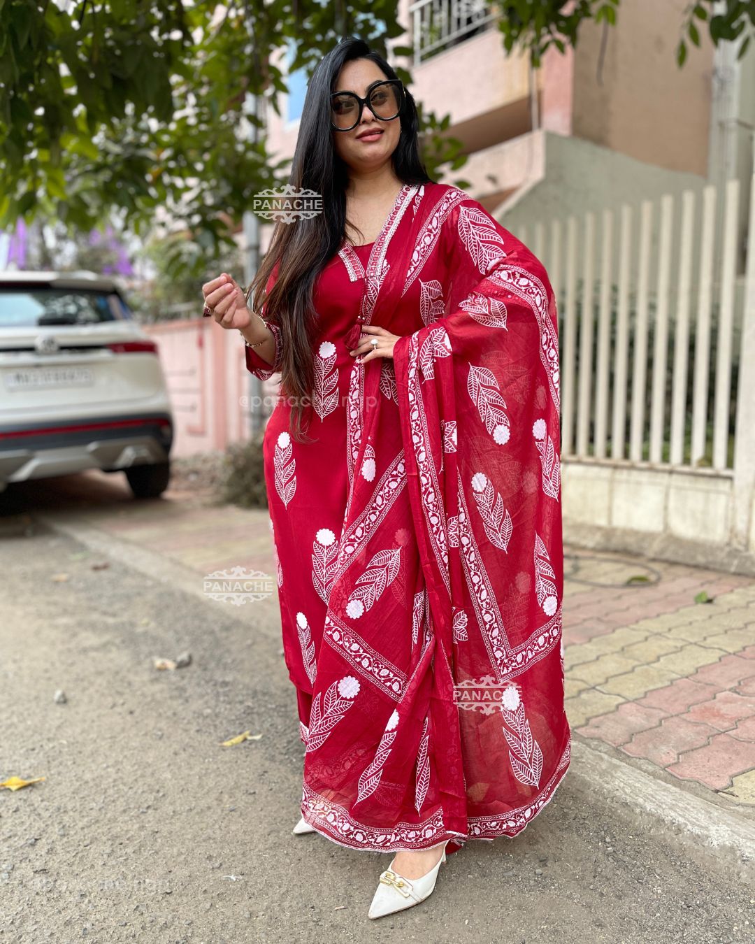🟣 Thread work neckline with tassel and printed kurta with printed duoatta in handblock giving summer vibes