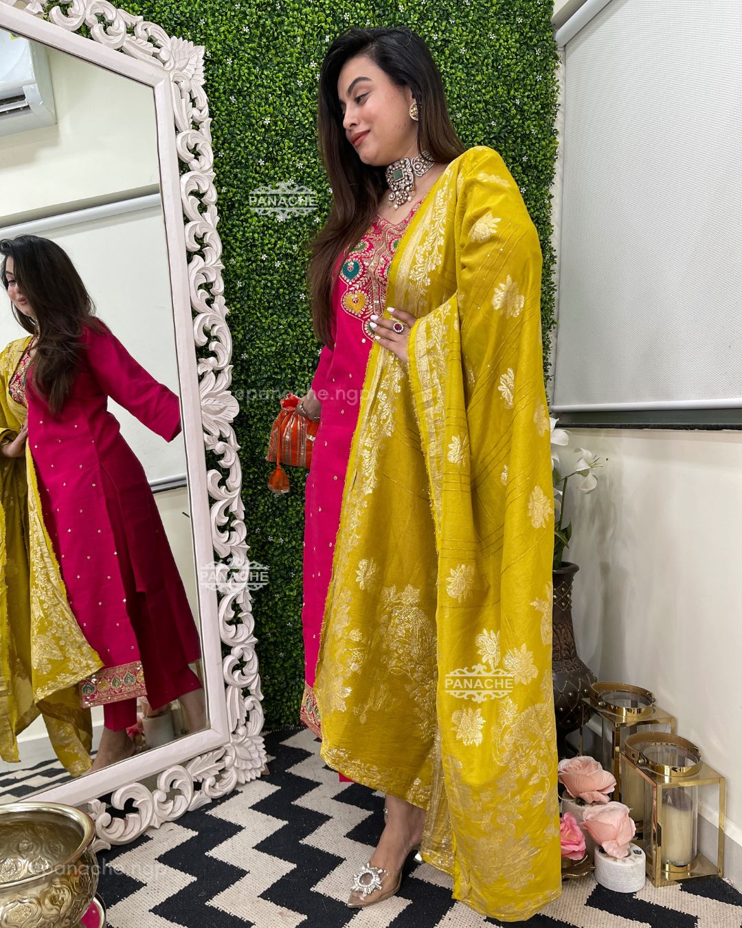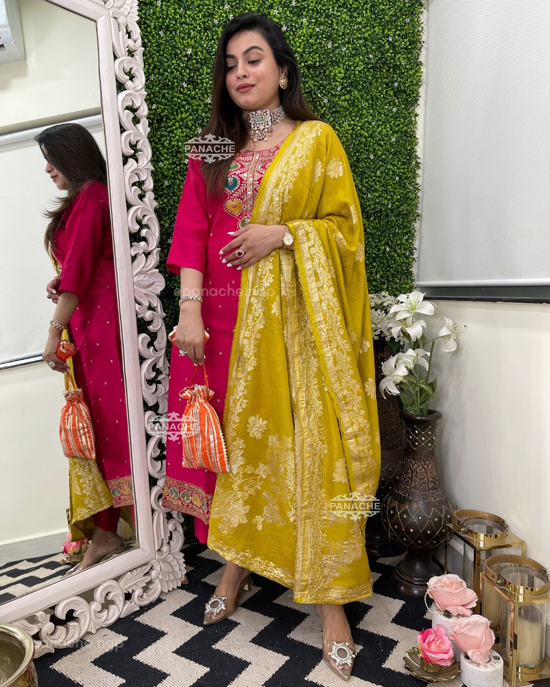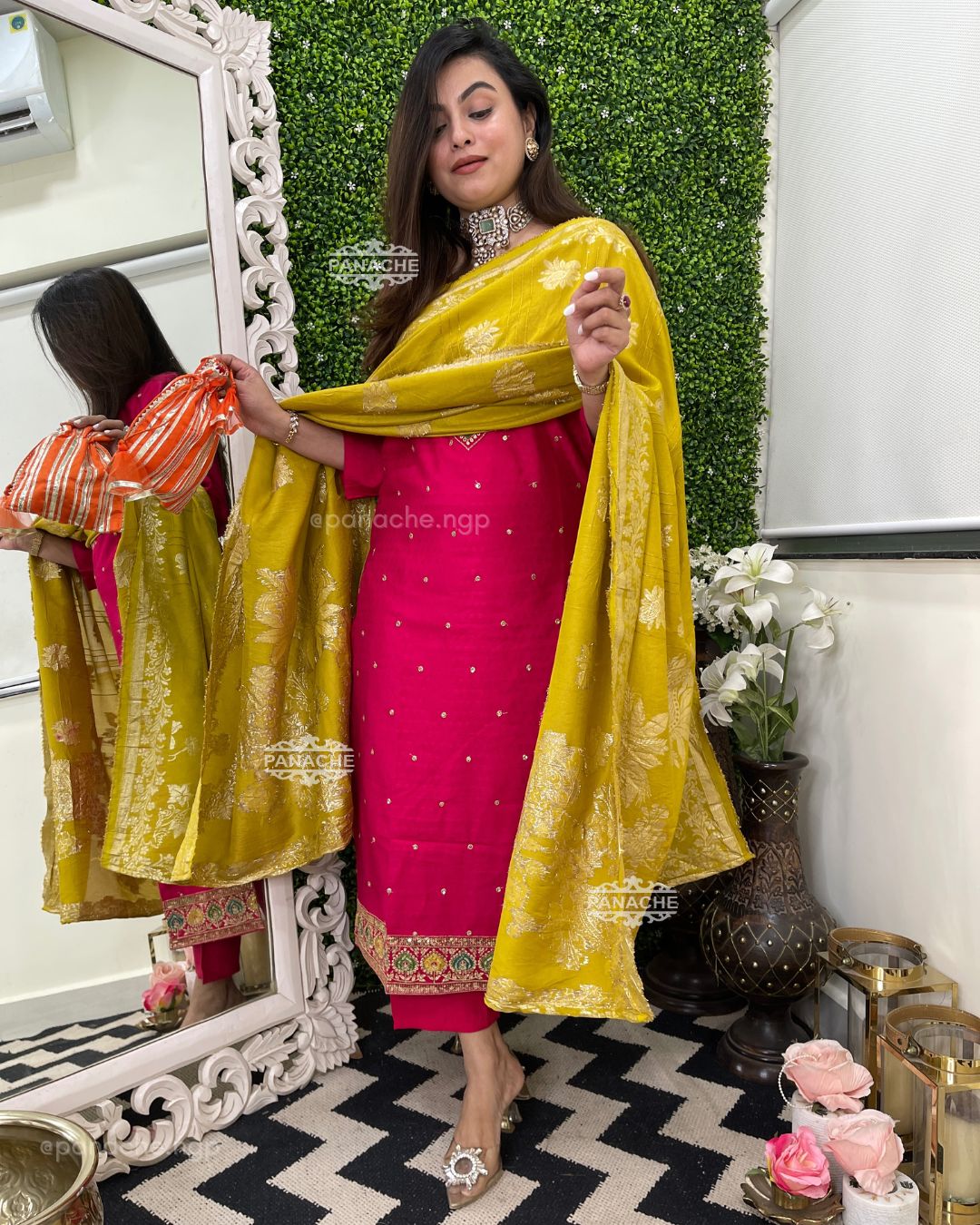 🟣 A beautiful kurta with heavy neckline and daman, teamed with a weaved dupatta