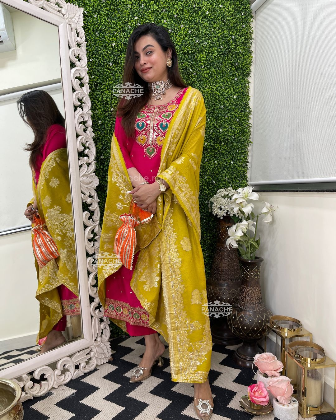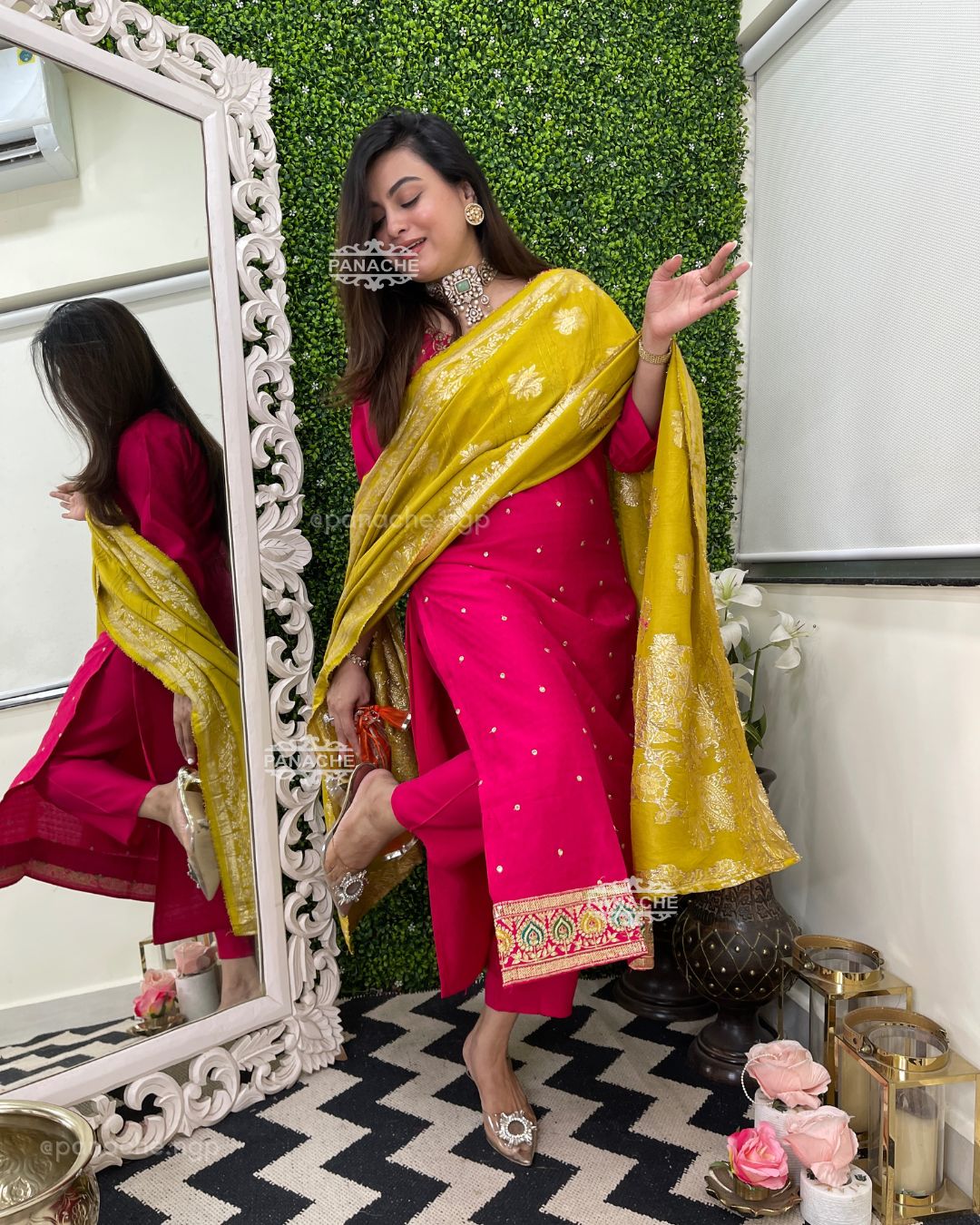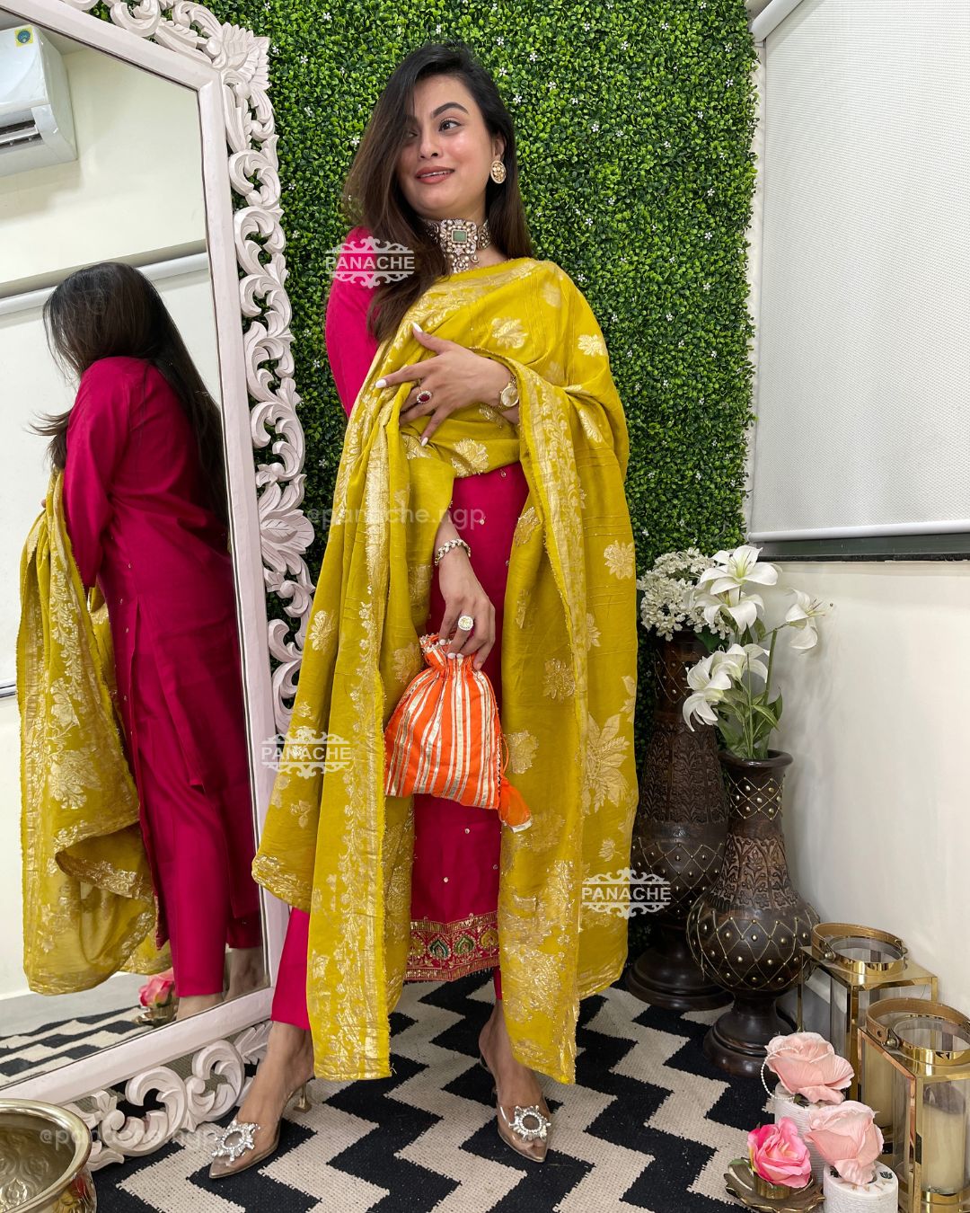 🟣 A beautiful kurta with heavy neckline and daman, teamed with a weaved dupatta