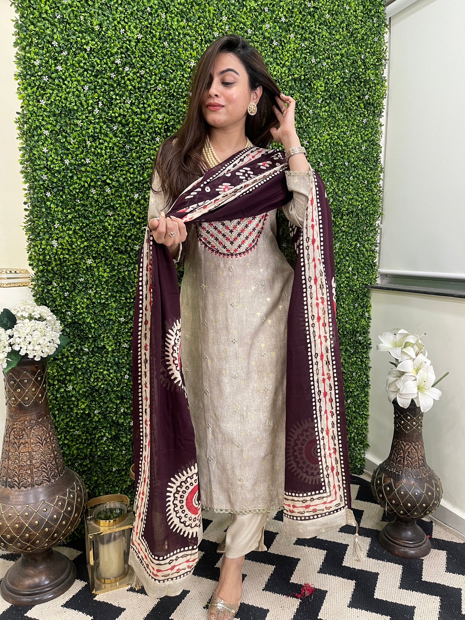 🟣 Details on neckline of kurta with ikkat dupatta and self buttas on kurta