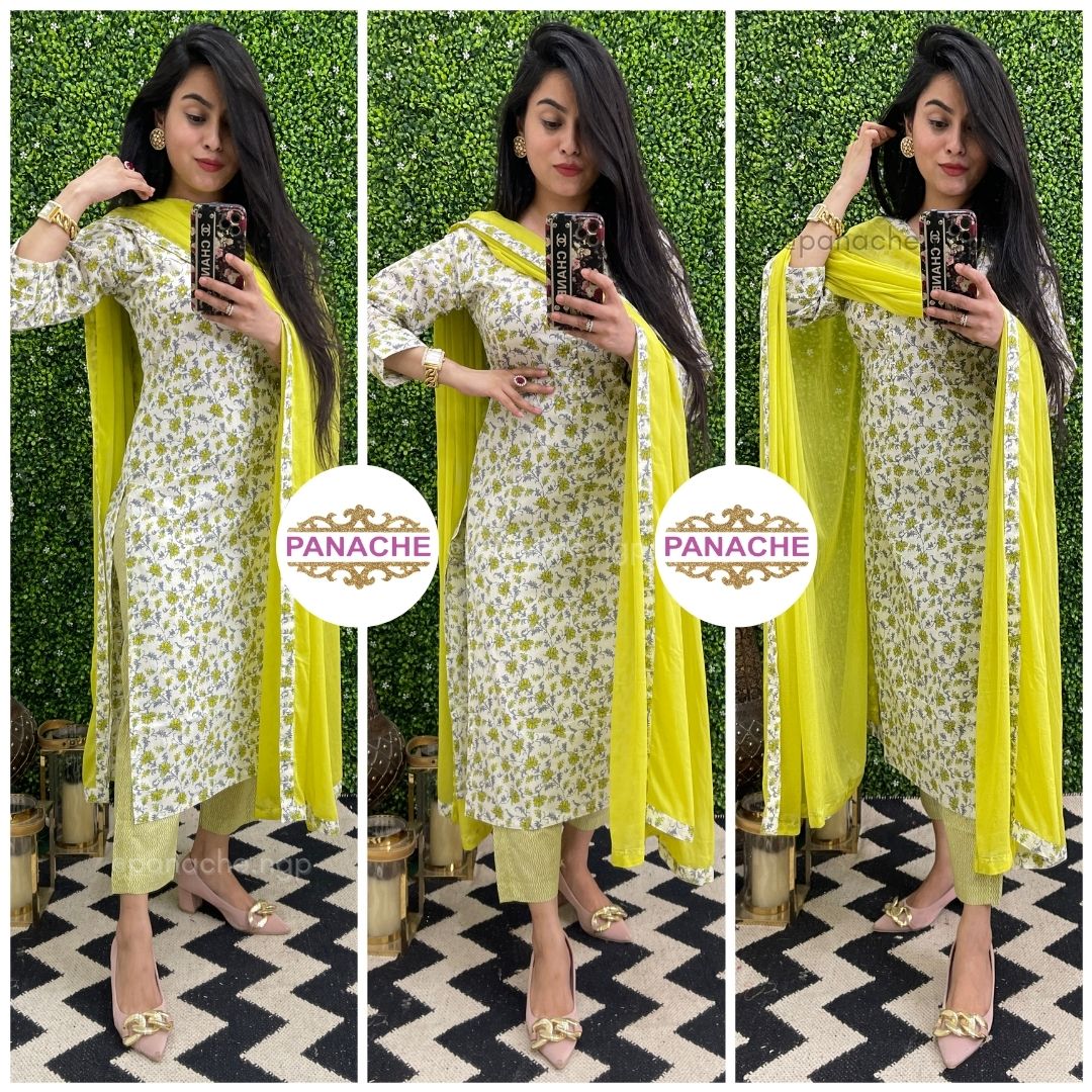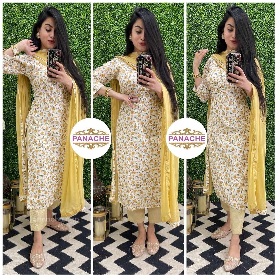 🟣 Sequin highlights on yolk of kurta with chiffon full dupatta and printed pants