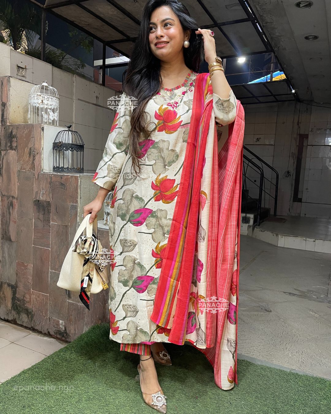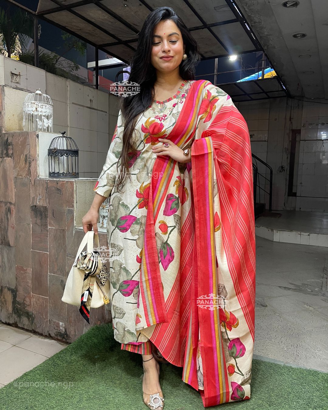 🟣 Detailed handwork neckline with print on print kurta pant set