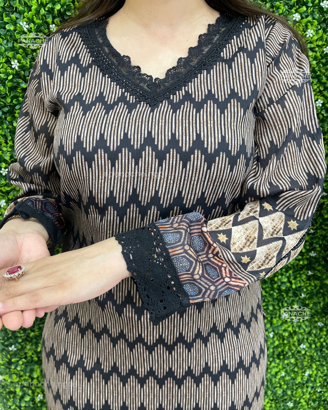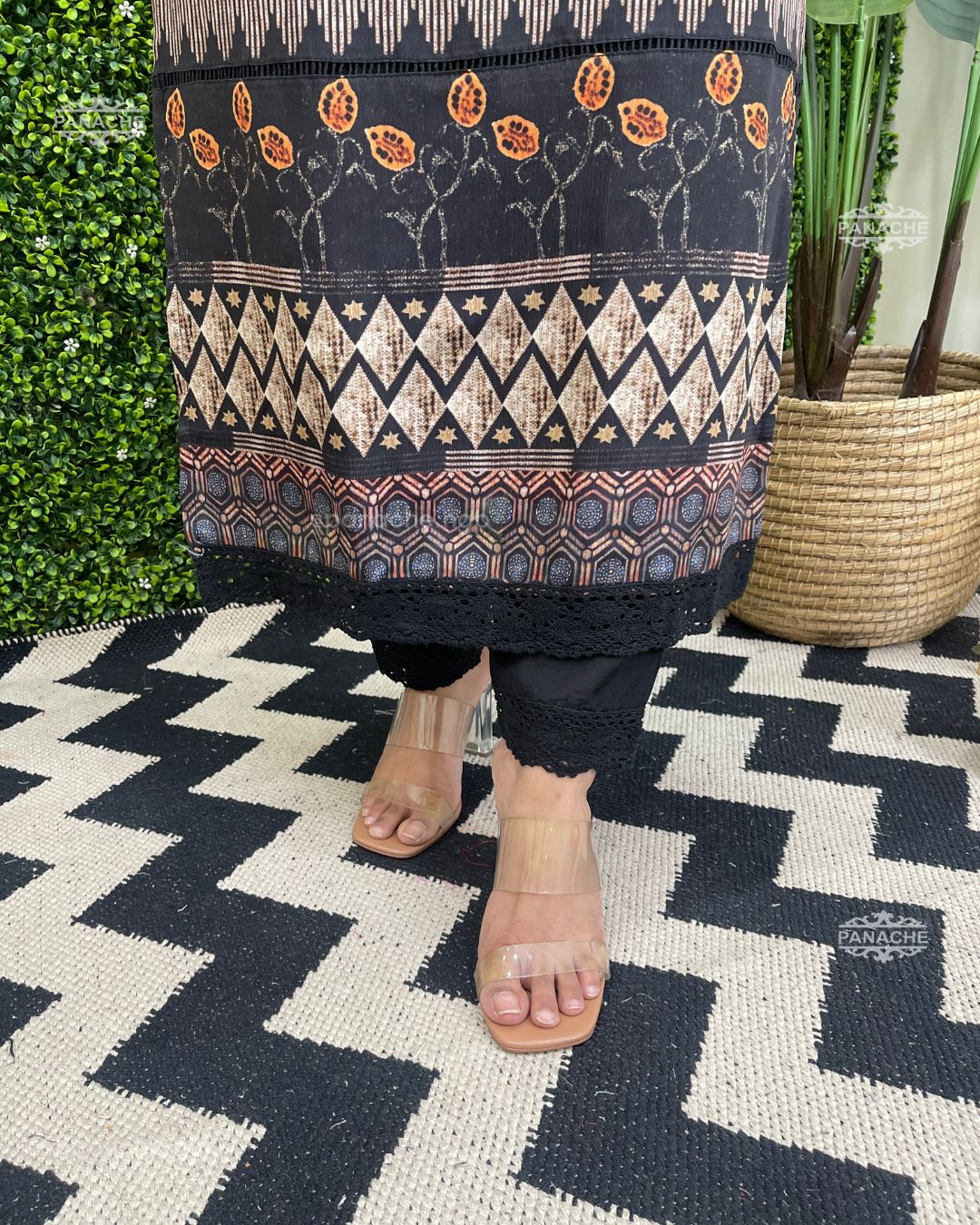 🟣 A printed karachi style kurta with full sleeves and plain cotton pants with Crosia details on sleeves daman and pants