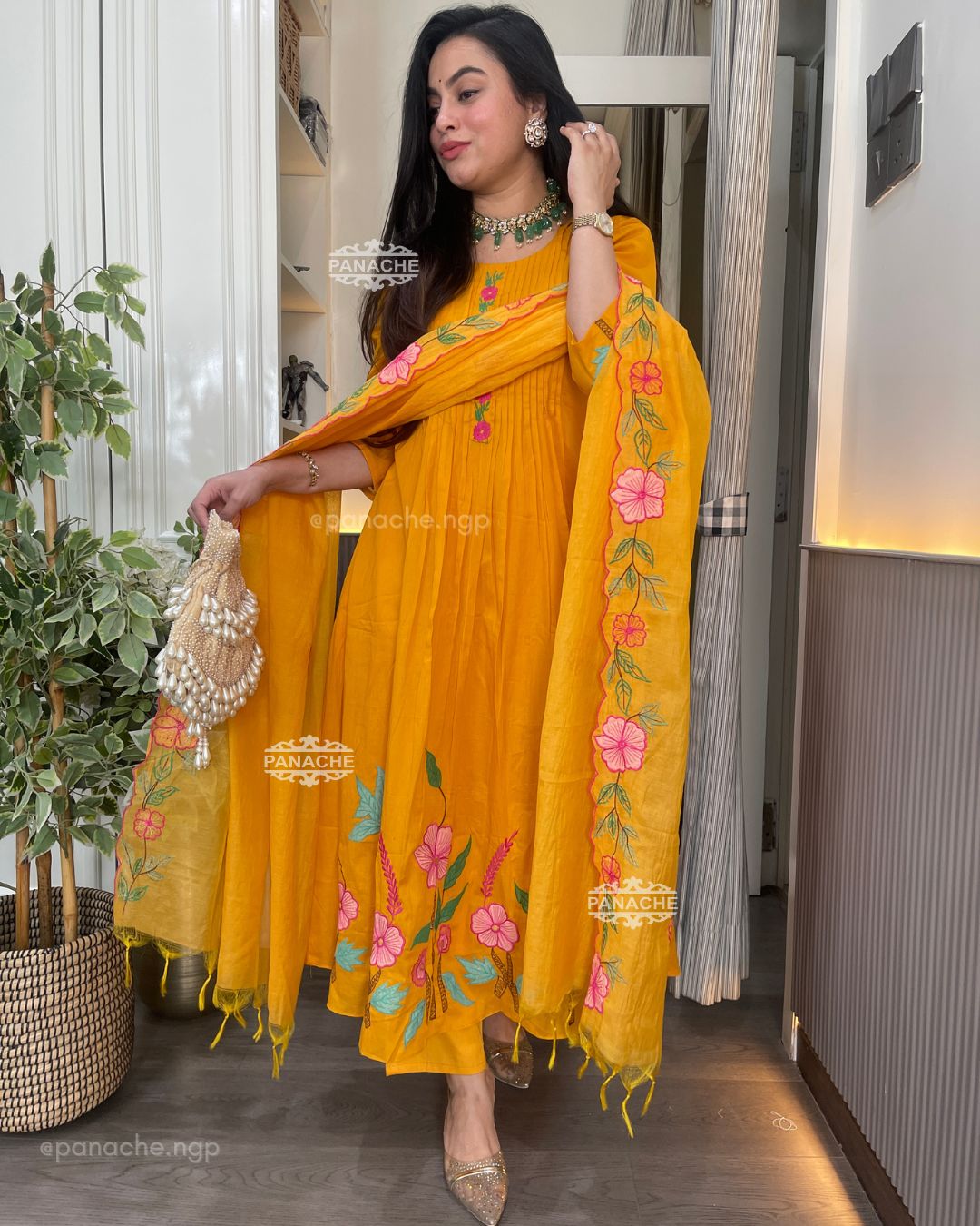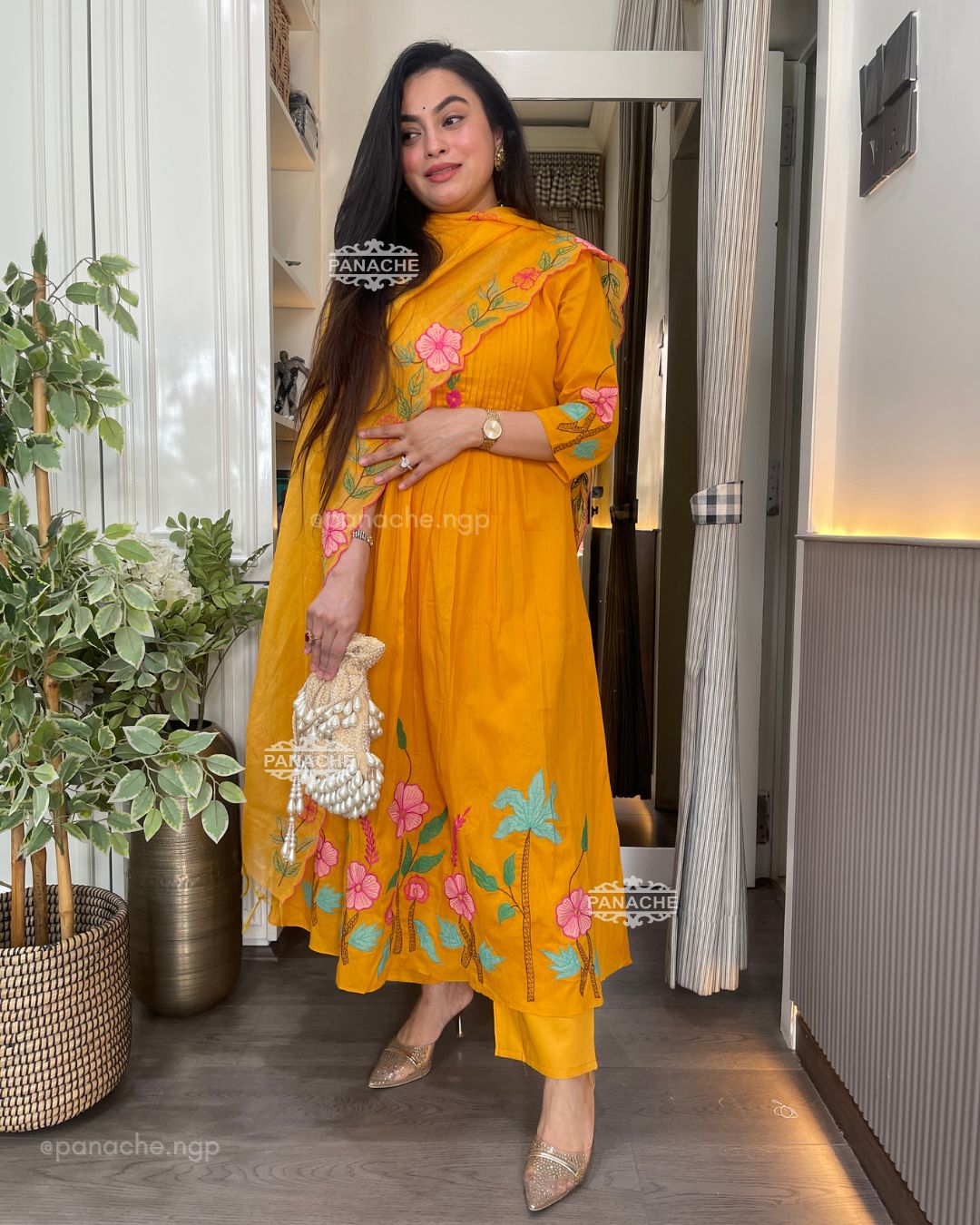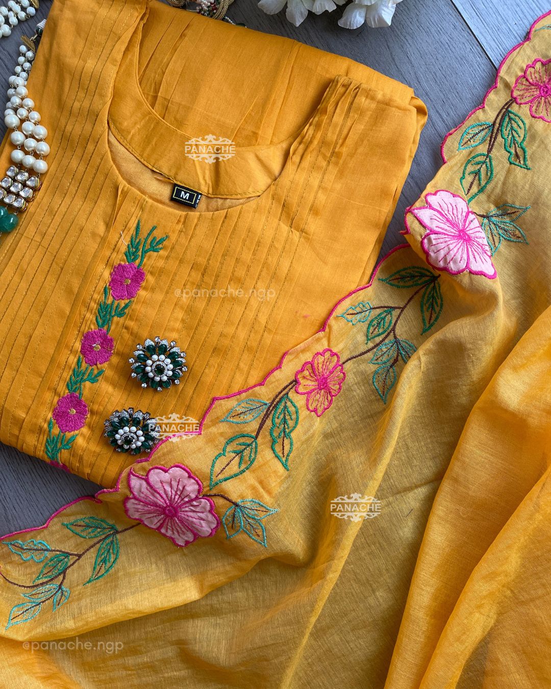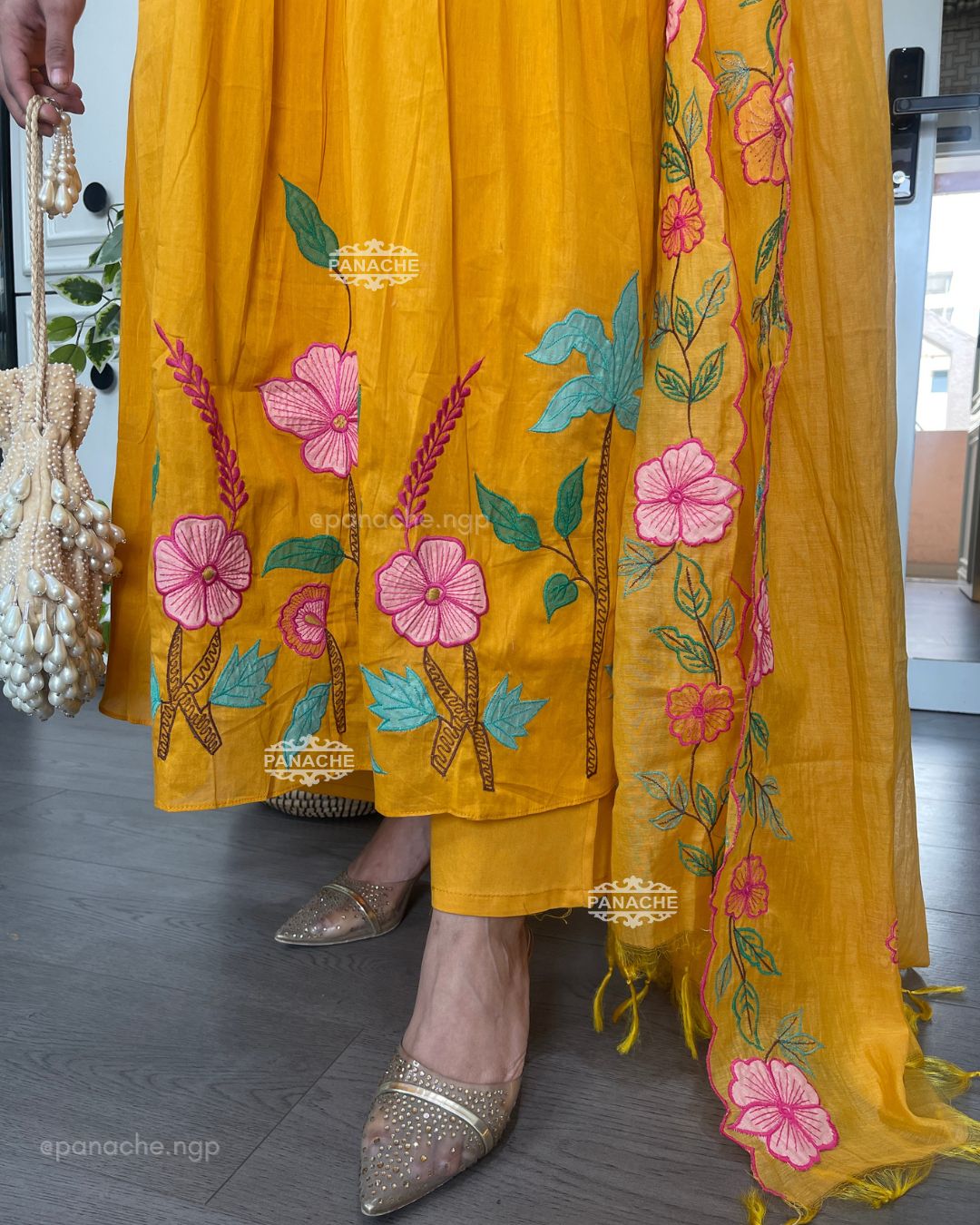 🟣 The perfect mango colour with garden embroidery that sits well in contrast on Daman and cutwork floral dupatta