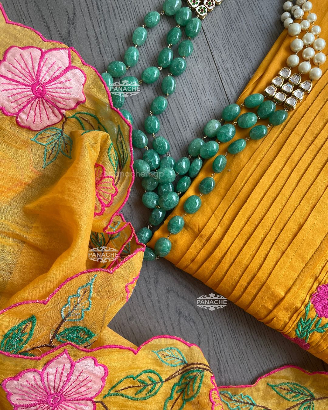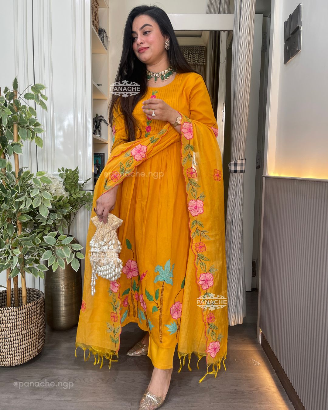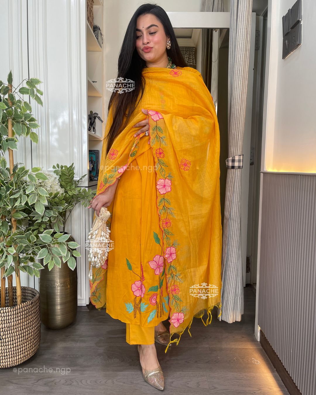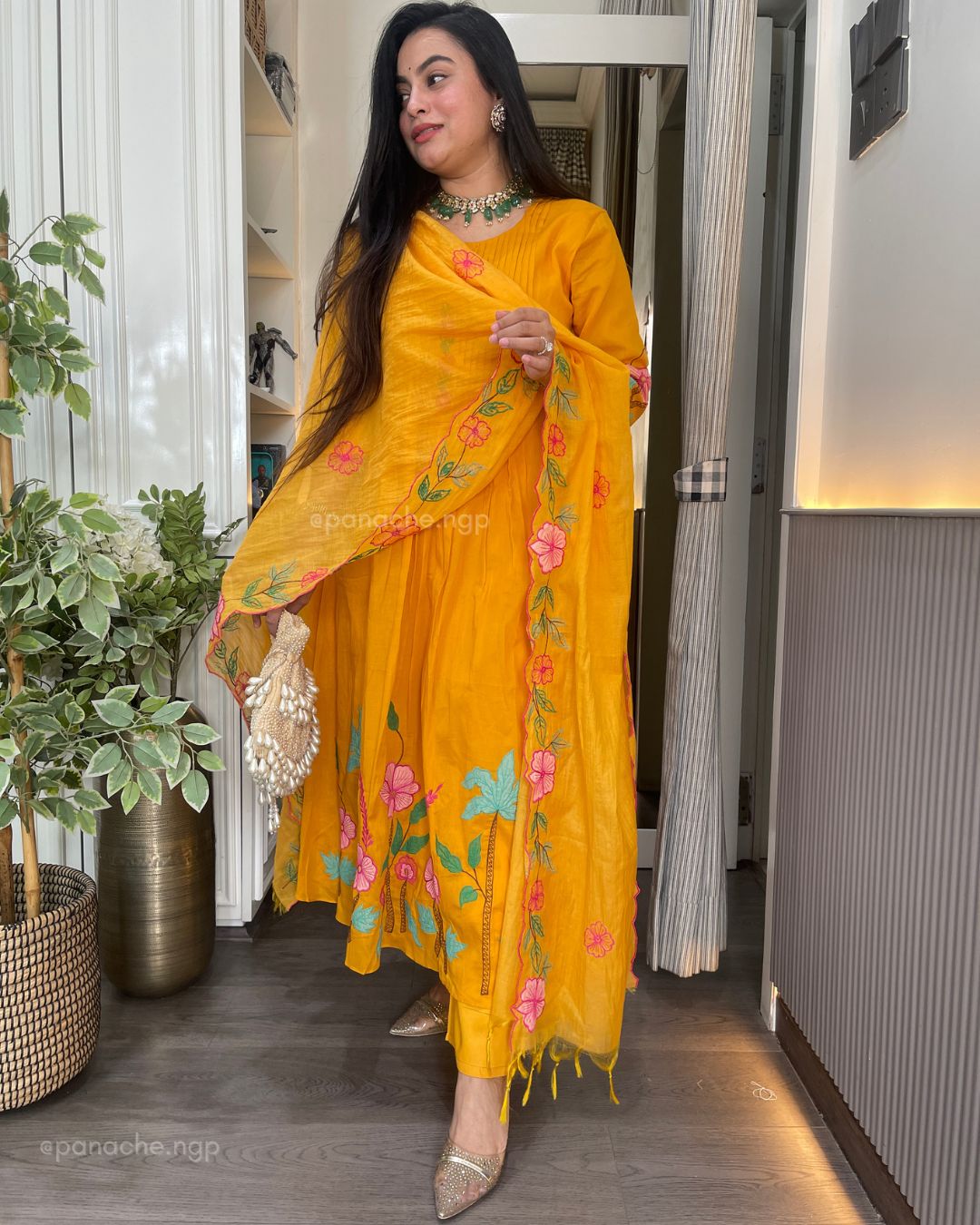 🟣 The perfect mango colour with garden embroidery that sits well in contrast on Daman and cutwork floral dupatta
