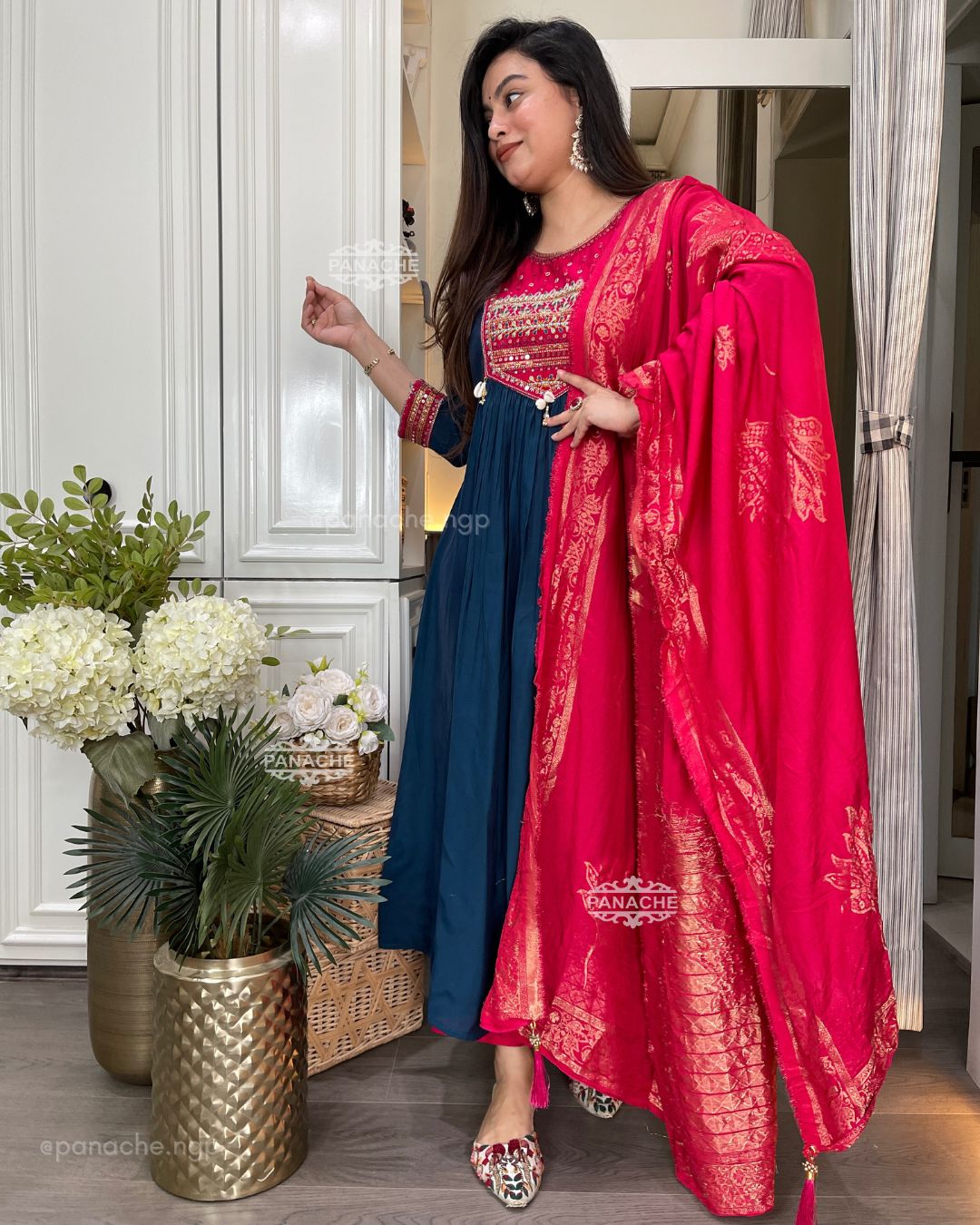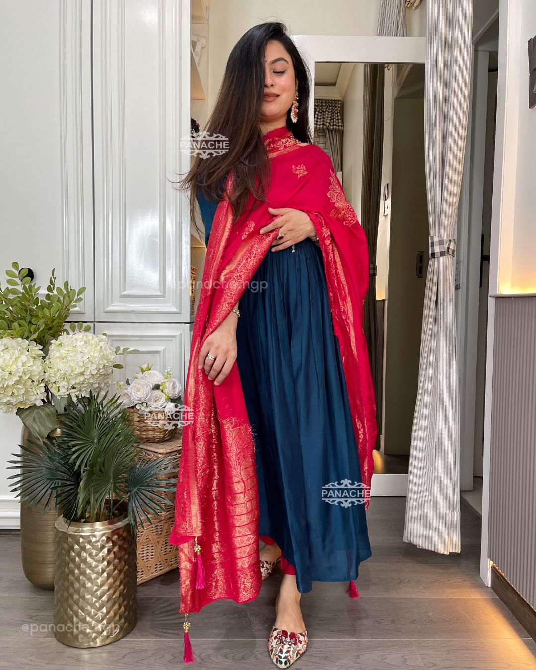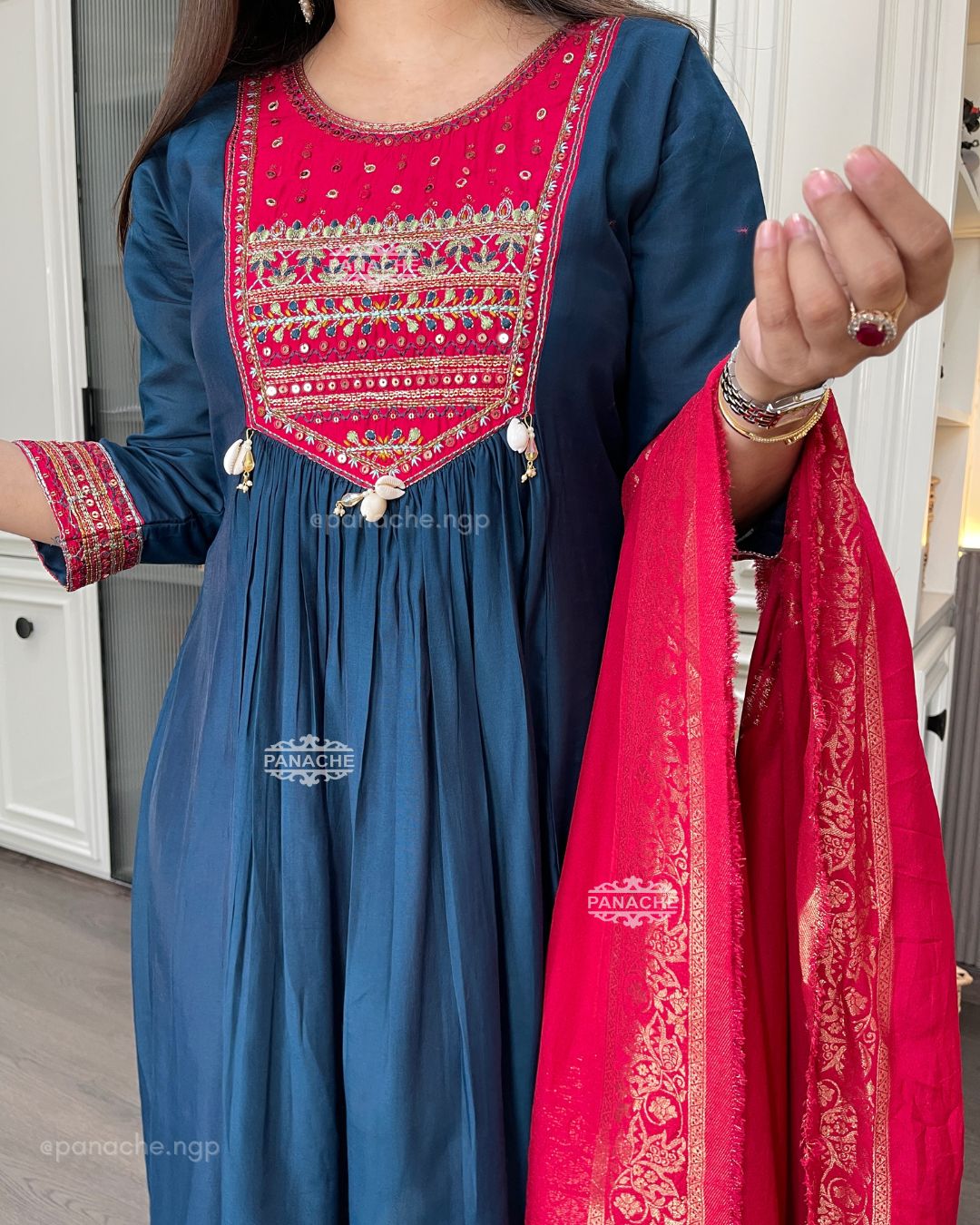🟣 Appliquéd kurta with Shells on neckline with small chunnads on yolk front and back only in the centre , teamed with heavy woven Banarasi dupatta