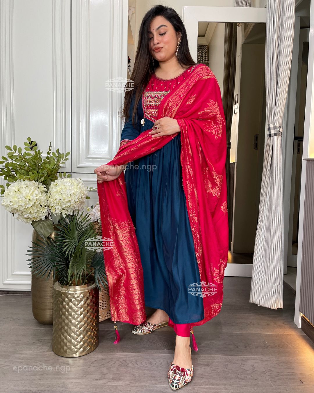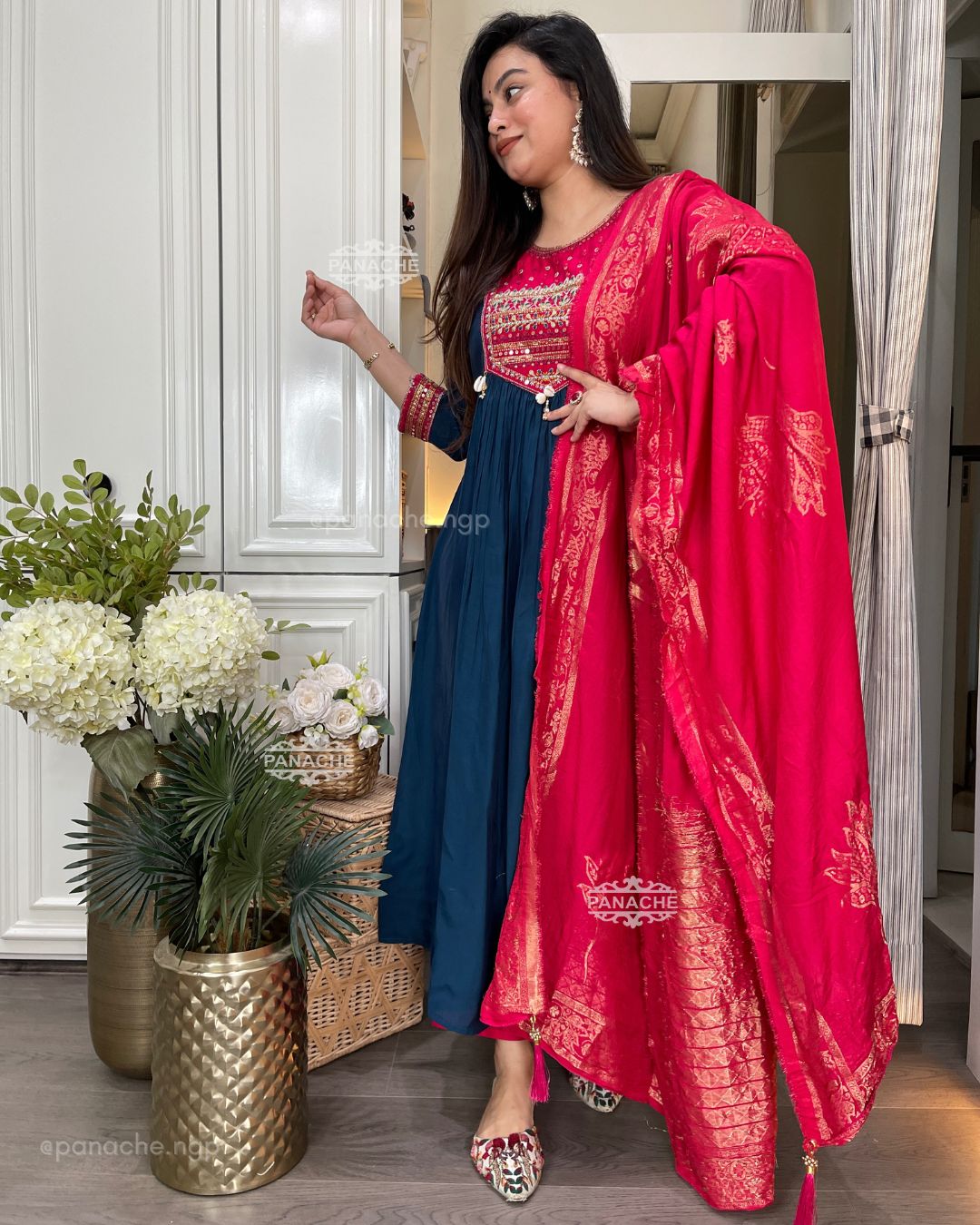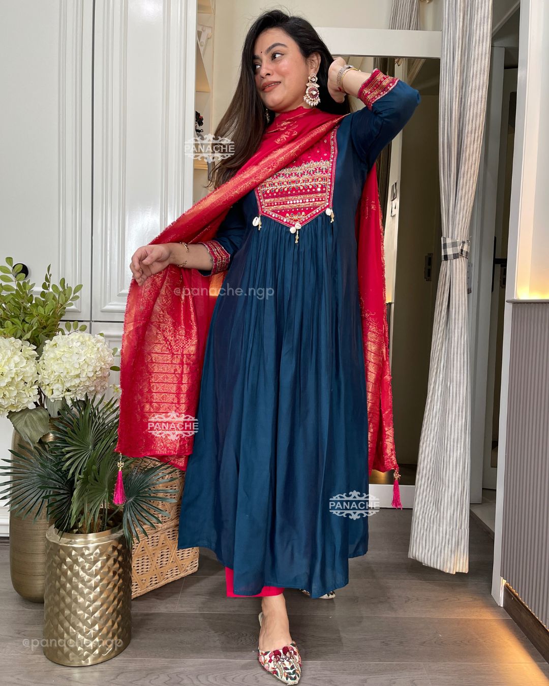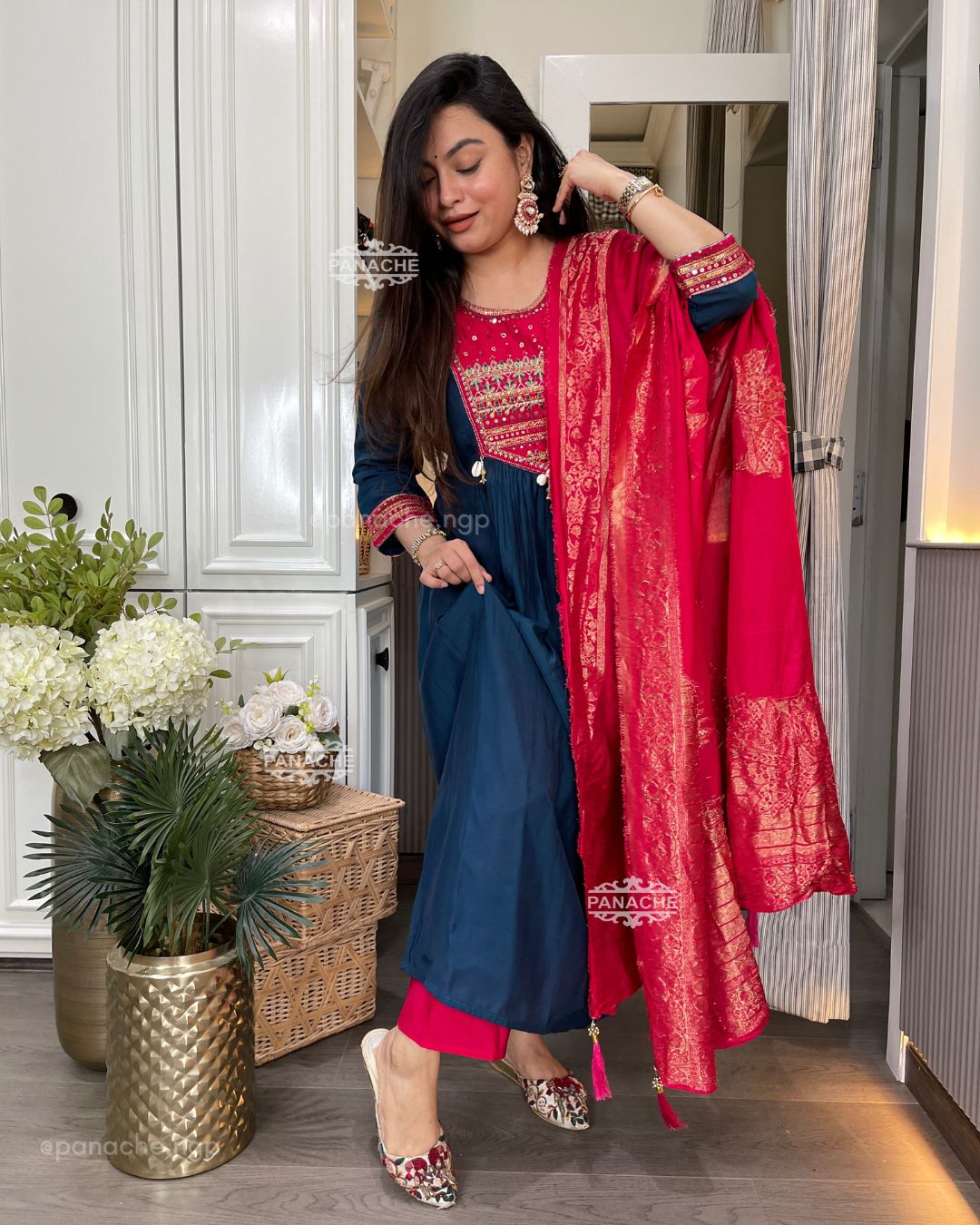 🟣 Appliquéd kurta with Shells on neckline with small chunnads on yolk front and back only in the centre , teamed with heavy woven Banarasi dupatta