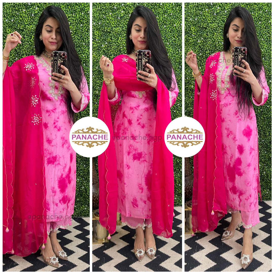 🟣 Details - Tye & dye kurta with zardoz French knot and cut pipe embroidery on neckline et mirror work scallop on sleeves, pants, mirror work in dupatta with all sides scallop