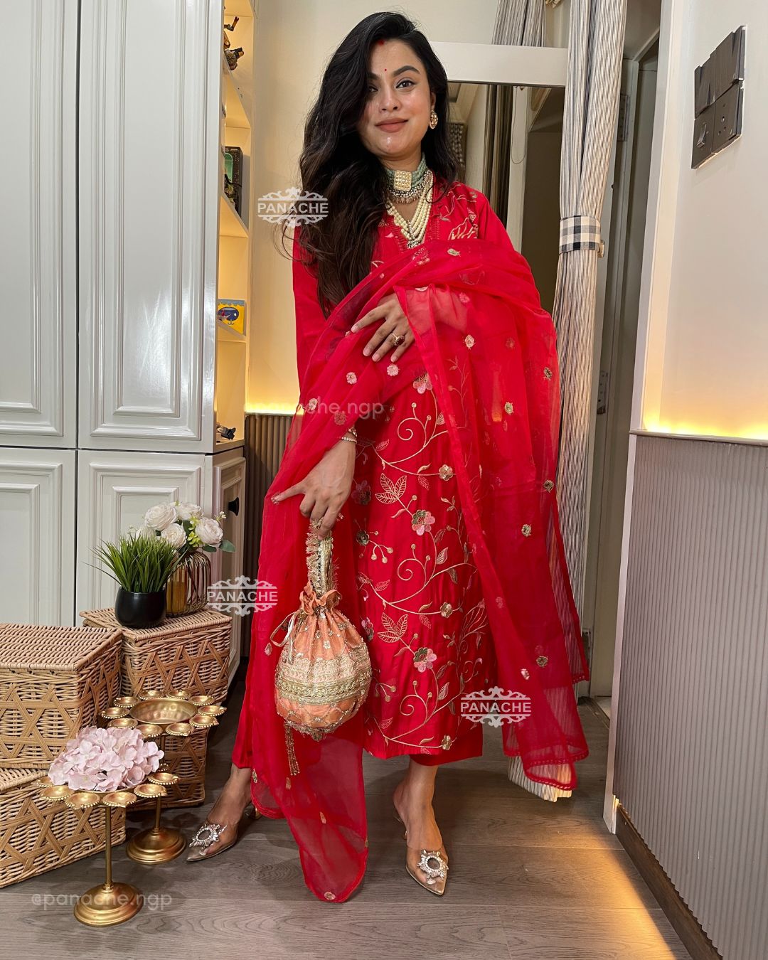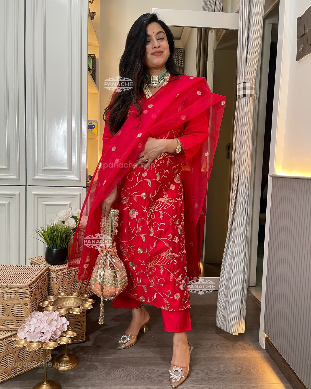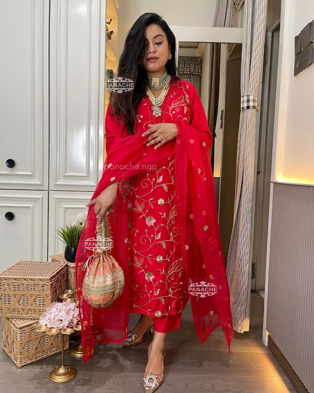 🟣 Embroidered kurta with buttas all over dupatta and plain pants and detailed neckline