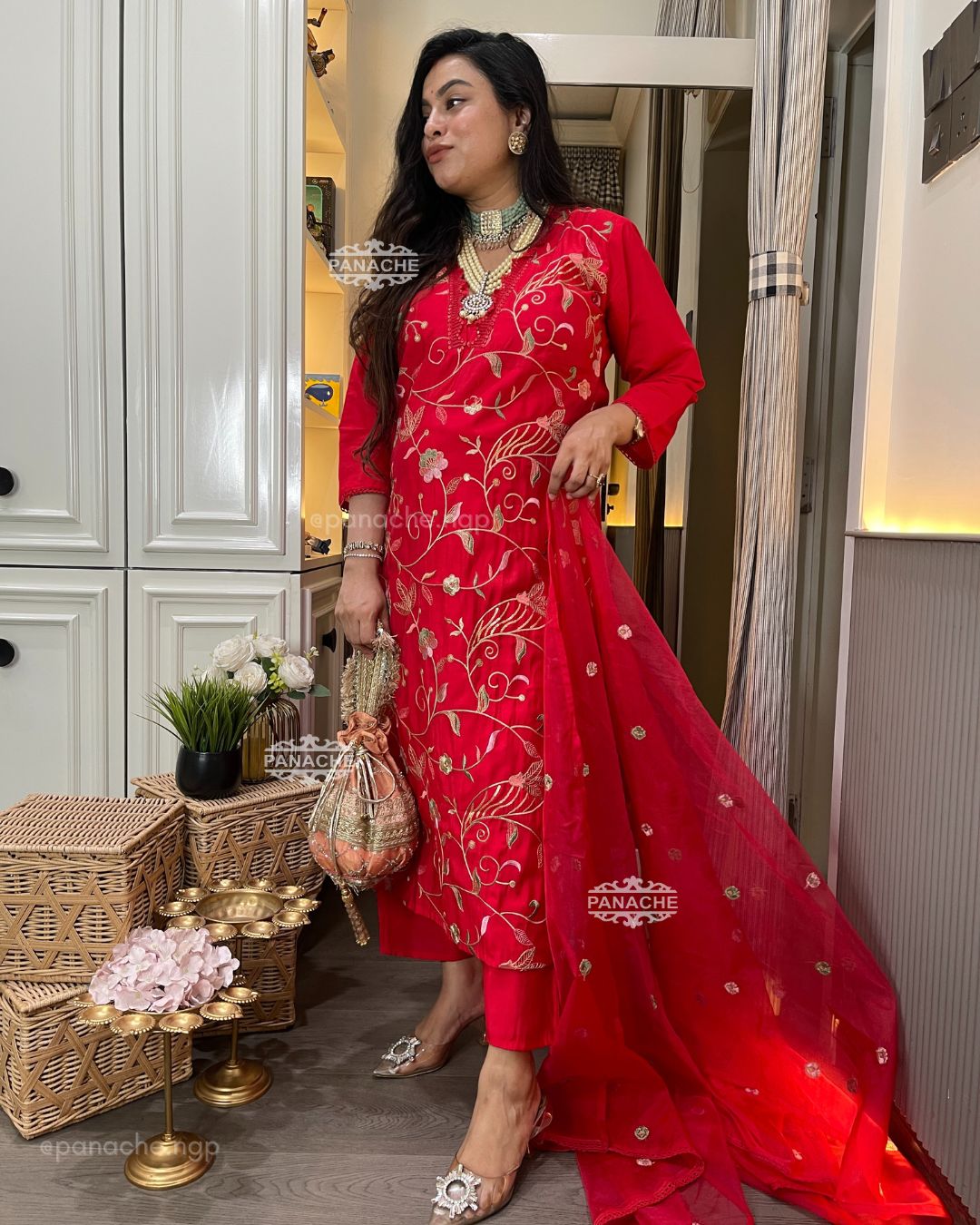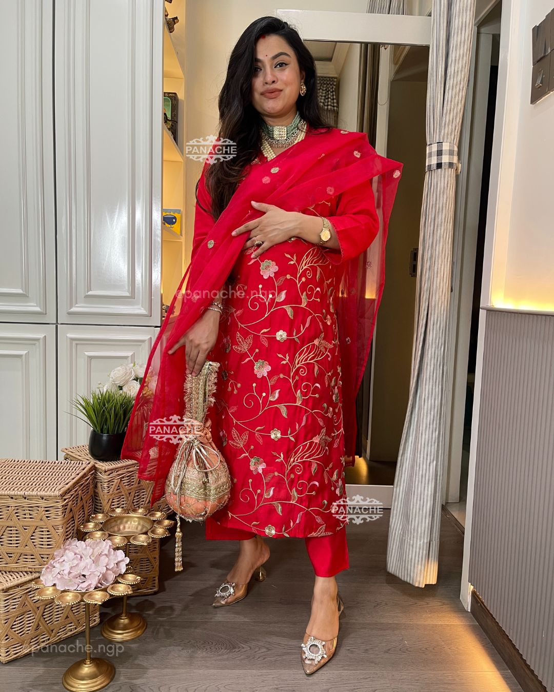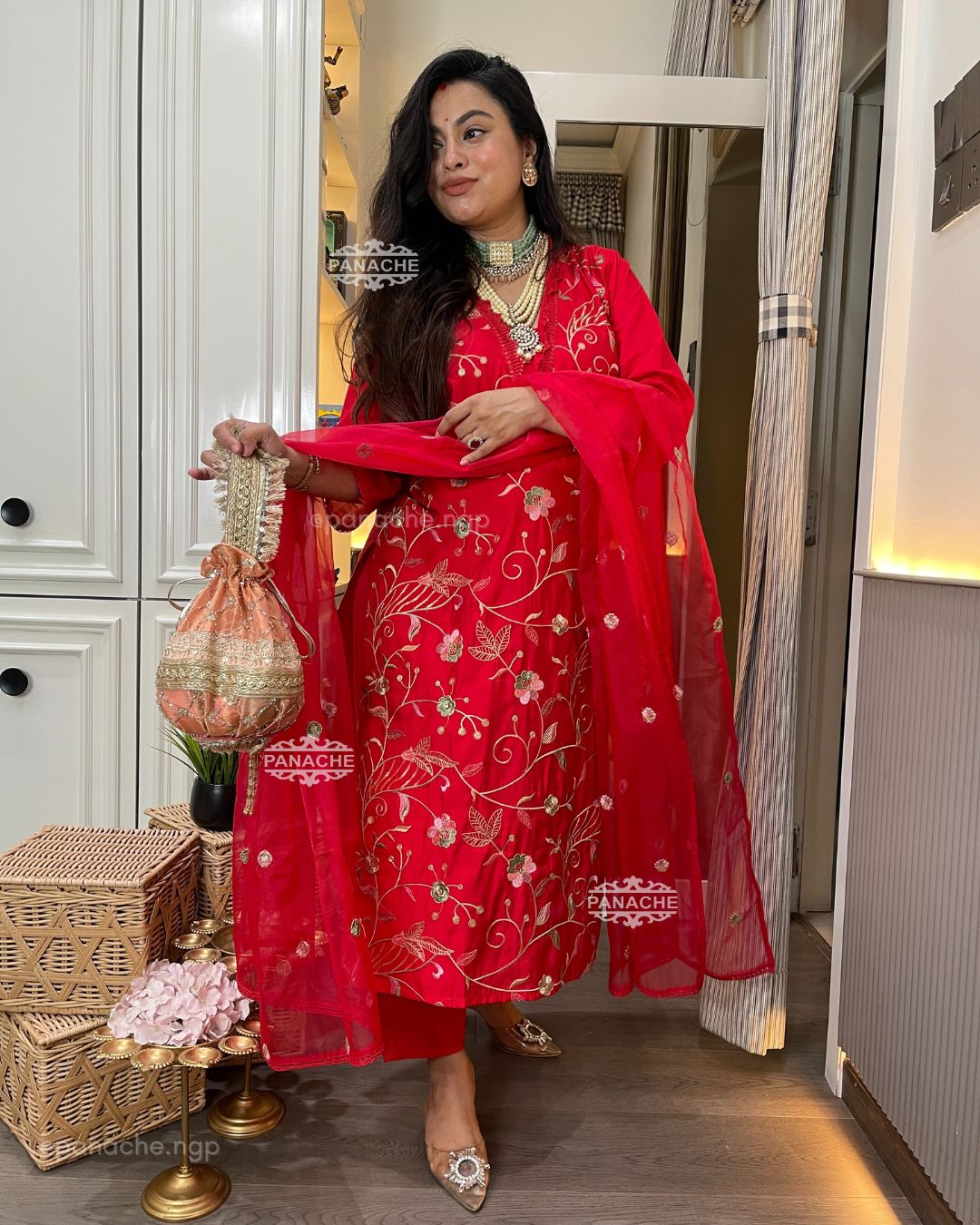 🟣 Embroidered kurta with buttas all over dupatta and plain pants and detailed neckline