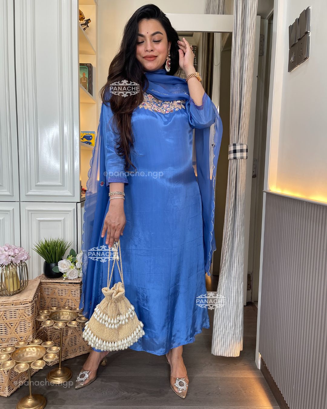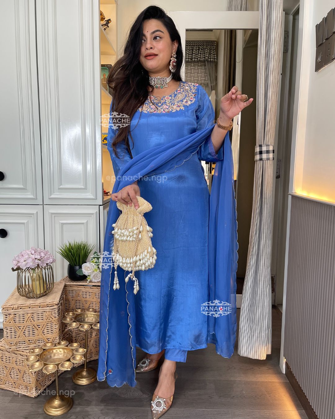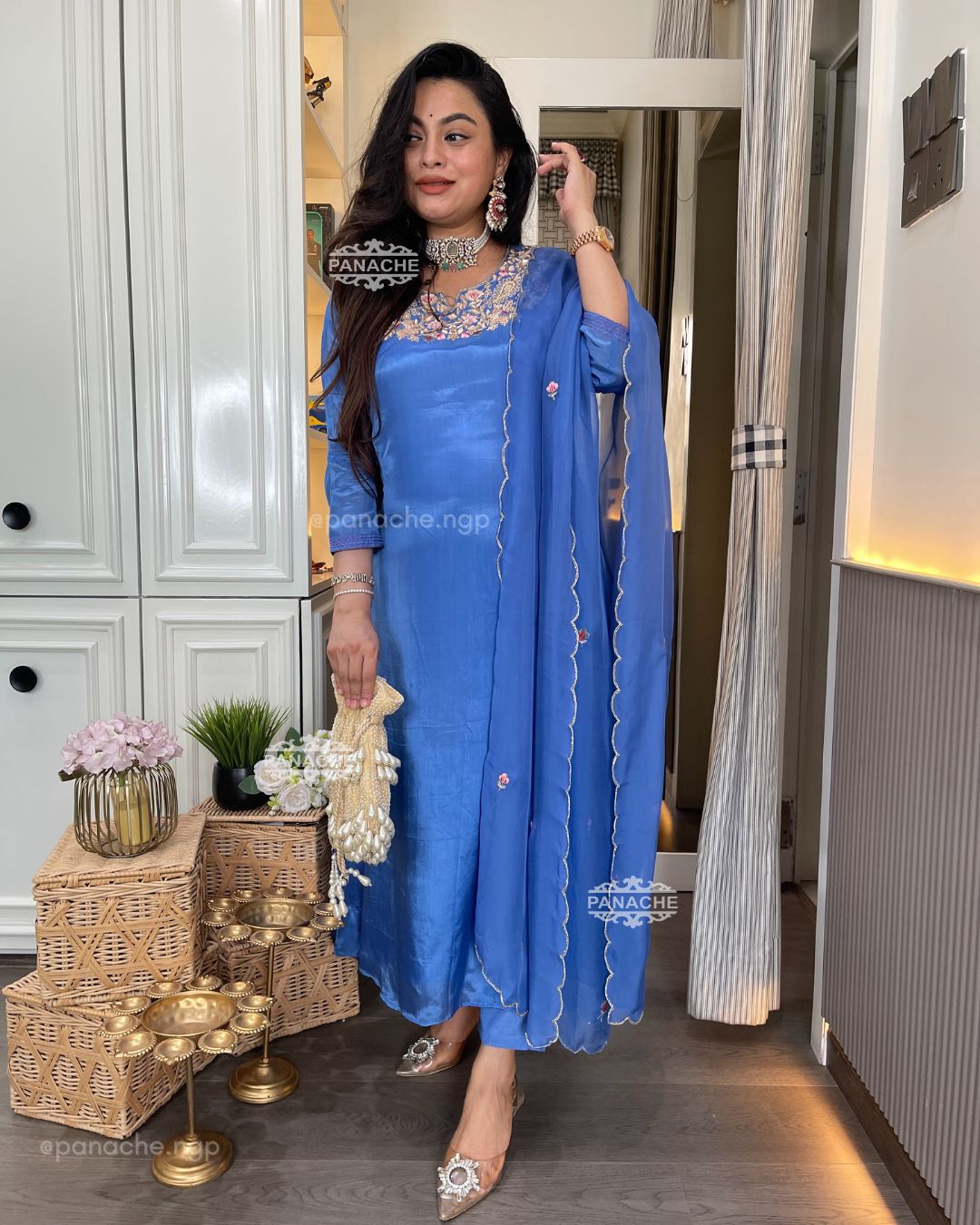 🟣 Heavy delicate handcrafted neckline with nakshi and zardoz with small buttas on cut pipe scalloped dupatta