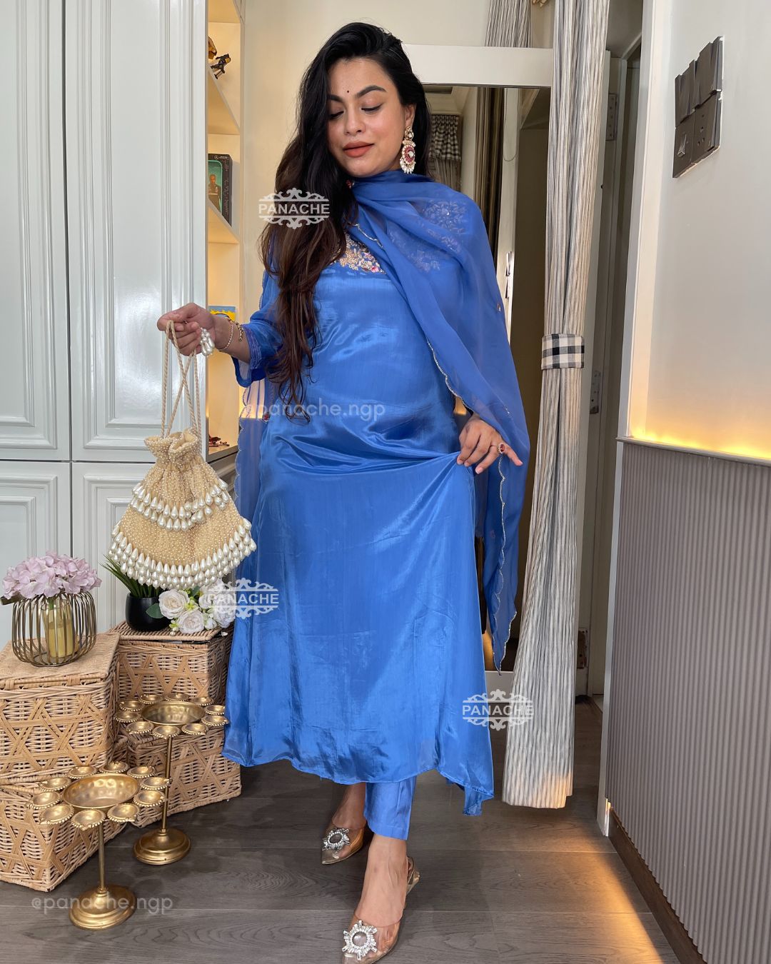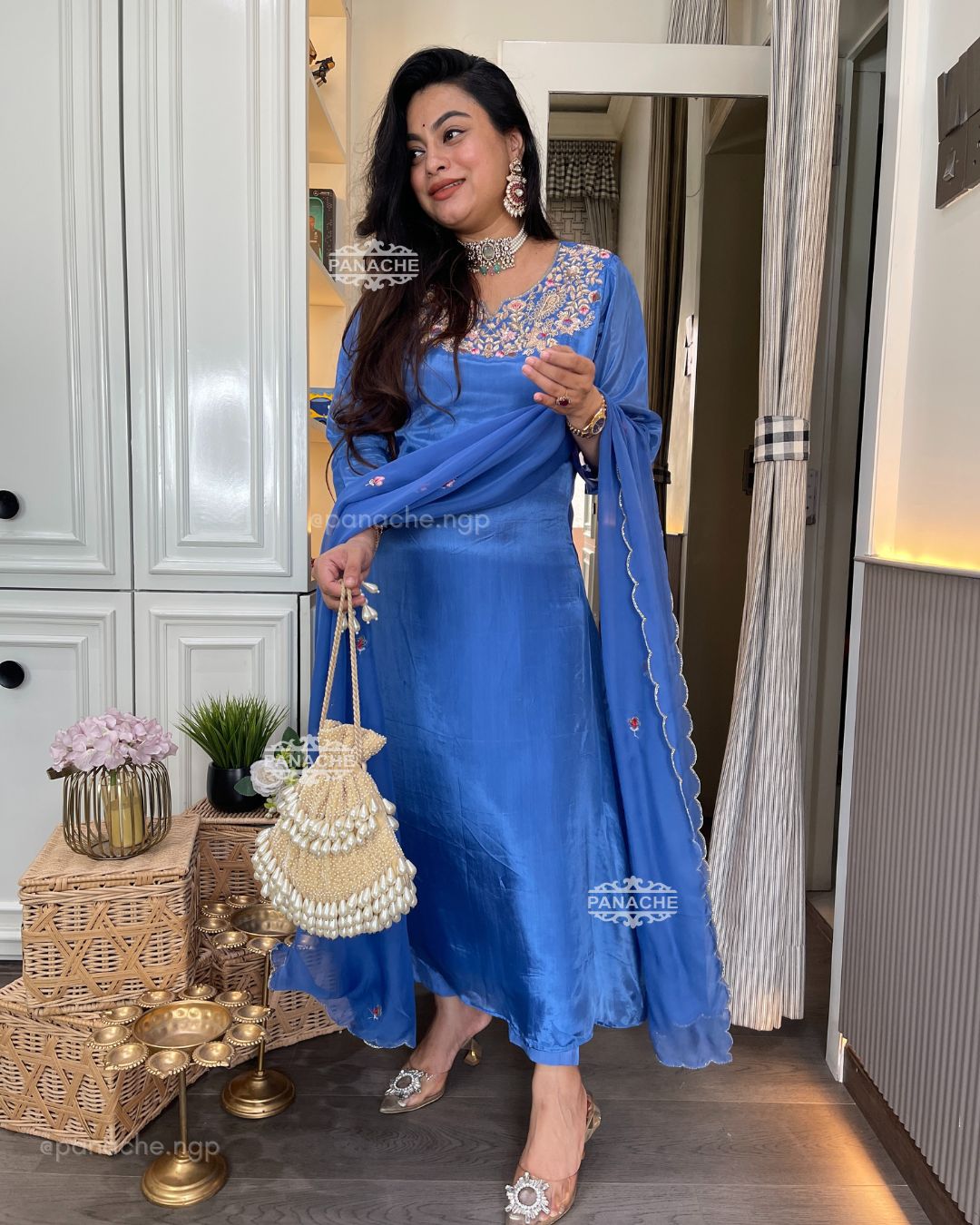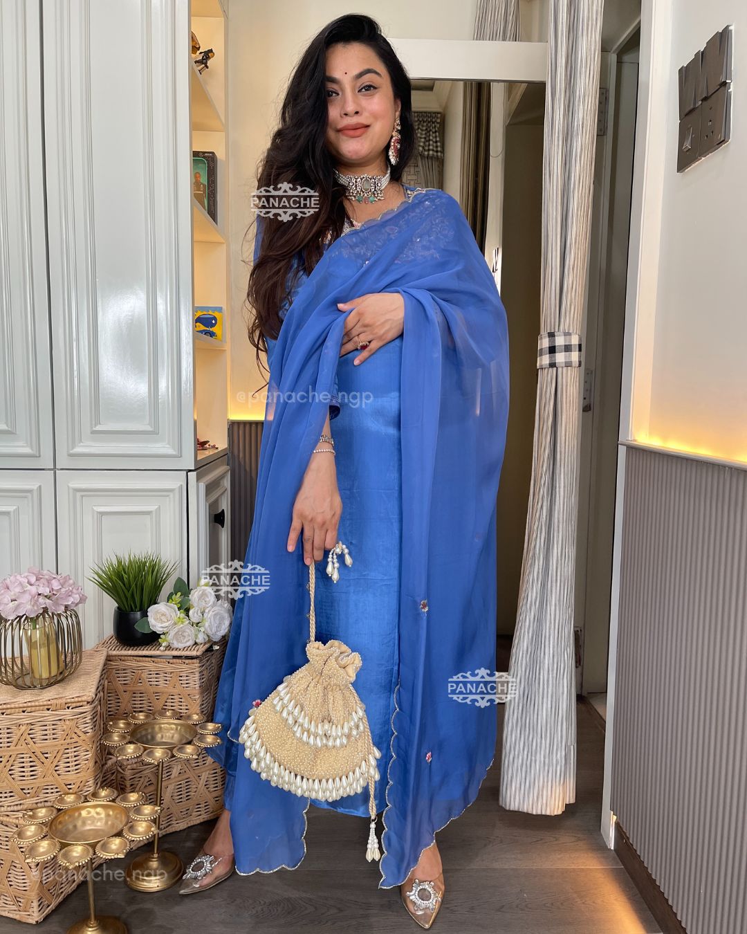 🟣 Heavy delicate handcrafted neckline with nakshi and zardoz with small buttas on cut pipe scalloped dupatta