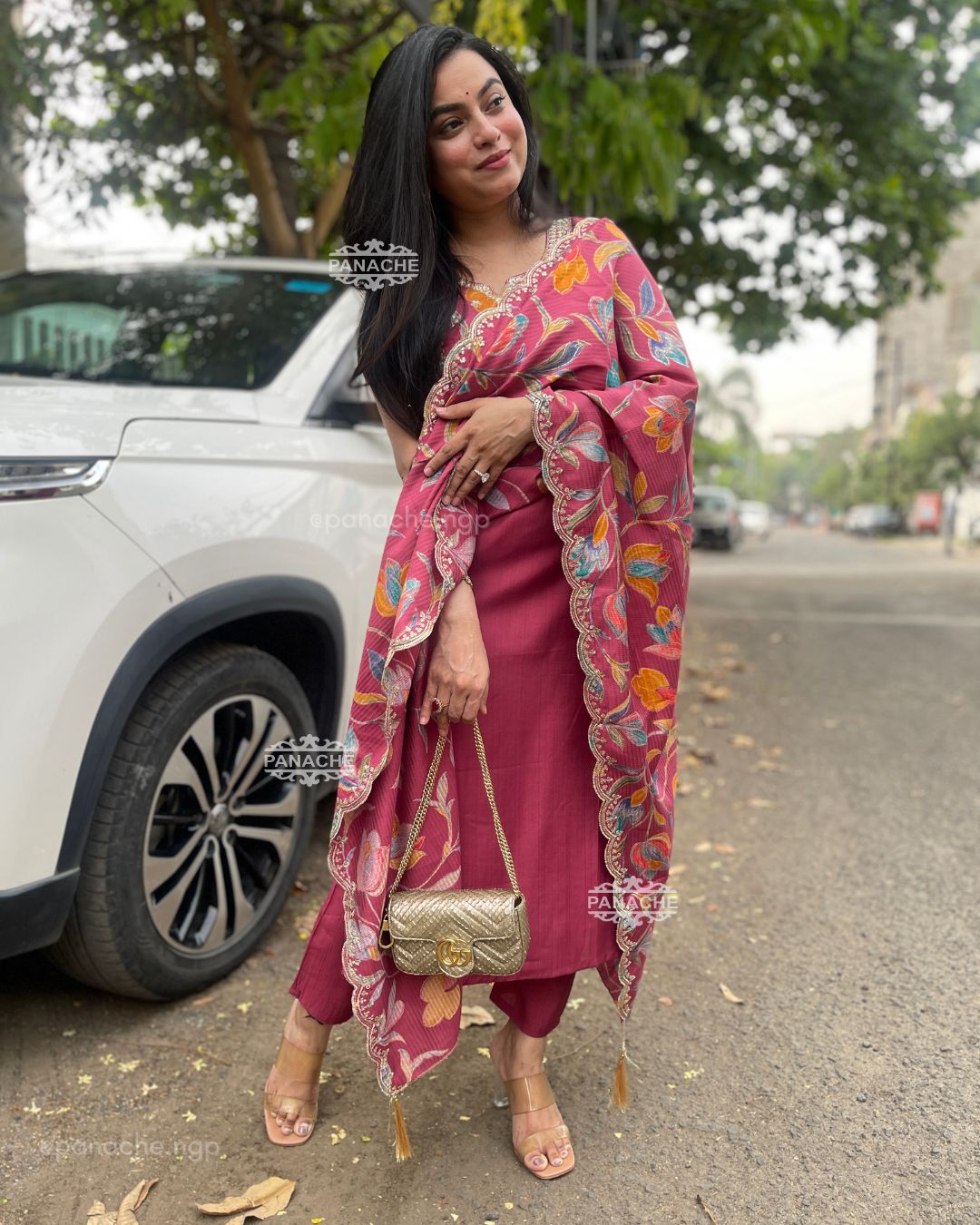 🟣 Appliqué neckline with scalloped embroidered dupatta