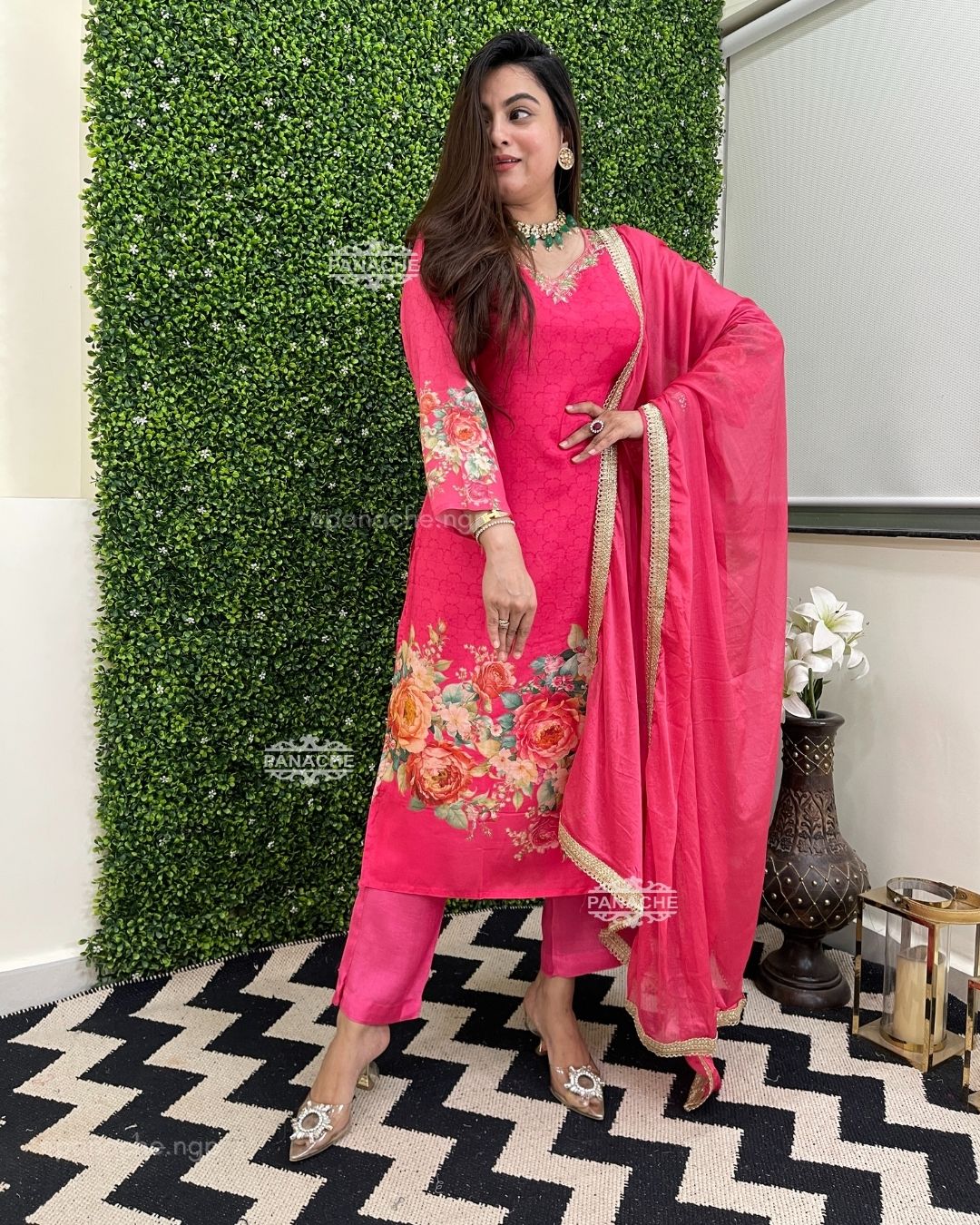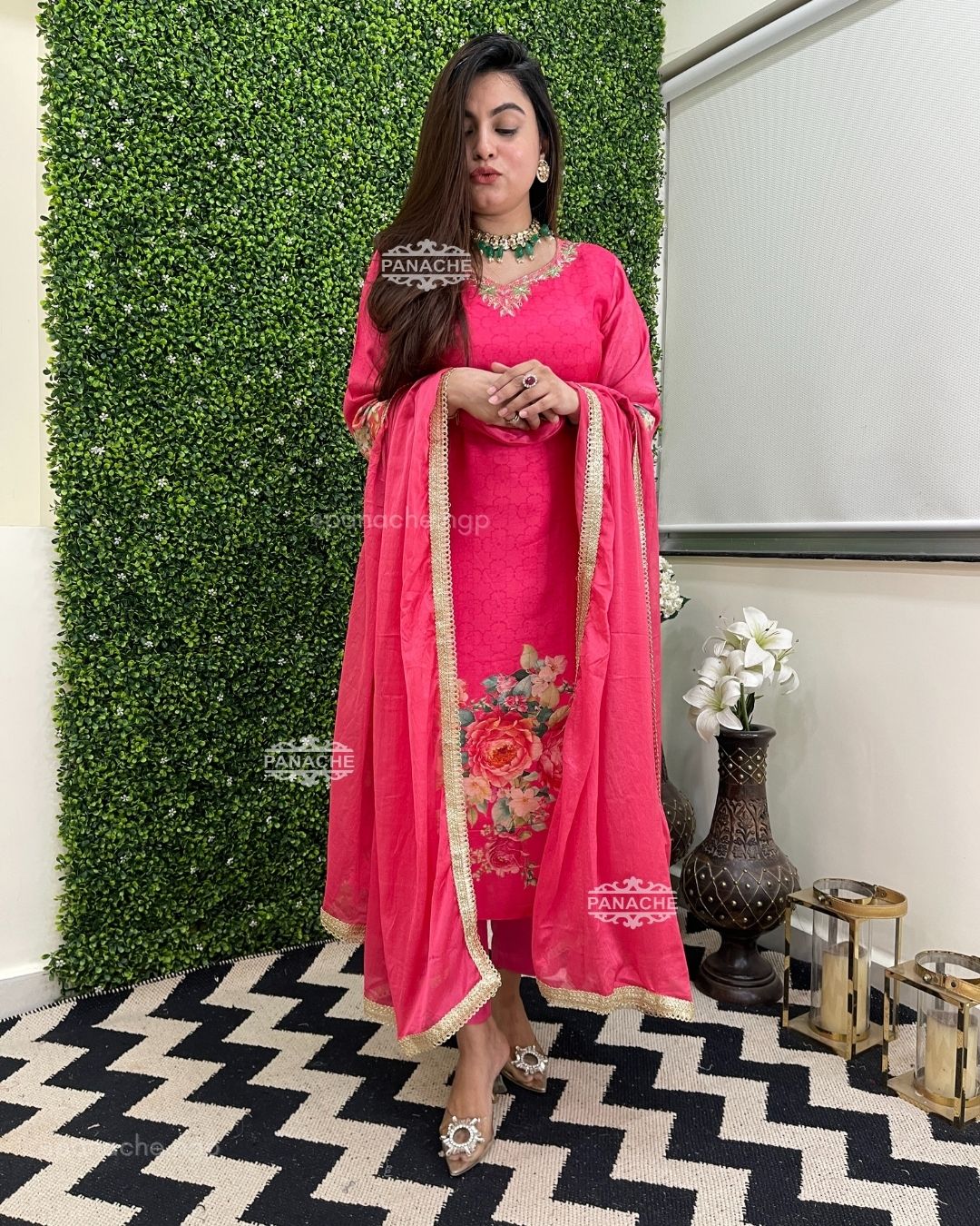 🟣 On sleeves daman and plain pants to match the flowers, all sides border on dupatta