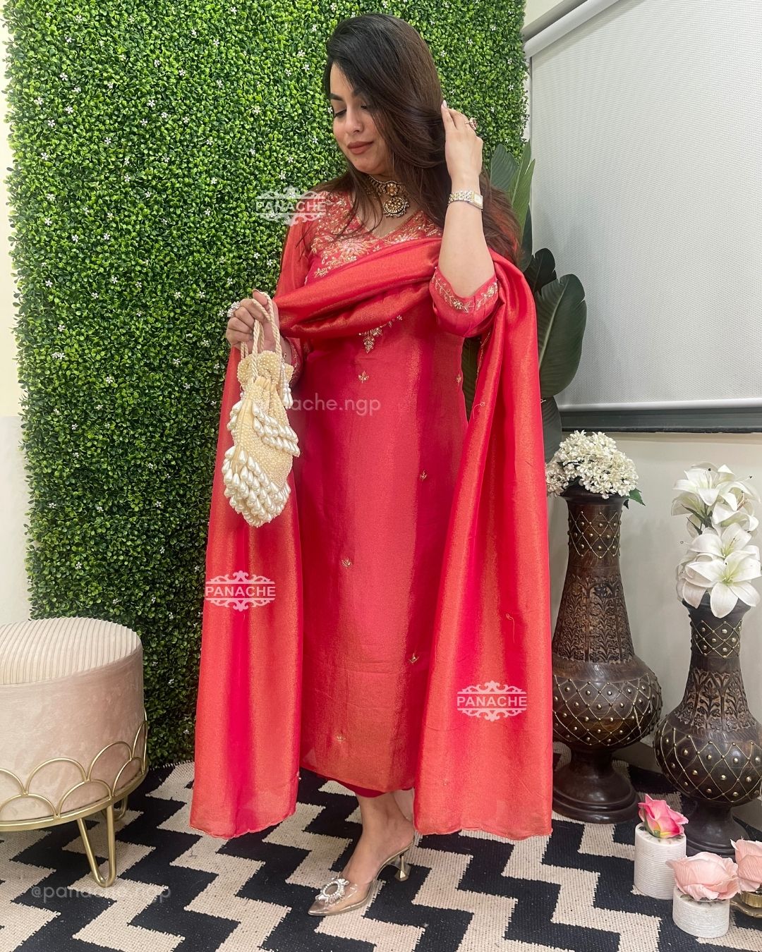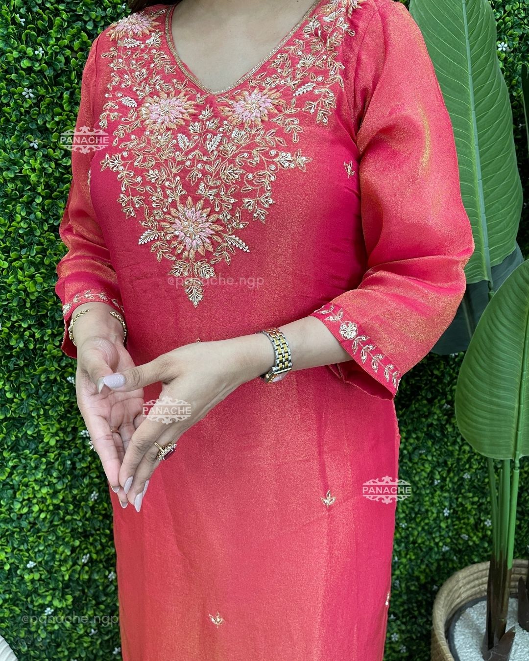 🟣 Zardoz frenchknot intricate neck with scallop and Hotpink pants, tissue Orgenza is dhupchao two tone effect