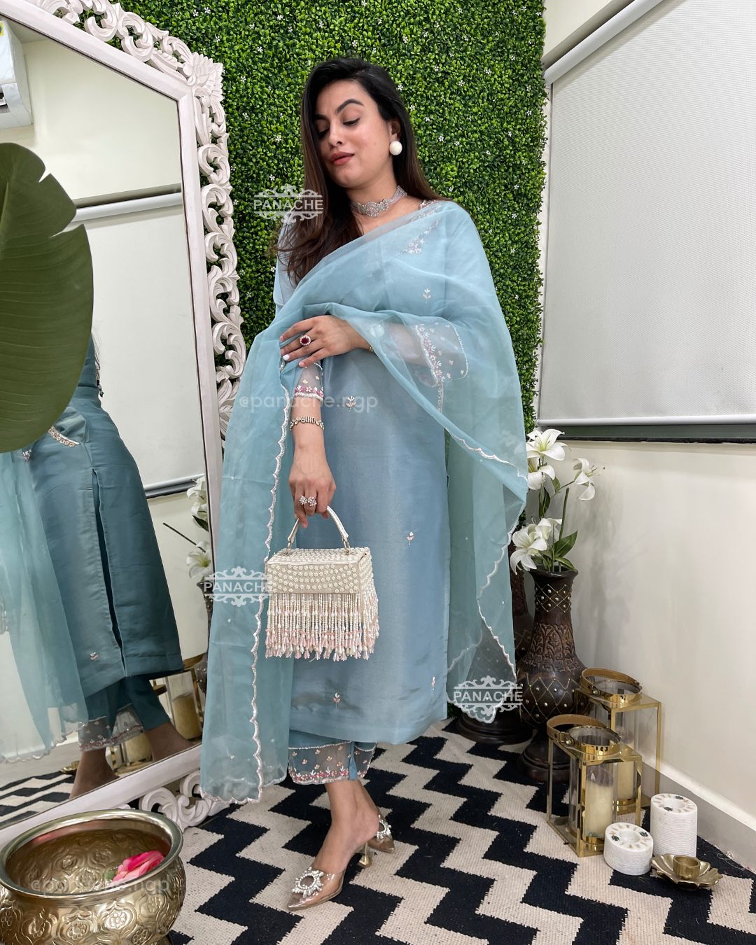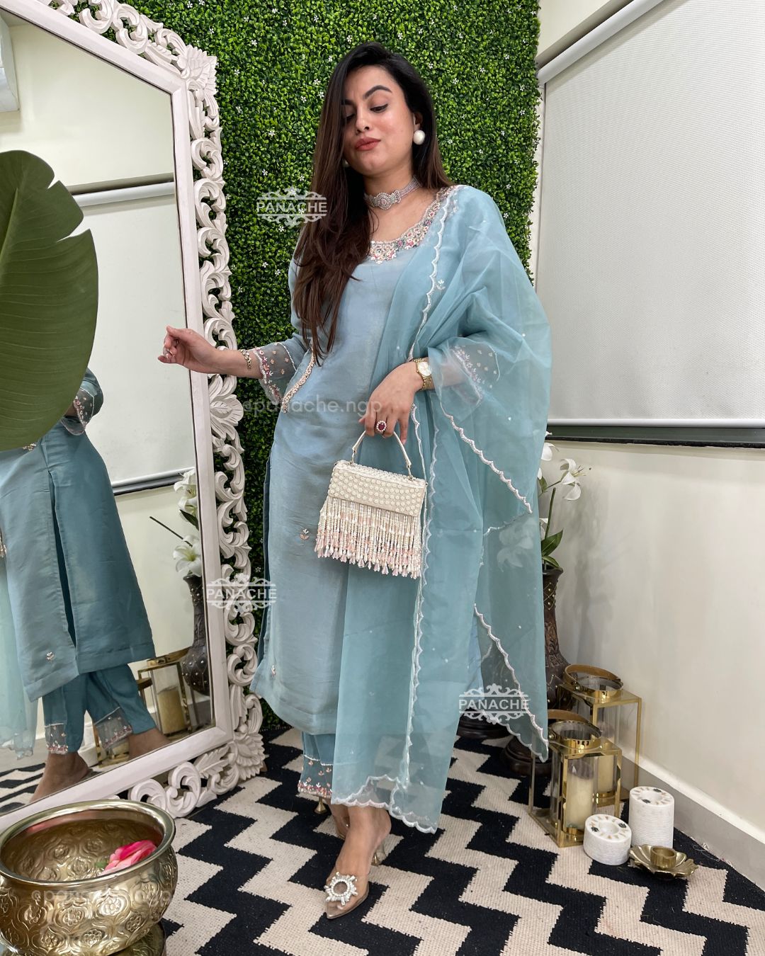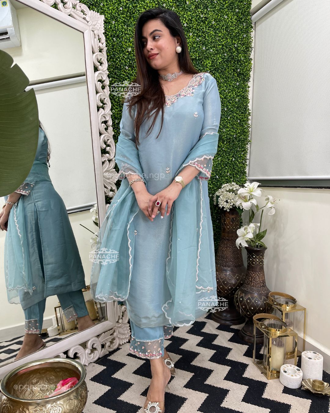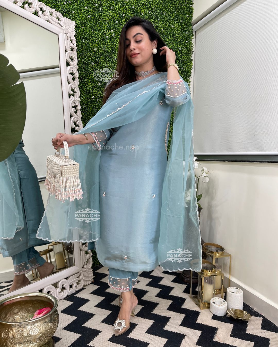 🟣 The most delicate pearl pink n blue handwork in neckline sleeves pants and scalloped dupatta with double line work