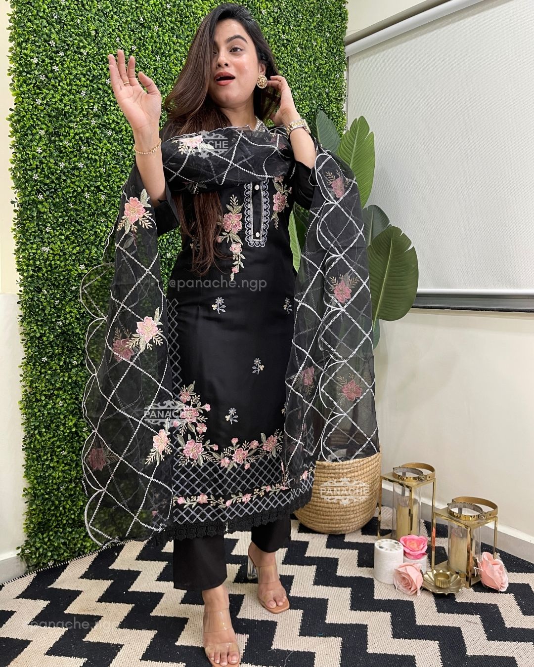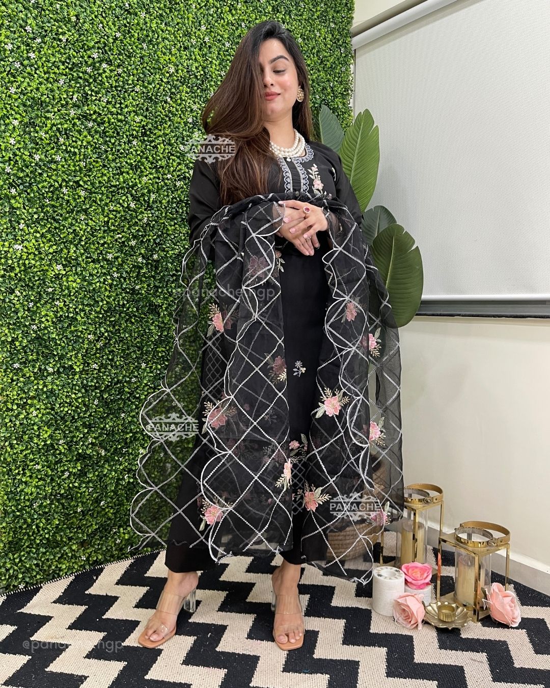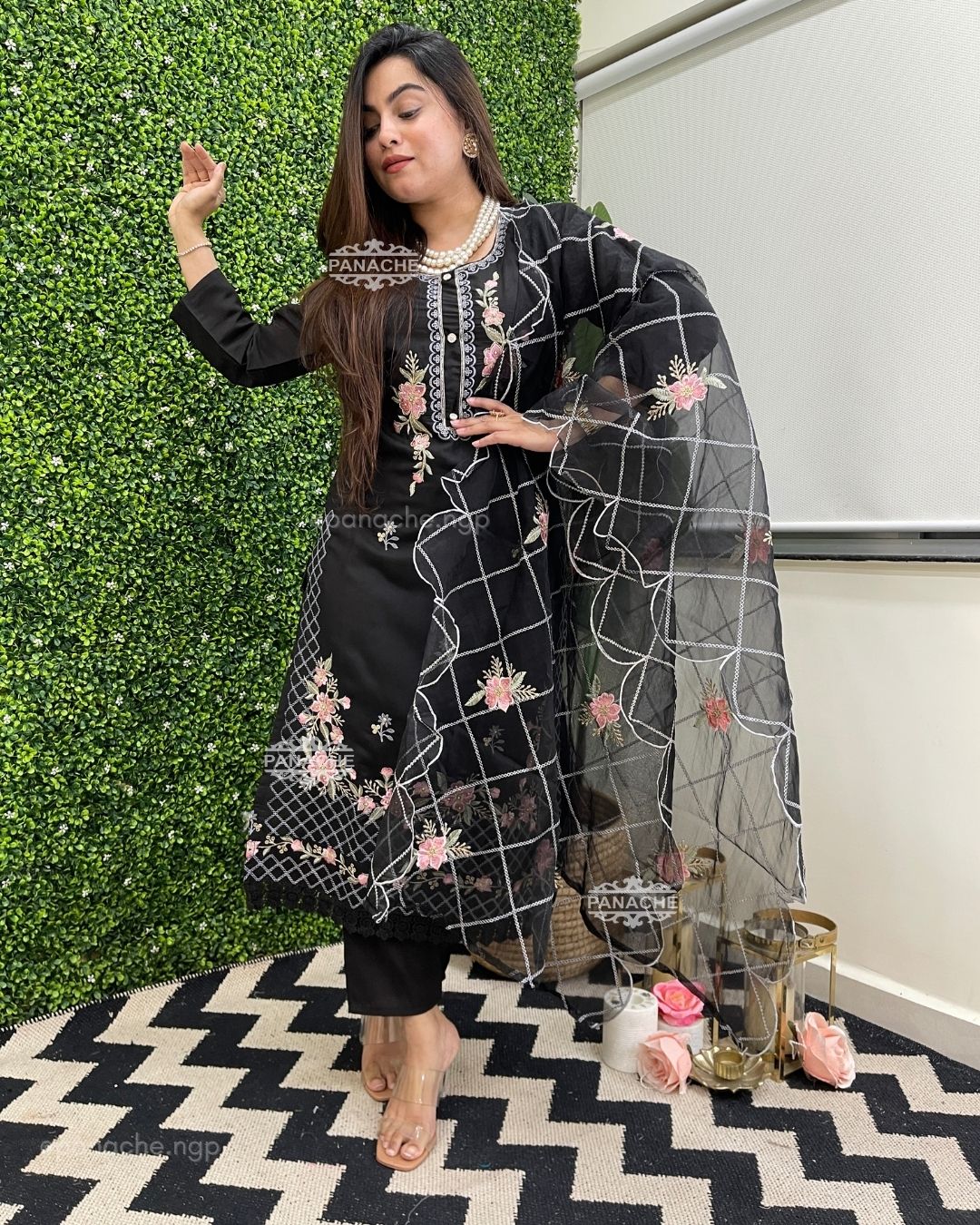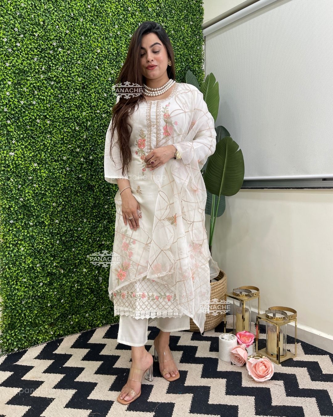 🟣 Embroidery on neckline, kurta scalloped dupatta and plain pants