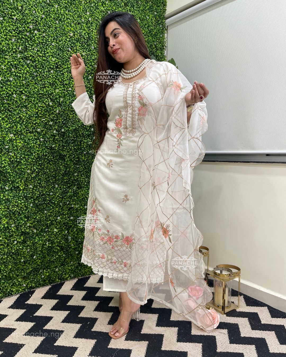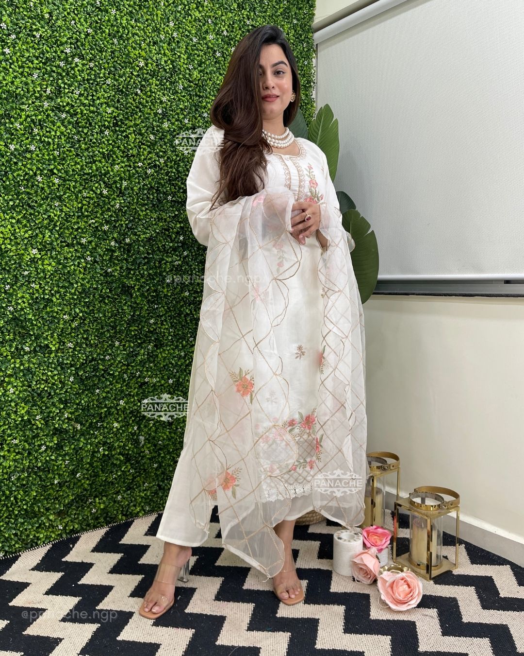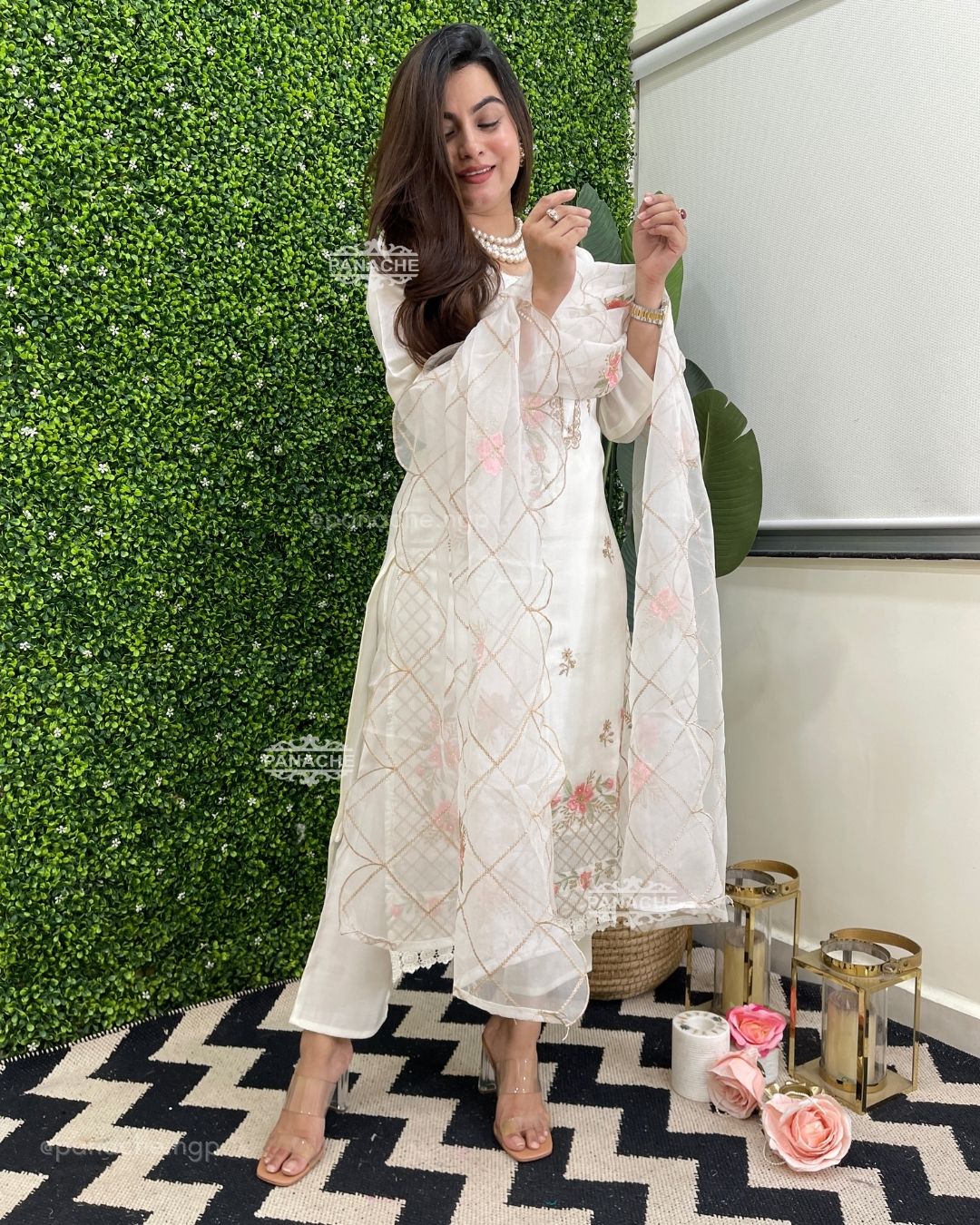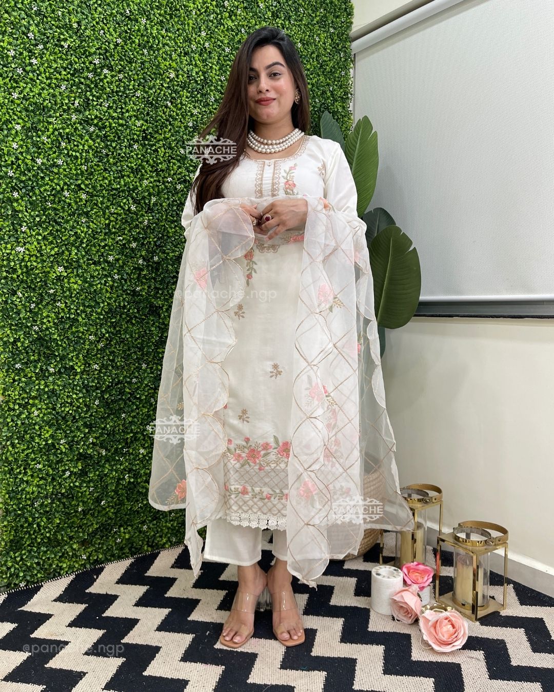 🟣 Embroidery on neckline, kurta scalloped dupatta and plain pants