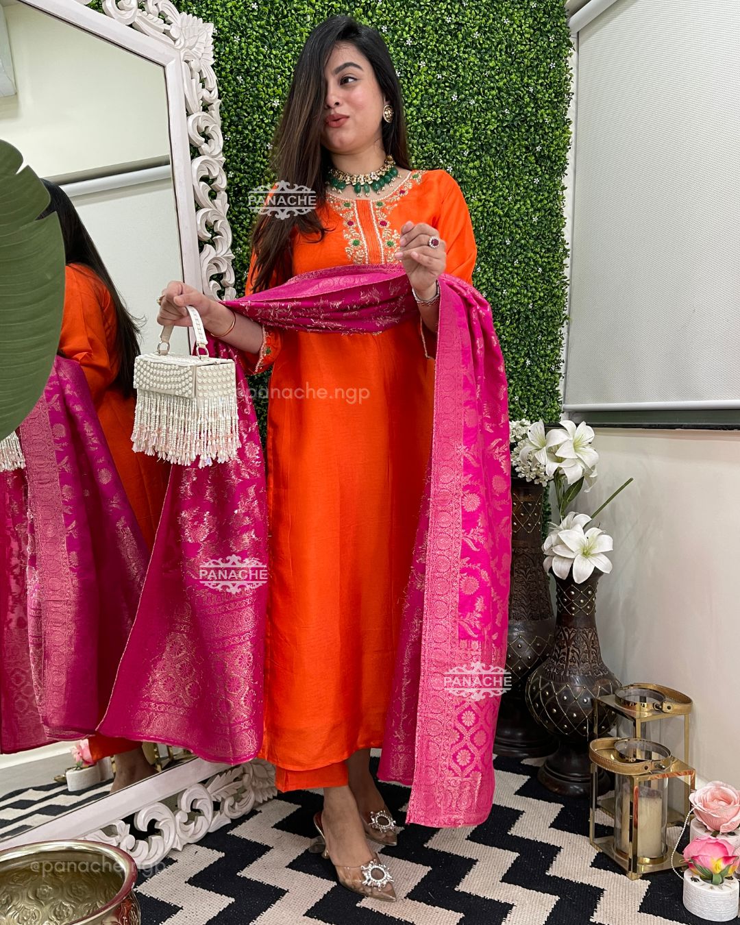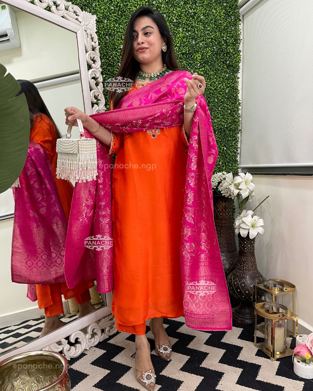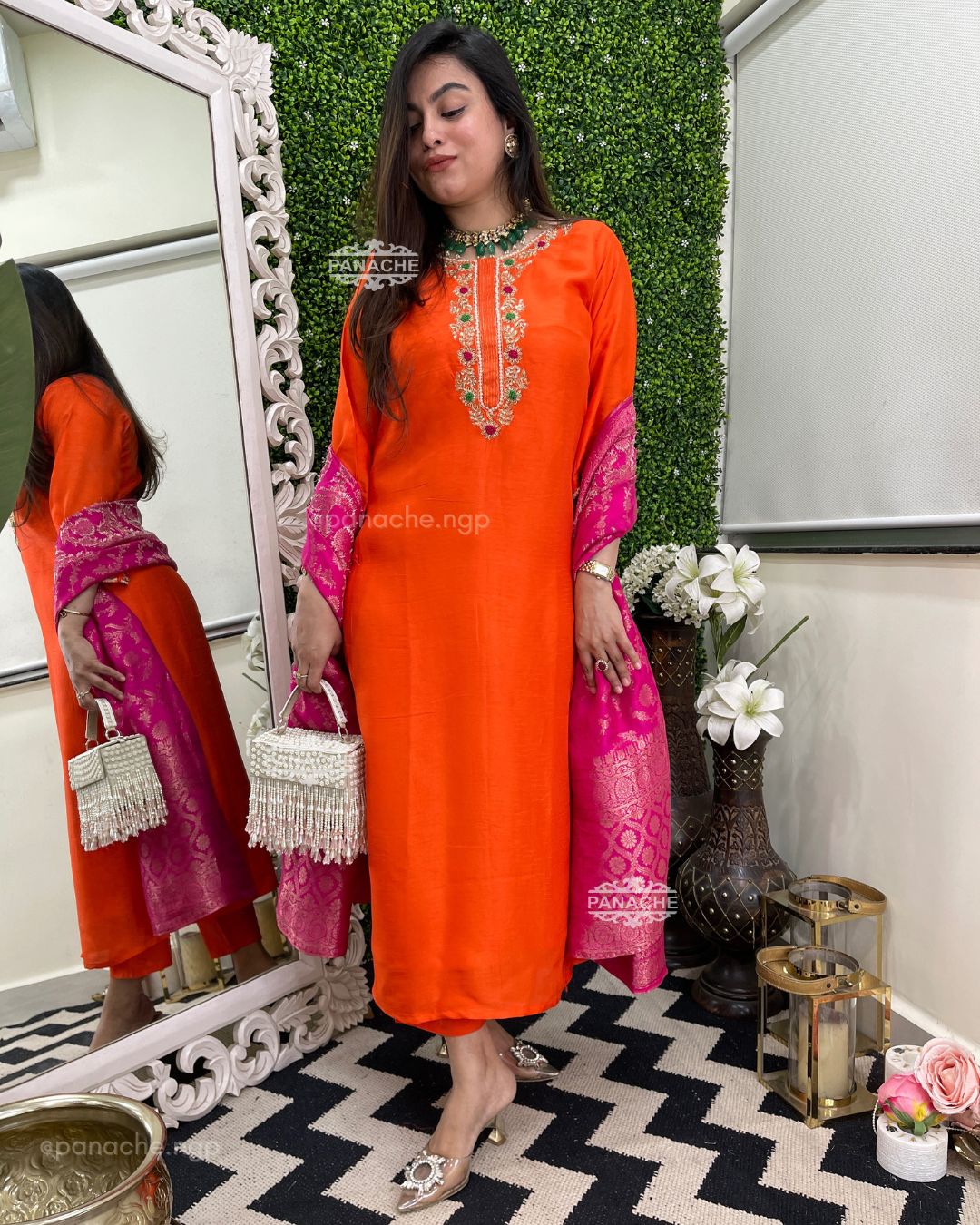🟣 Sunny orange and fuschia pink combo with pure handwork neckline and sleeves details & a hand-woven dupatta