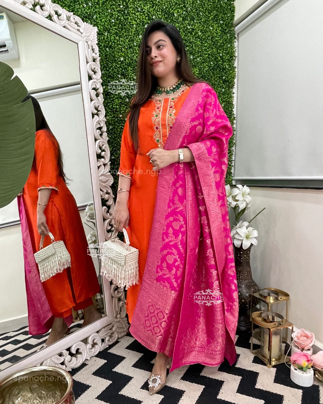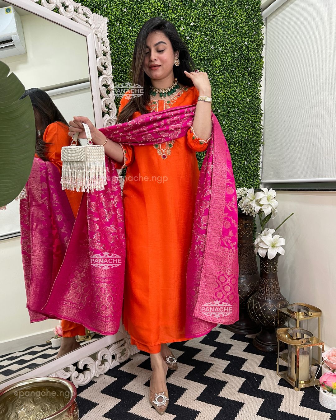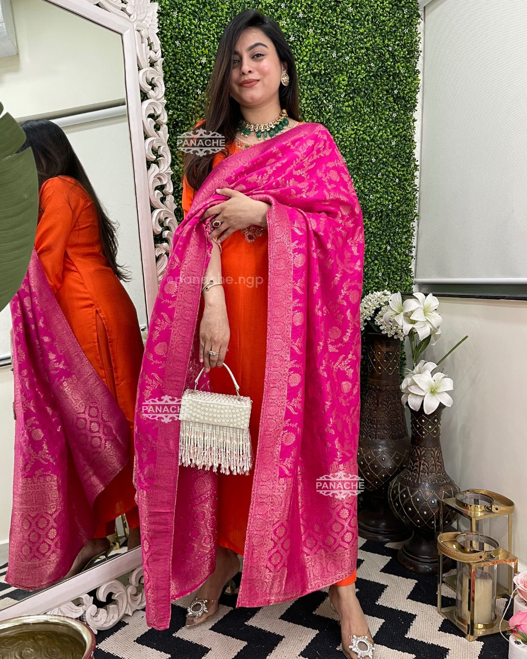 🟣 Sunny orange and fuschia pink combo with pure handwork neckline and sleeves details & a hand-woven dupatta