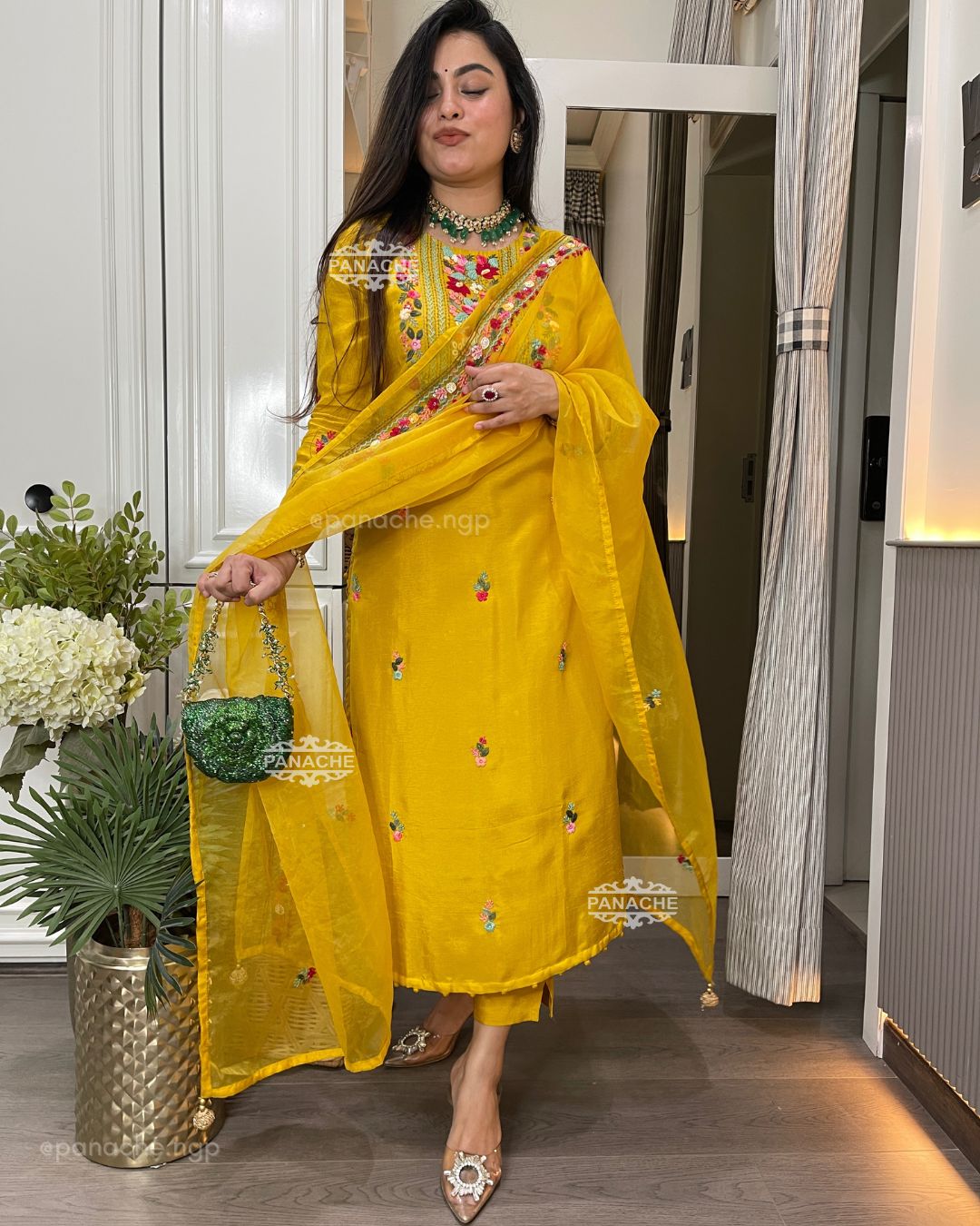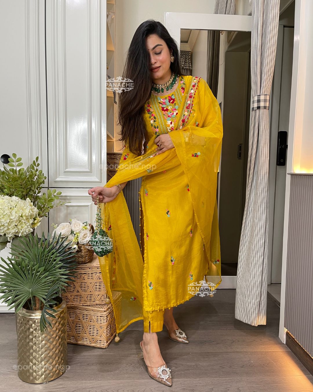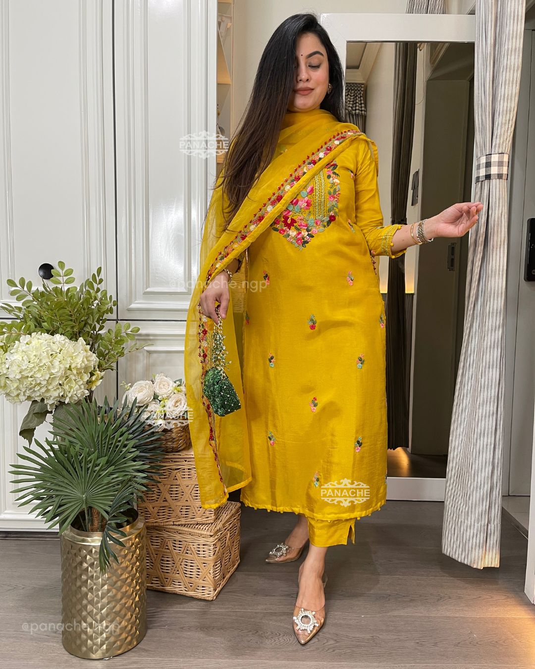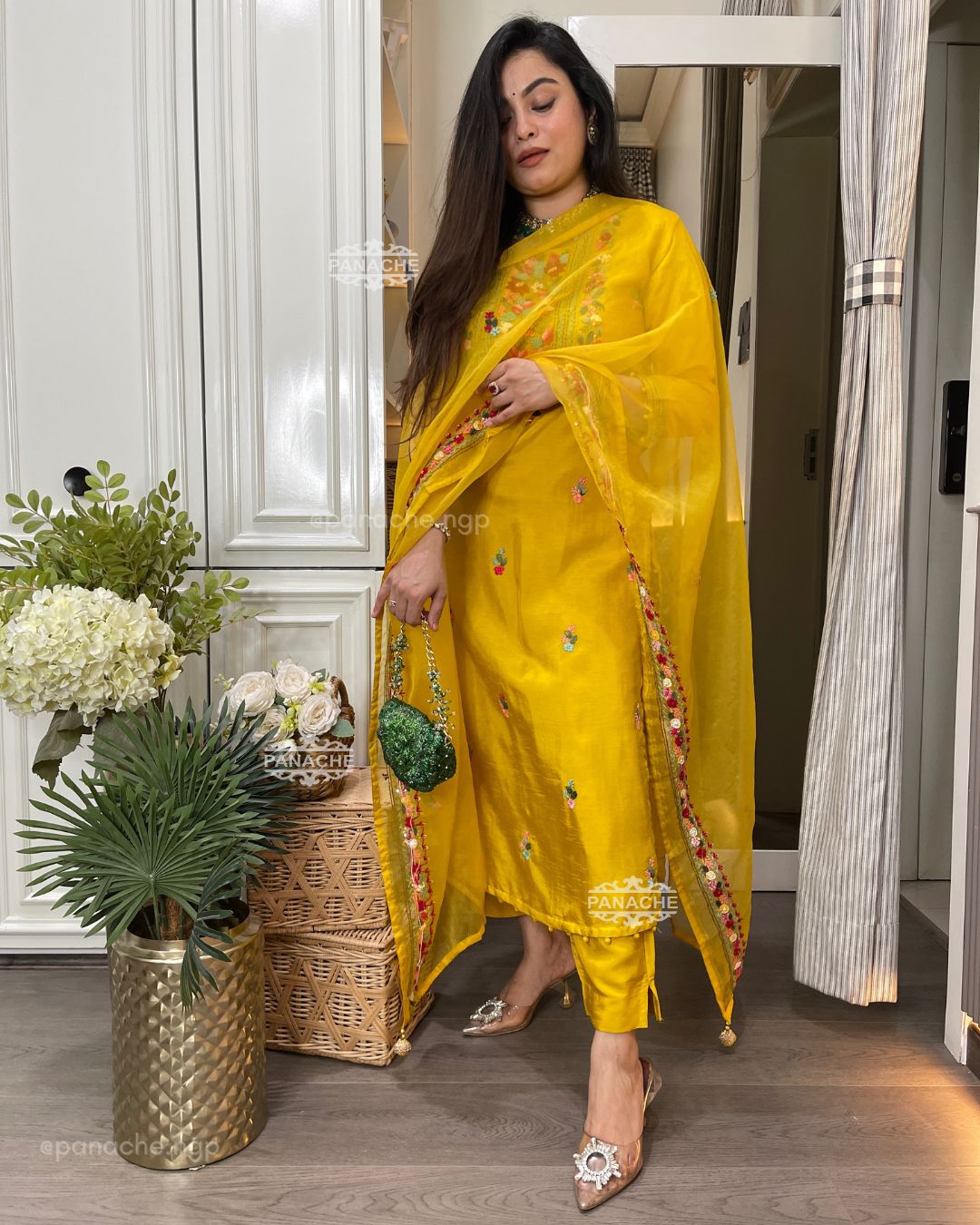 🟣 It’s fresh as a flower and the handmade French knot and delicate spring flowers would always remind you of fragrant flowers, heavy spring work on dupatta with buttis all over kurta, dupatta & detailed sleeves