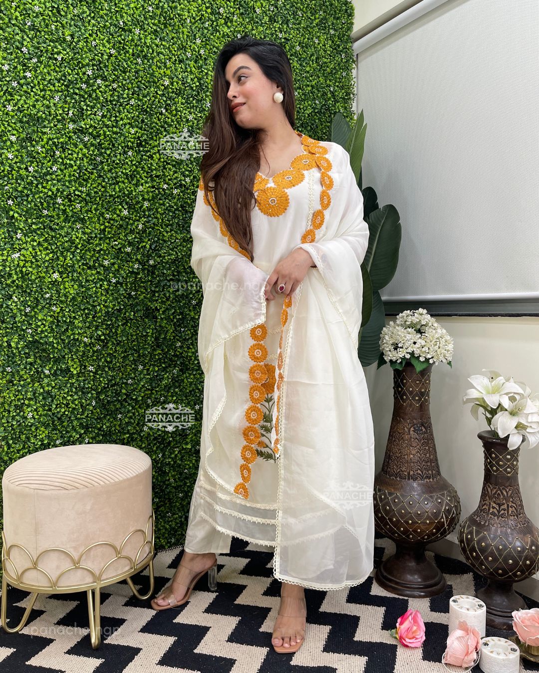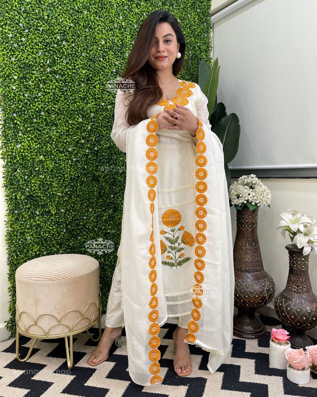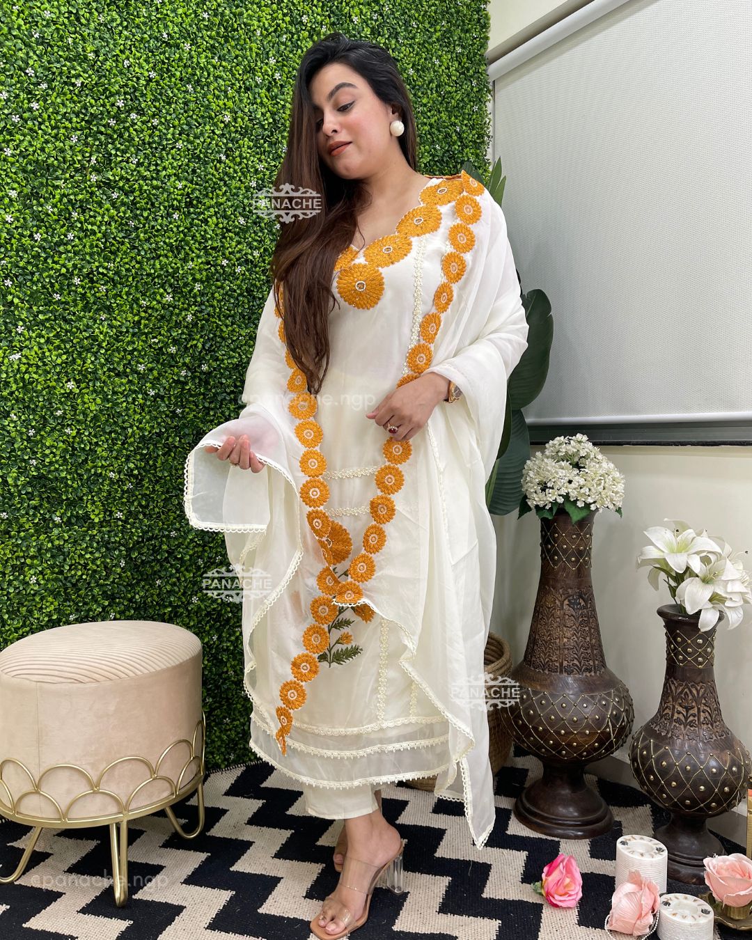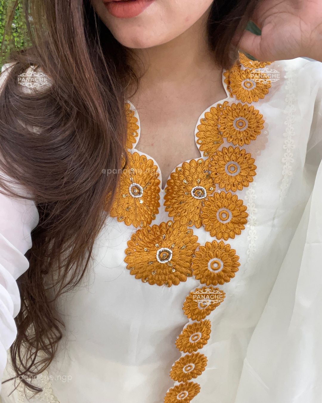 🟣 A breath of freshness & nazakat in our sunflower special , applique on kurta and cutwork dupatta, neckline orgenza set