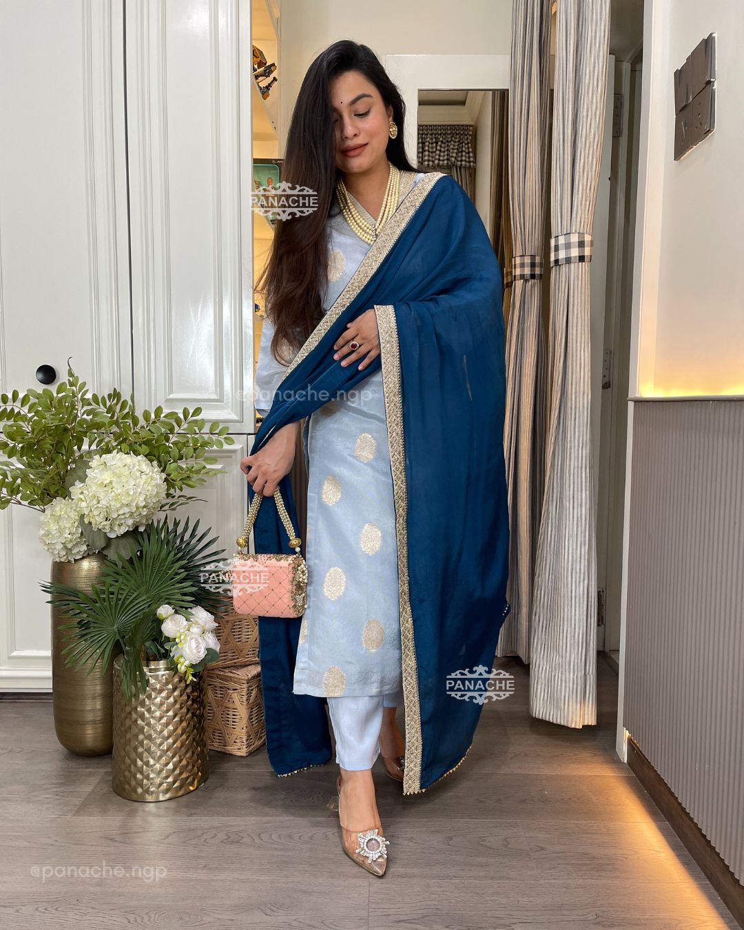 🟣 Zari neckline with self Banarasi chinnon kurta and the fabric is pure luxury