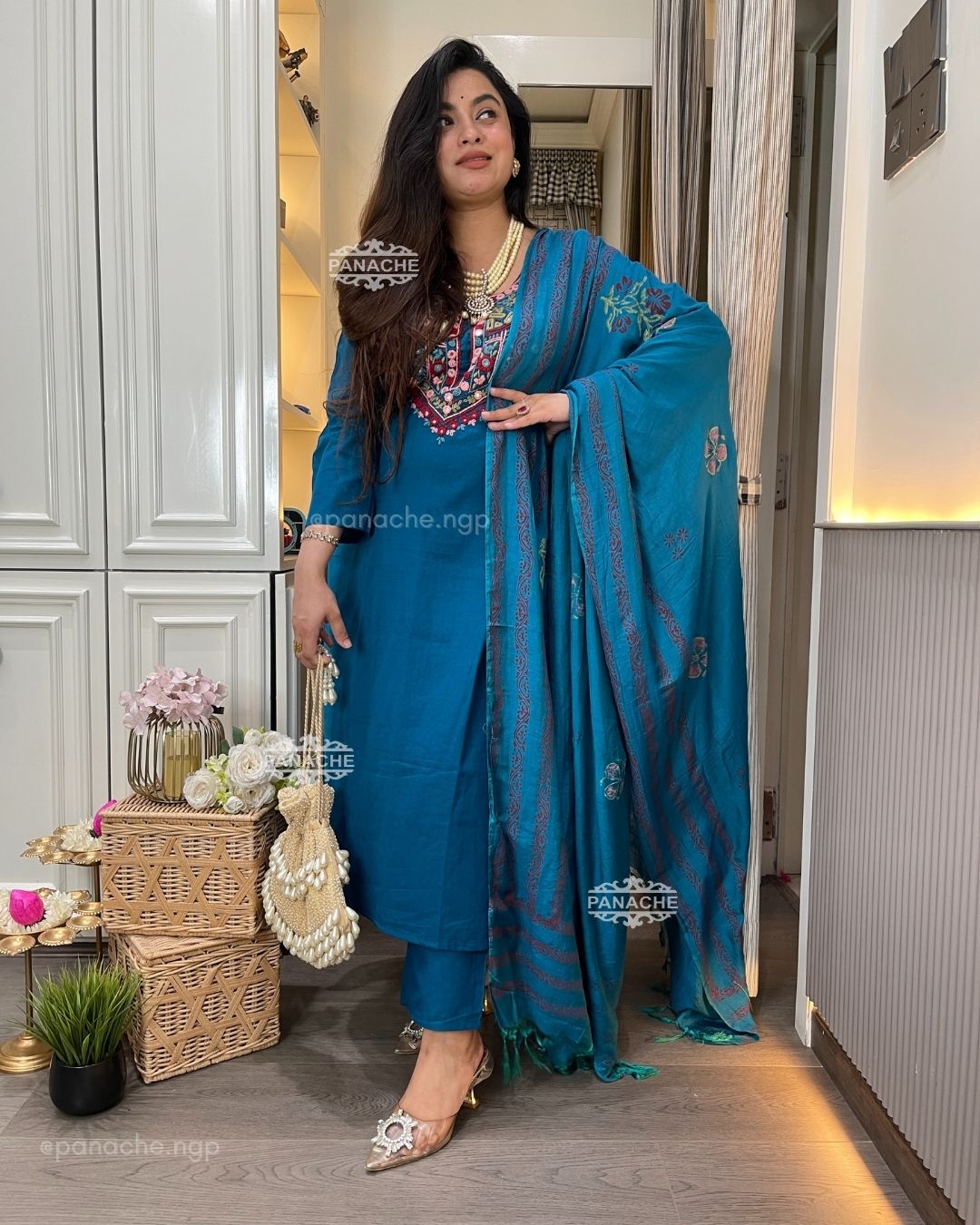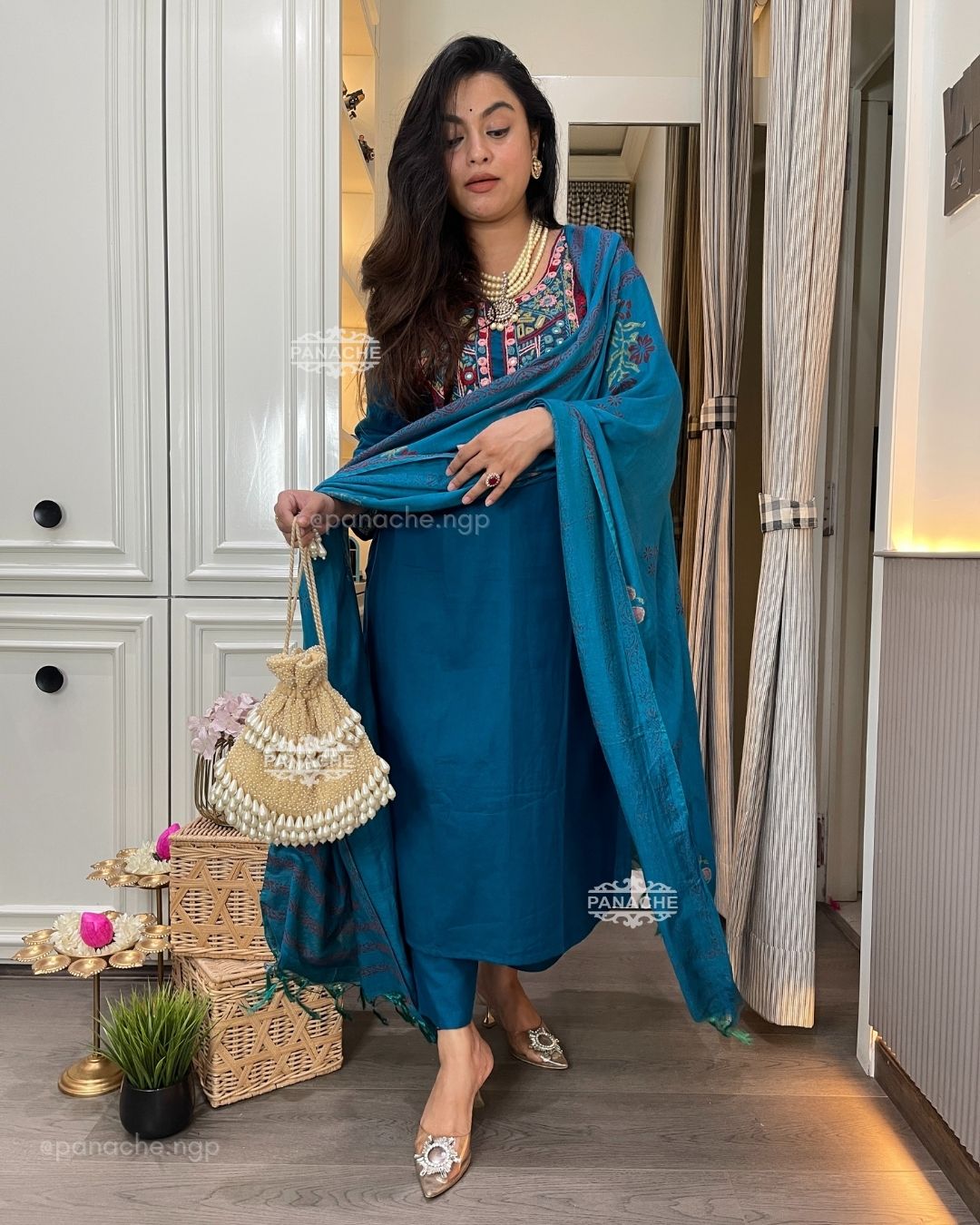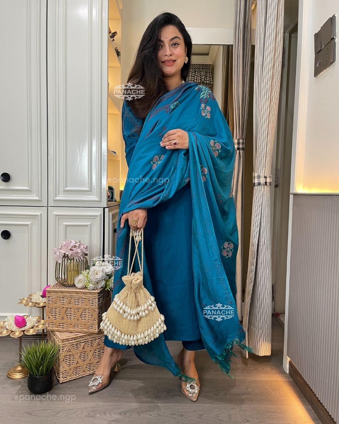 🟣 A elegant handblock dupatta with Kashmiri handwork with real mirrors and spring work on neckline, dupatta has hand block prints done on the softest fabric