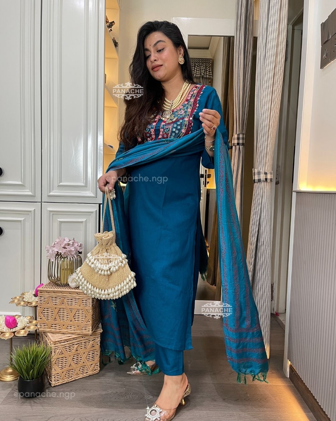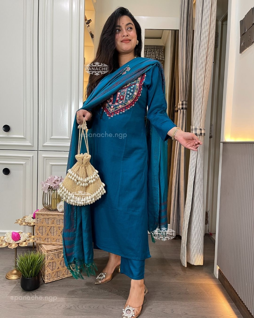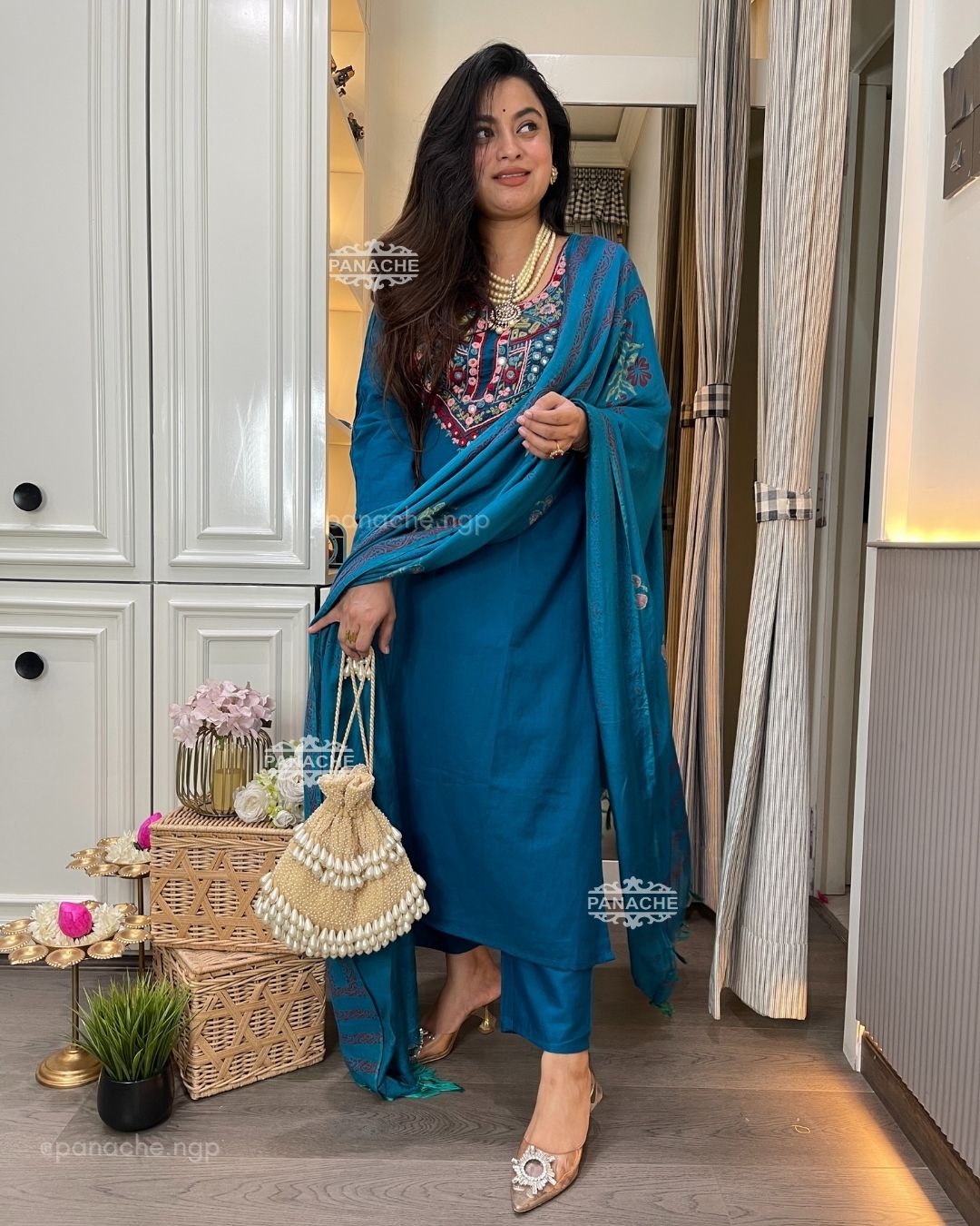 🟣 A elegant handblock dupatta with Kashmiri handwork with real mirrors and spring work on neckline, dupatta has hand block prints done on the softest fabric