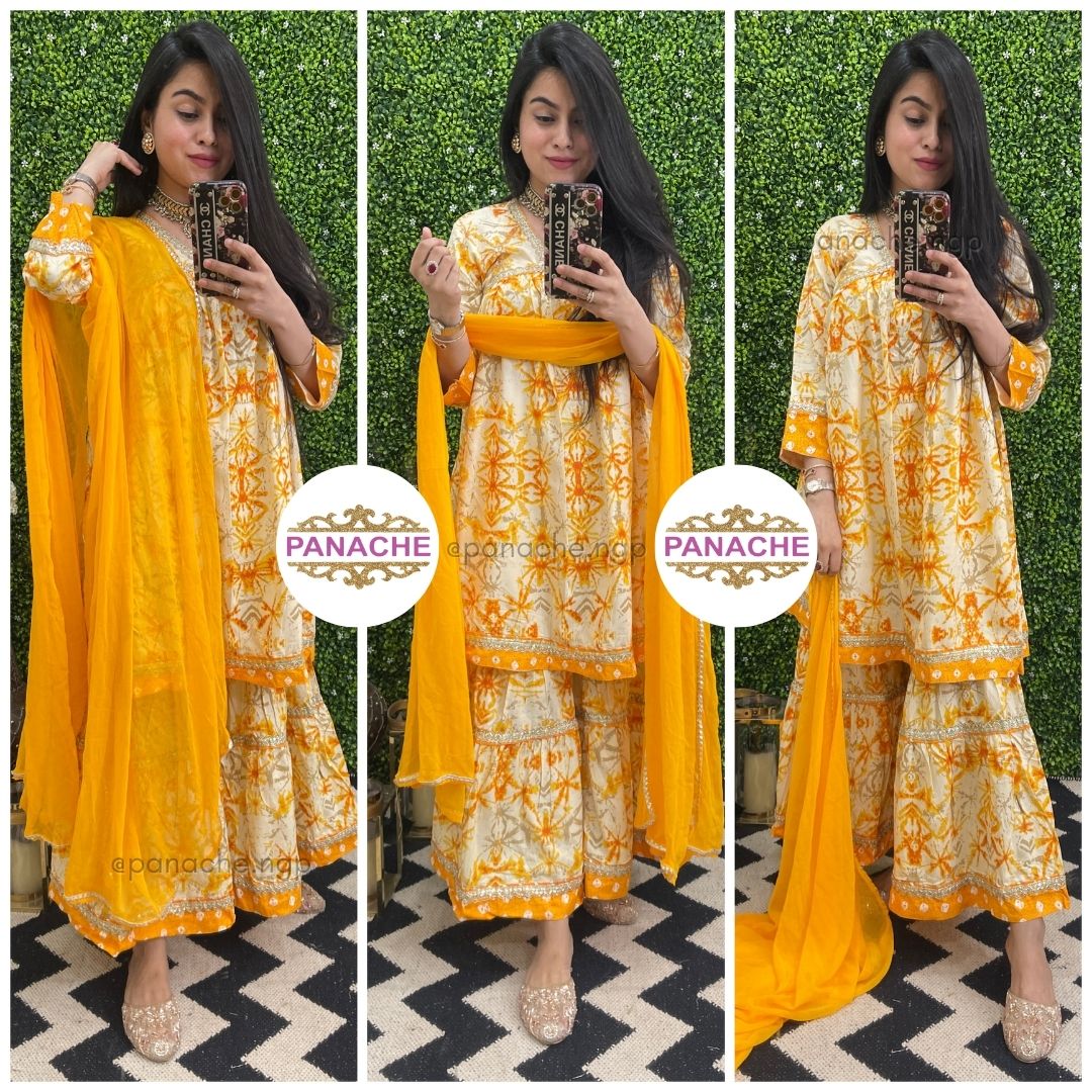 🟣 A beautiful neckline with gotta and bandhani details on sleeves daman of kurta and sharara