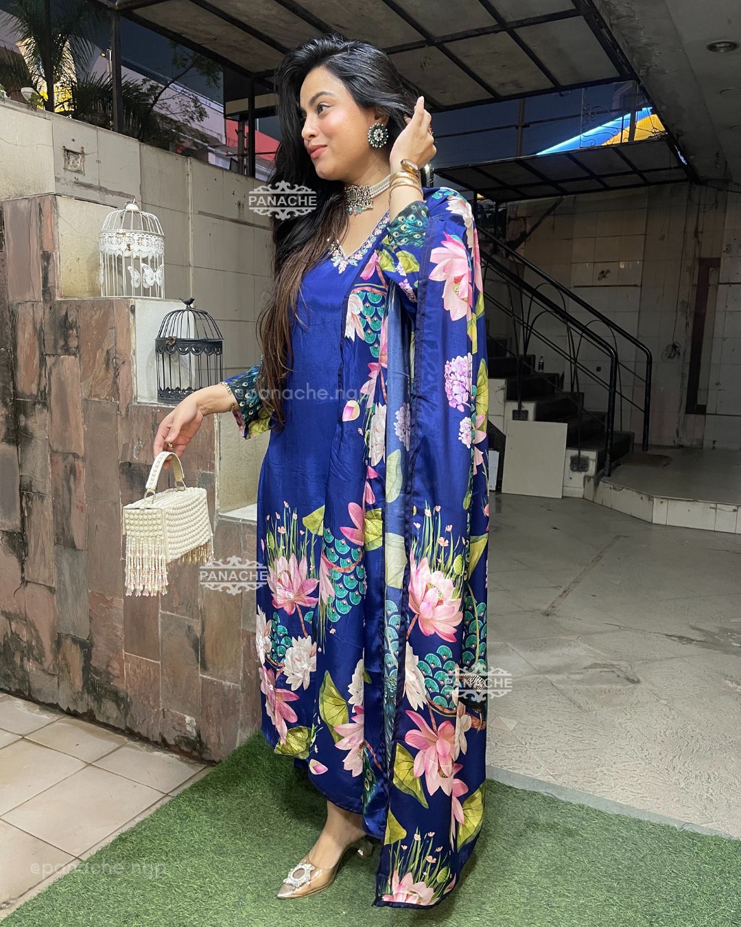 🟣 Pastel sequein neckline with handwork highlights on each flower on Daman and a full graceful floral dupatta