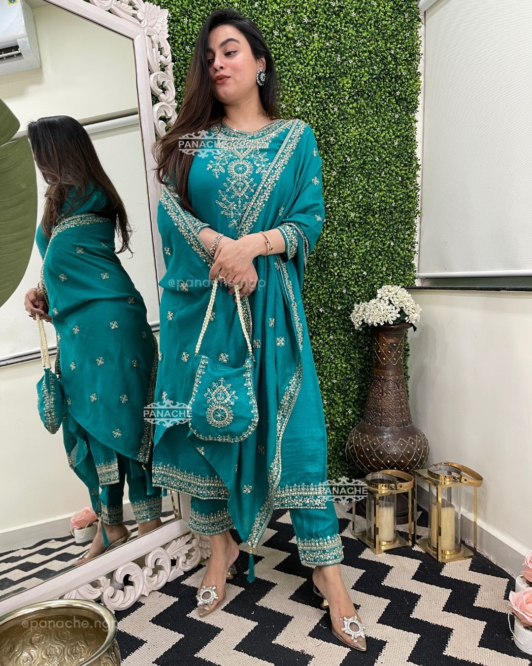 🟣 Embroidery on neckline sleeves Daman of kurta and pangs, heavy dupatta with tassels