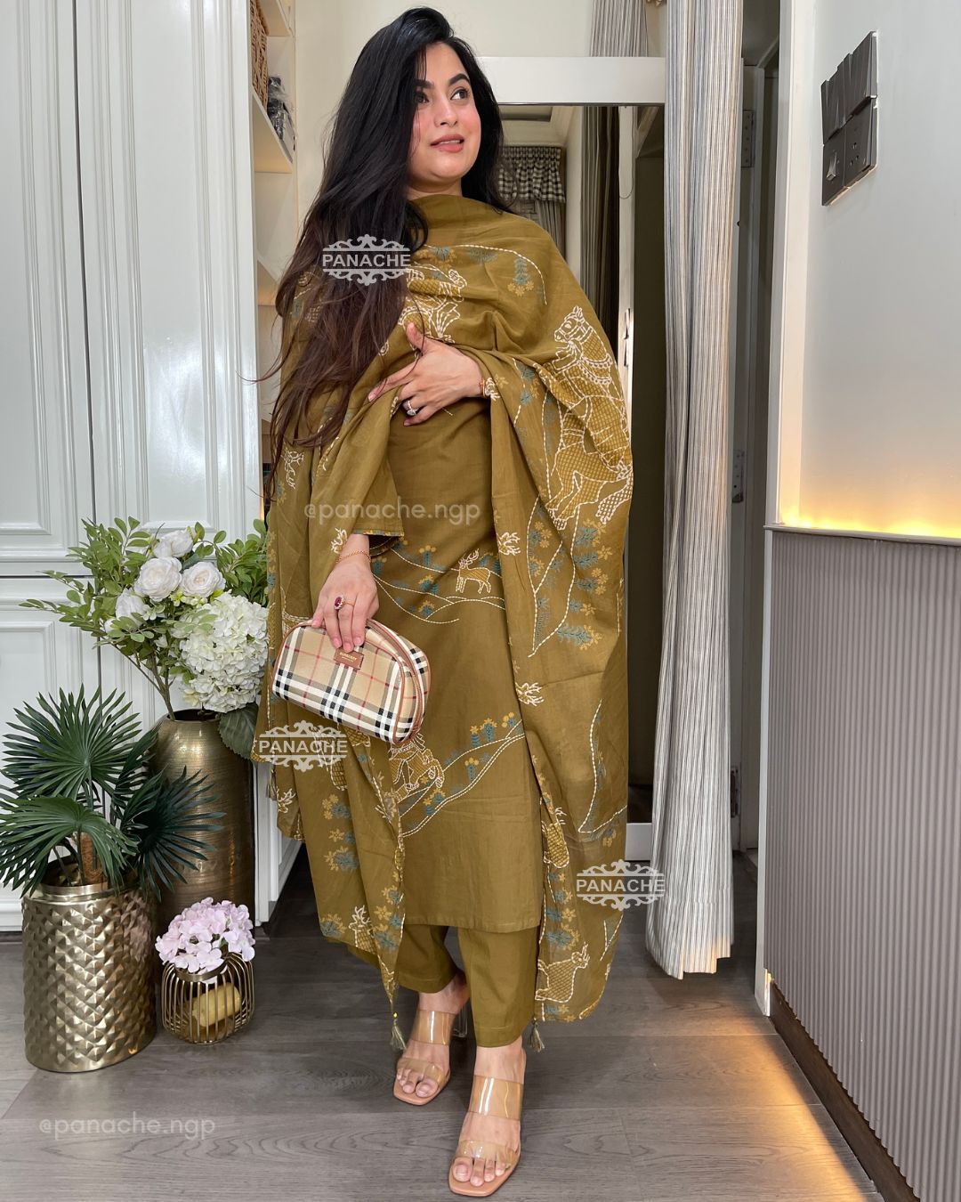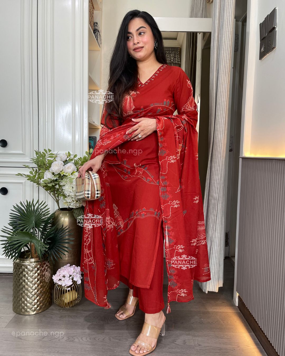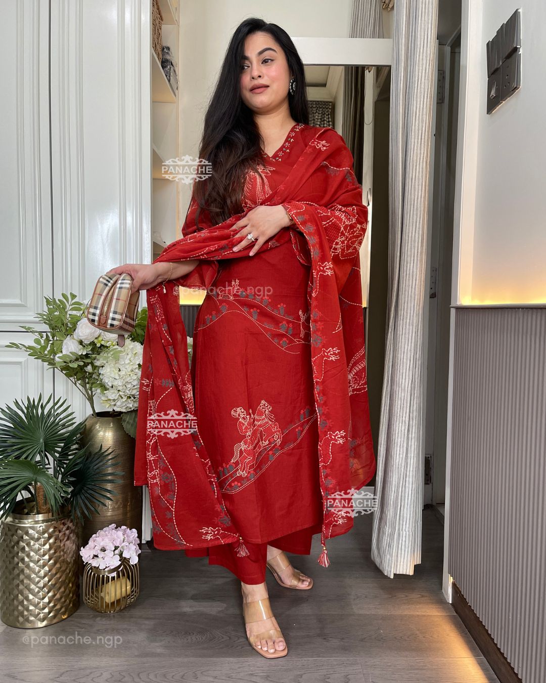 🟣 Detailed neckline with delicate placement print on kurta and dupatta teamed with pocket plaso